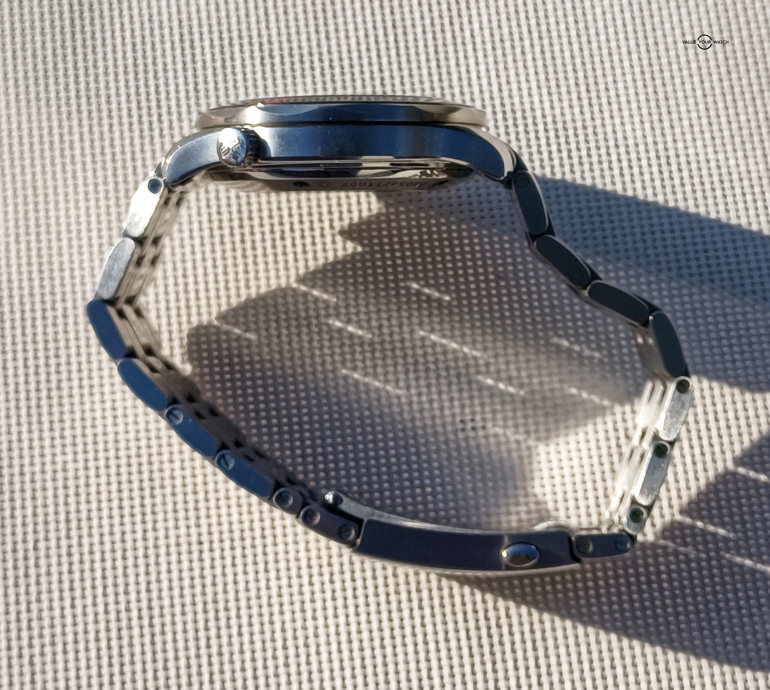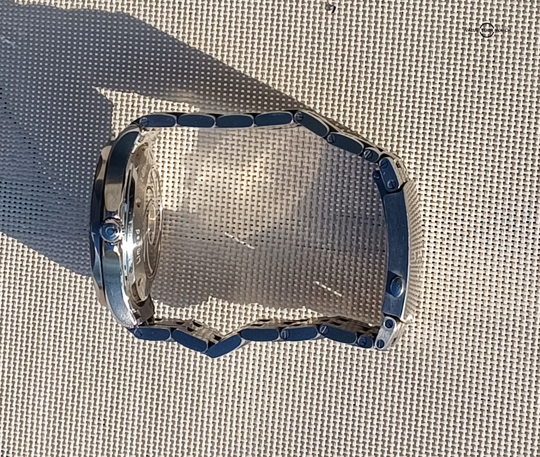 This is a stunning watch with triple box and papers and several extra link. Sized to fit a large wrist, probably 7 to 7.75 in. with the extra link. Please see pictures for exact condition of watch. Please contact me for references or any questions.