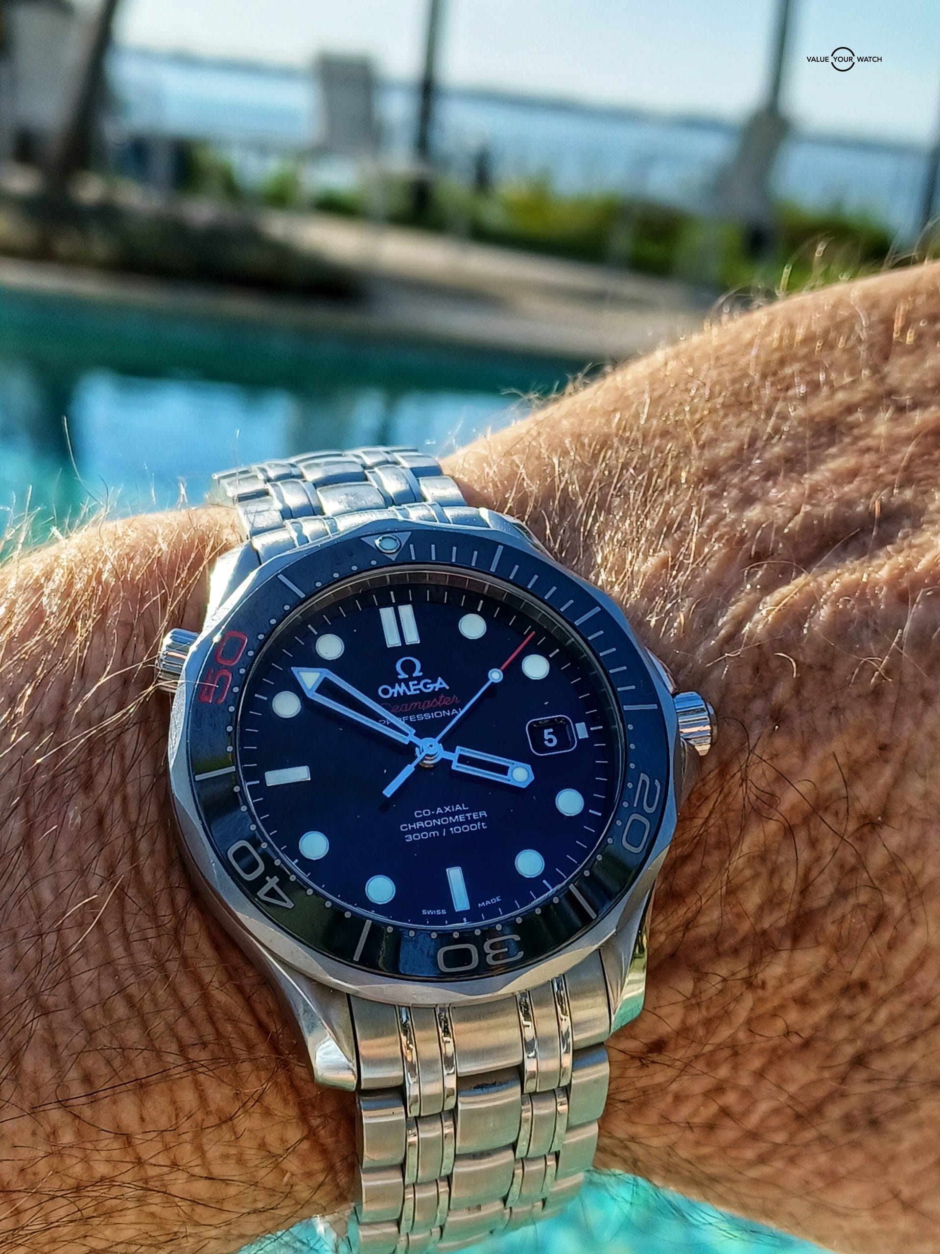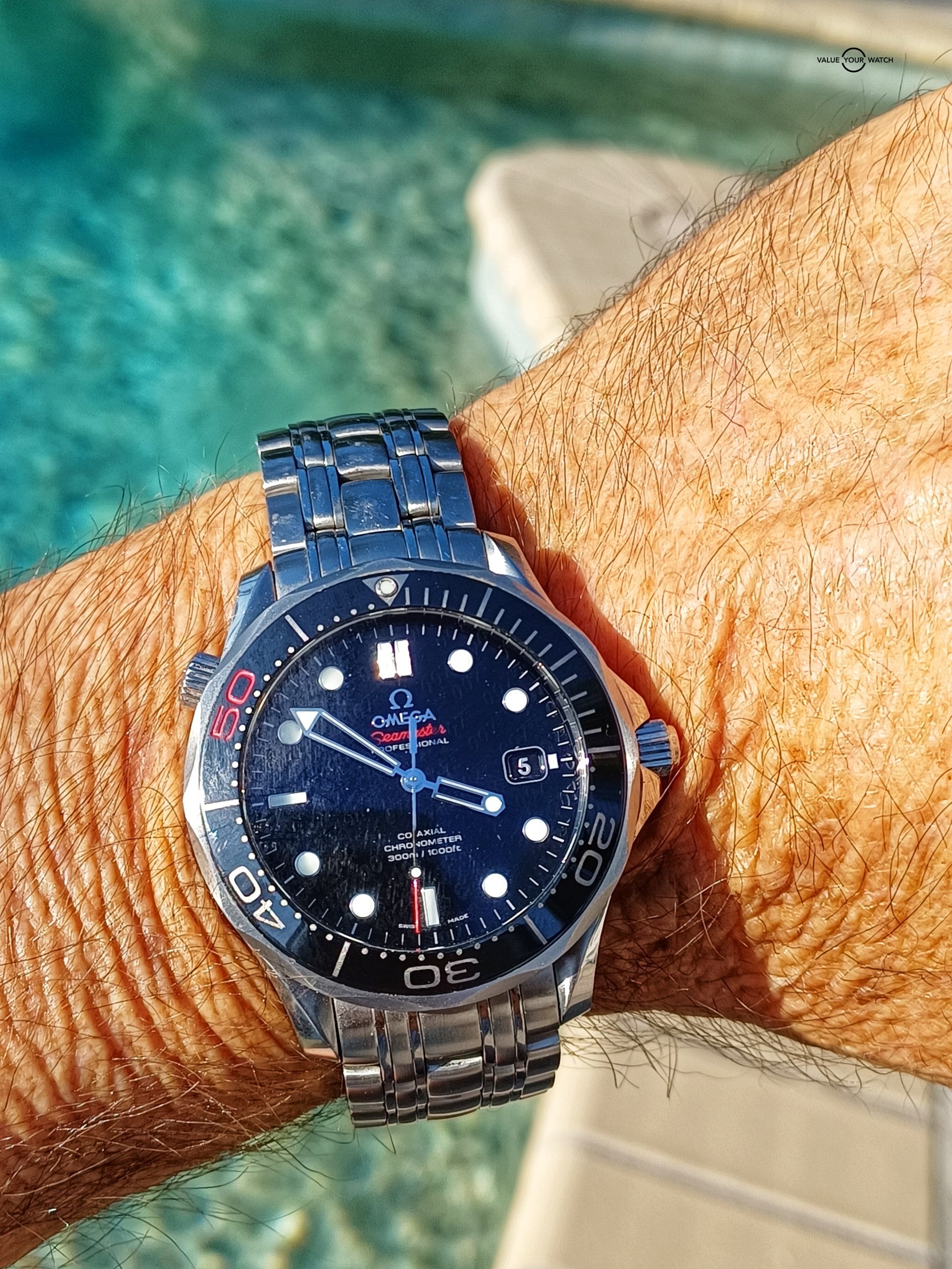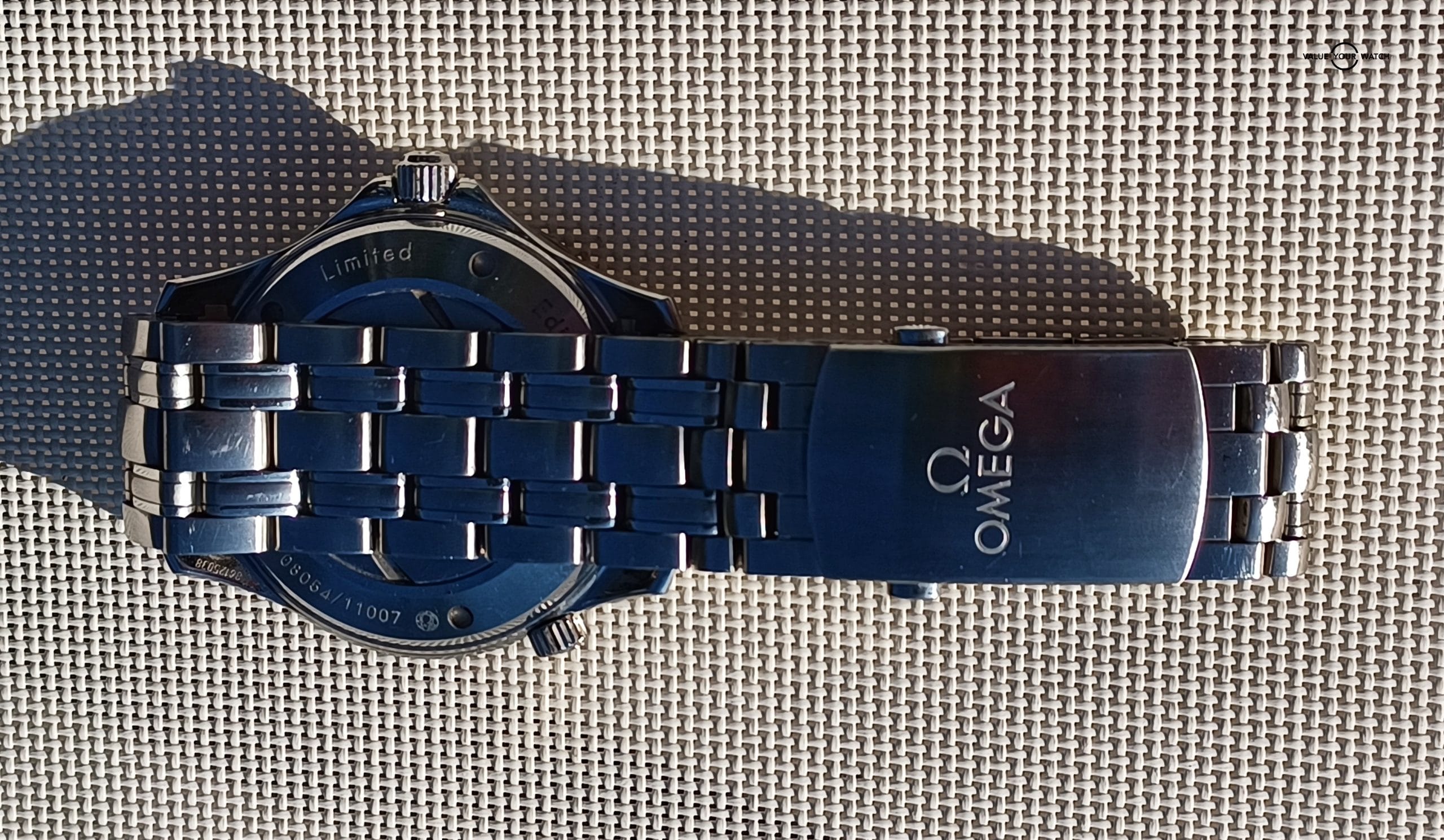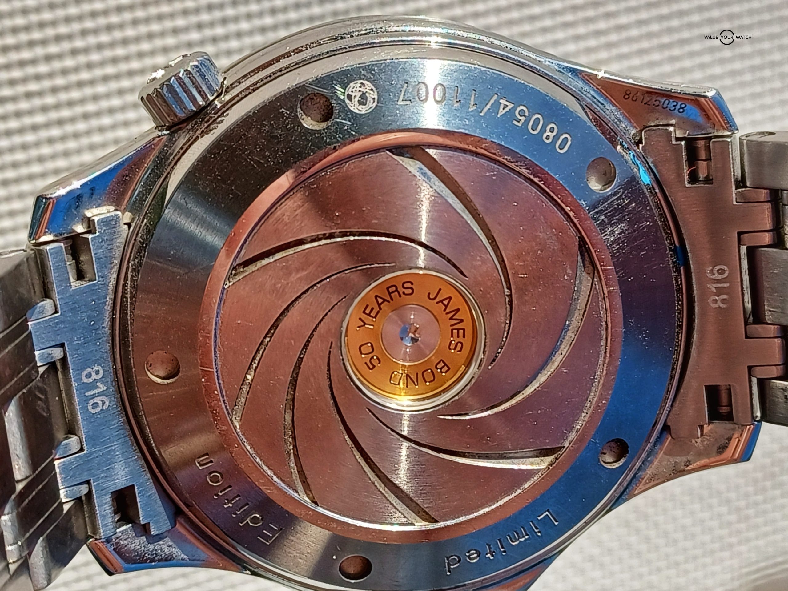 Limited Edition James Bond 007 Omega Seamaster to commemorate the 50th anniversary of the first appearance of James Bond in a movie. 300m dive watch with screw down crown and helium escape valve. Black dial with reflective 007 logo and diamond markers. Watch is in very good shape and doesn’t seem to have ever been polished. Seems to keep good time but to my knowledge has never been serviced.