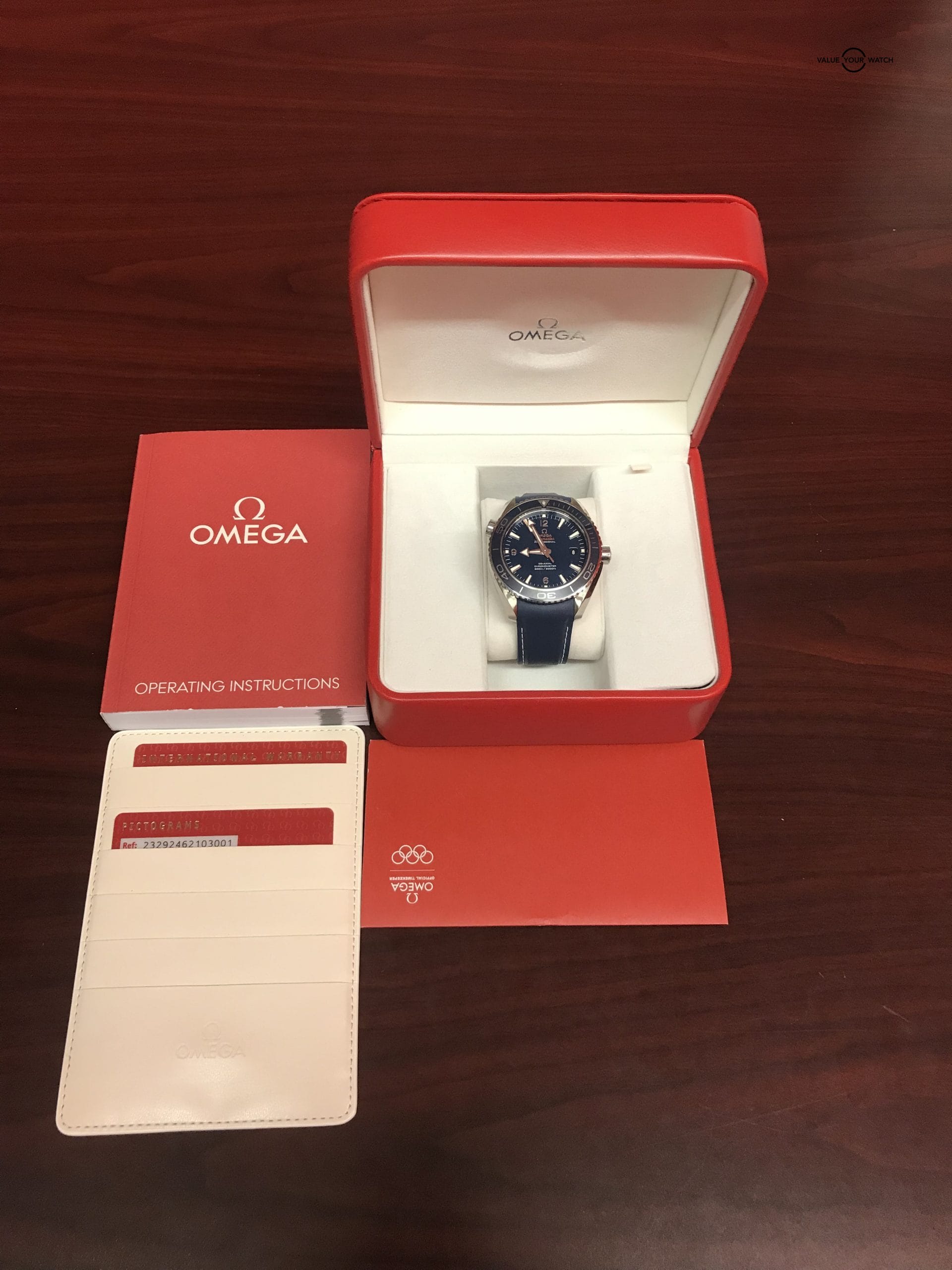 • Bracelet: Blue Omega strap with matching titanium deployant clasp (has minor usage signs, see photos)