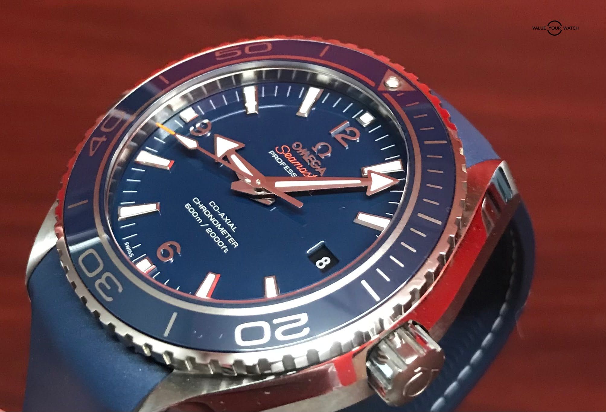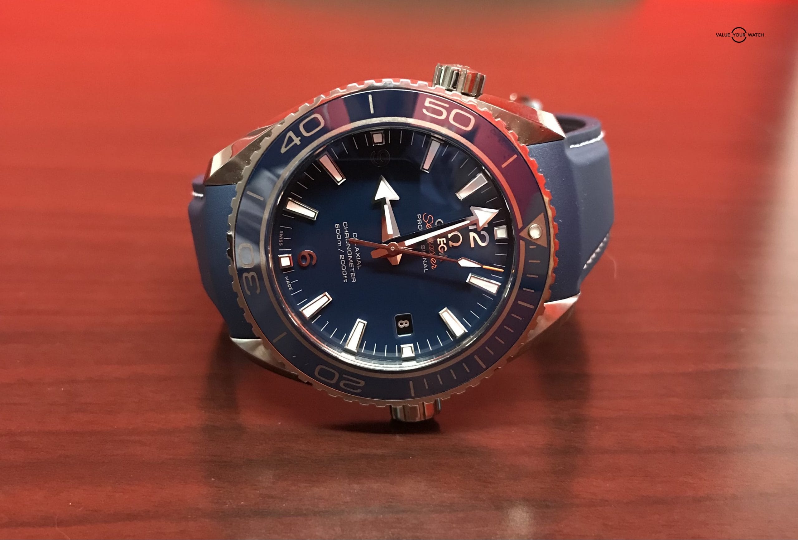 • Dial: Blue with Orange Seamaster text, seconds-hand tip
