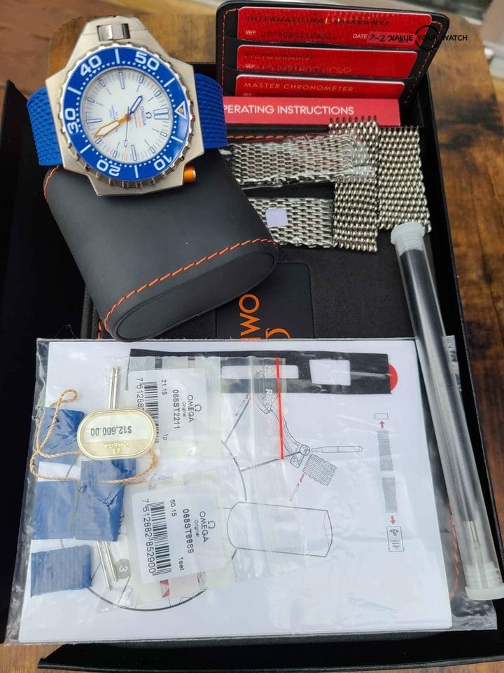 This is a complete set coming with everything that you would receive from the AD when purchased new: Outer Omega Box, black inner dive case, omega strap changing tool, operating manual, warranty/pictogram/master chronometer cards, extra spring bars, hangtag, strap changing instructions.