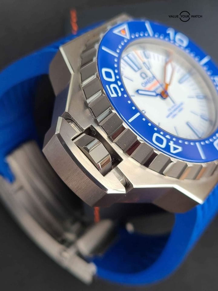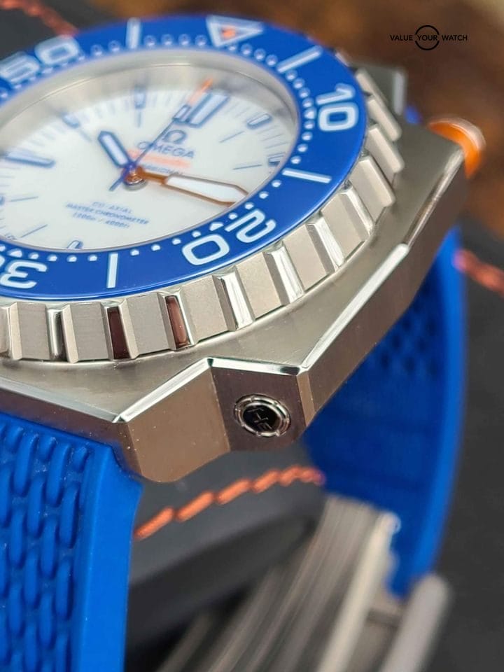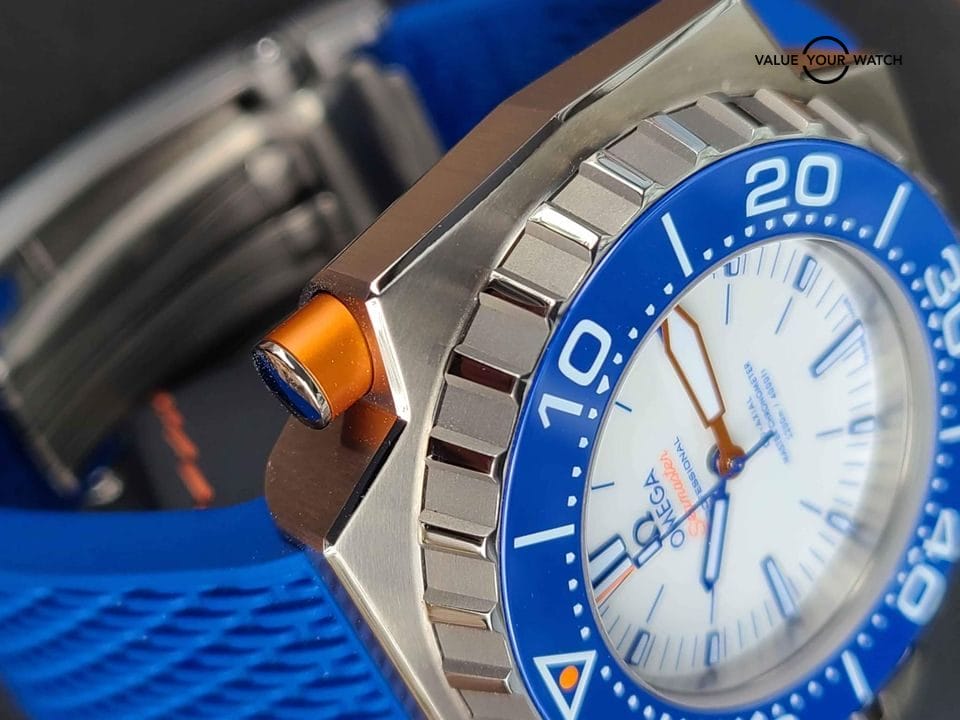 The Ploprof is Omega’s bold, unique and badass diver watch. With a long history, this new model Ploprof has a titanium case, making this watch extremely light compared to its size; an electric blue ceramic bezel ring that is scratch resistant, and the markers filled with Super-Luminova. The white dial with orange aluminum and varnished blue hands make it very easy to read.