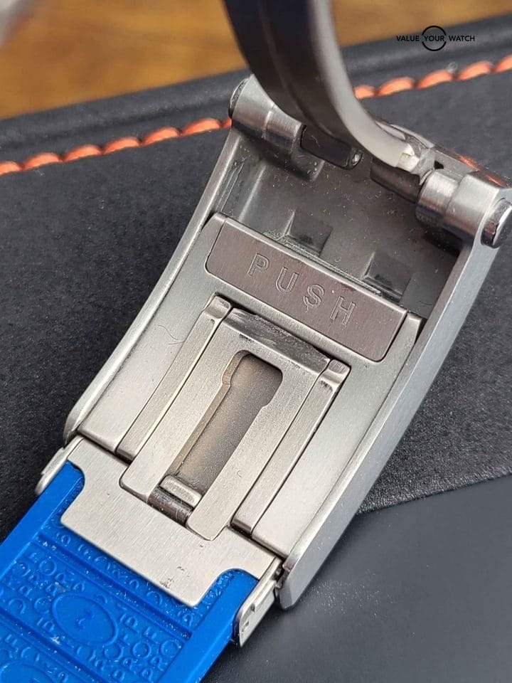 This watch is in mint condition and was purchased in 2021. The blue rubber strap has been cut but will still fit a very large wrist and can be cut to fit a smaller one; having the push-button clasp extender really comes in handy to give or shorten the length. The mesh bracelet comes in various sizes to make sure any wrist can wear this watch. It is also very light on the wrist and will fit perfectly because of its flexibility.