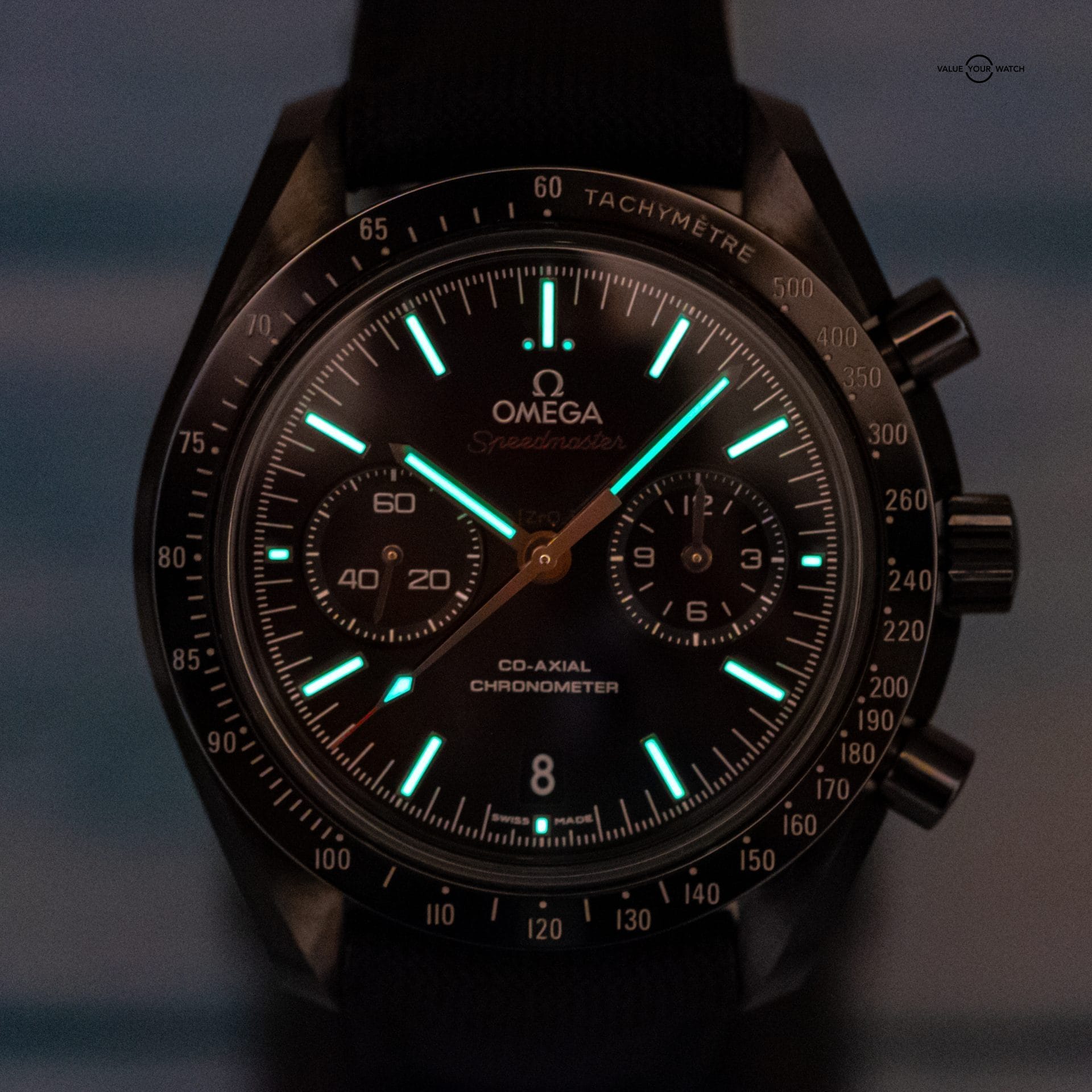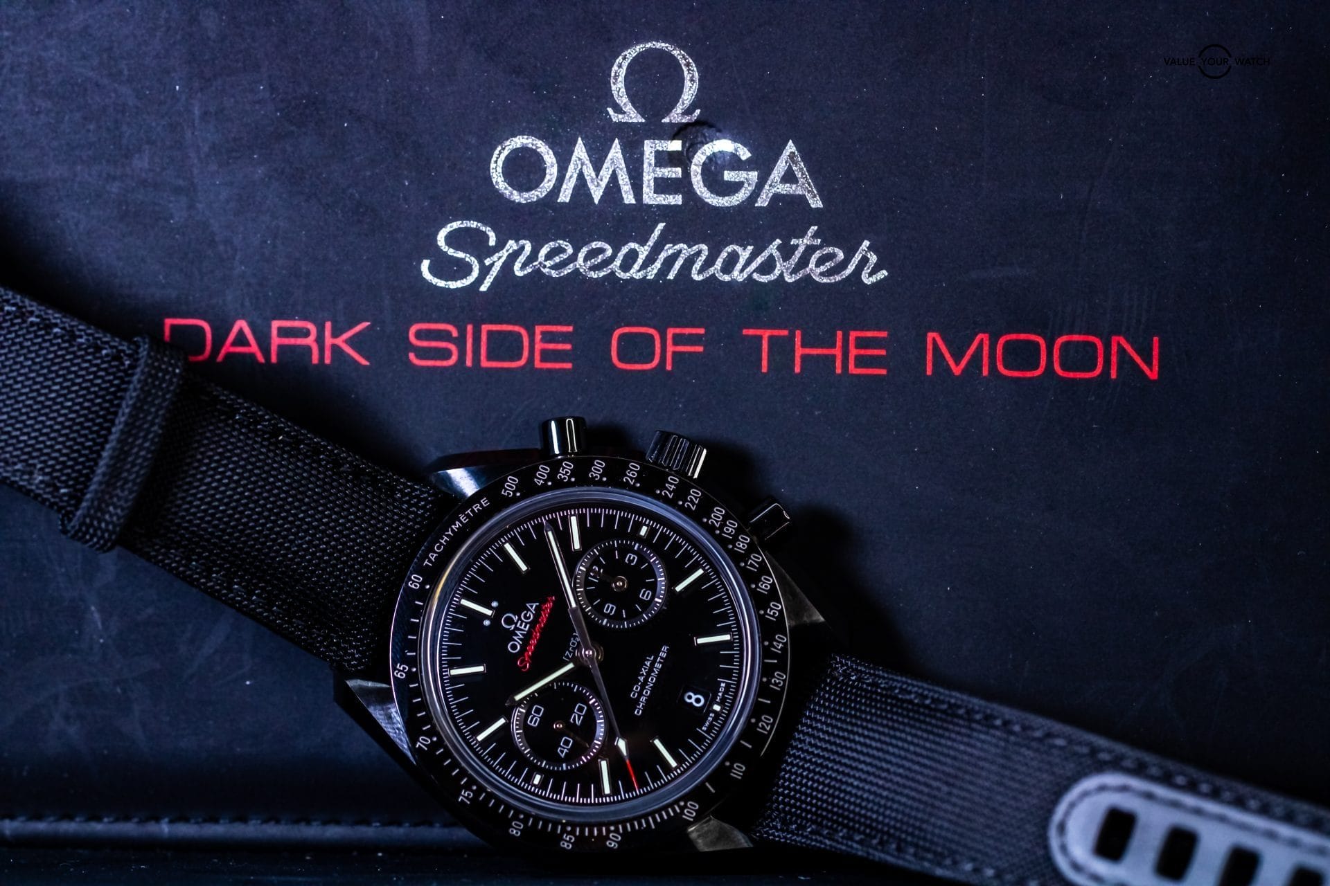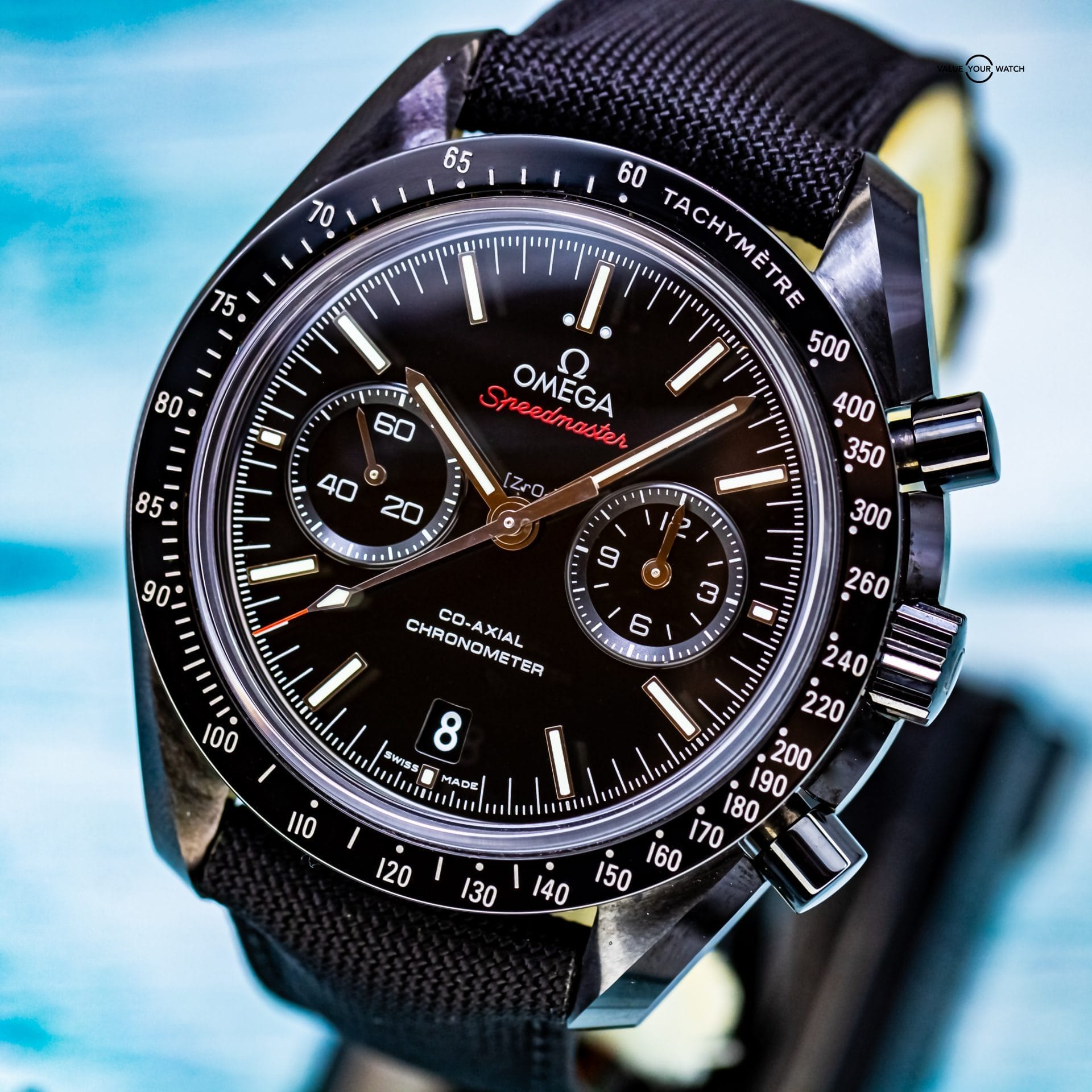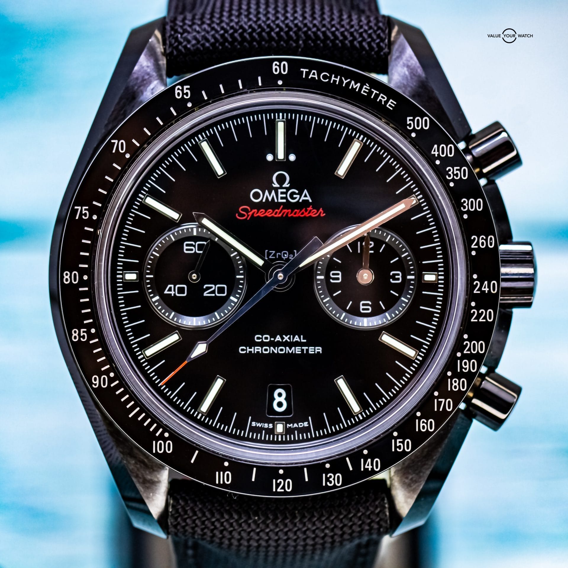 Presenting the Omega Speedmaster Dark Side Of The Moon. The one and only original that began the “Dark Side” line. What’s not to love about this timepiece? It has a case and bezel crafted from ceramic, making it extremely light and scratch resistant. The Cordura fabric strap is not only comfortable, but feather light and adds to the black aesthetic. The co-axial 9300 movement is on full display thanks to the exhibition caseback. The moonwatch style hands feature 18K white gold, and the zirconium oxide ceramic dial is mesmerizingly dark.