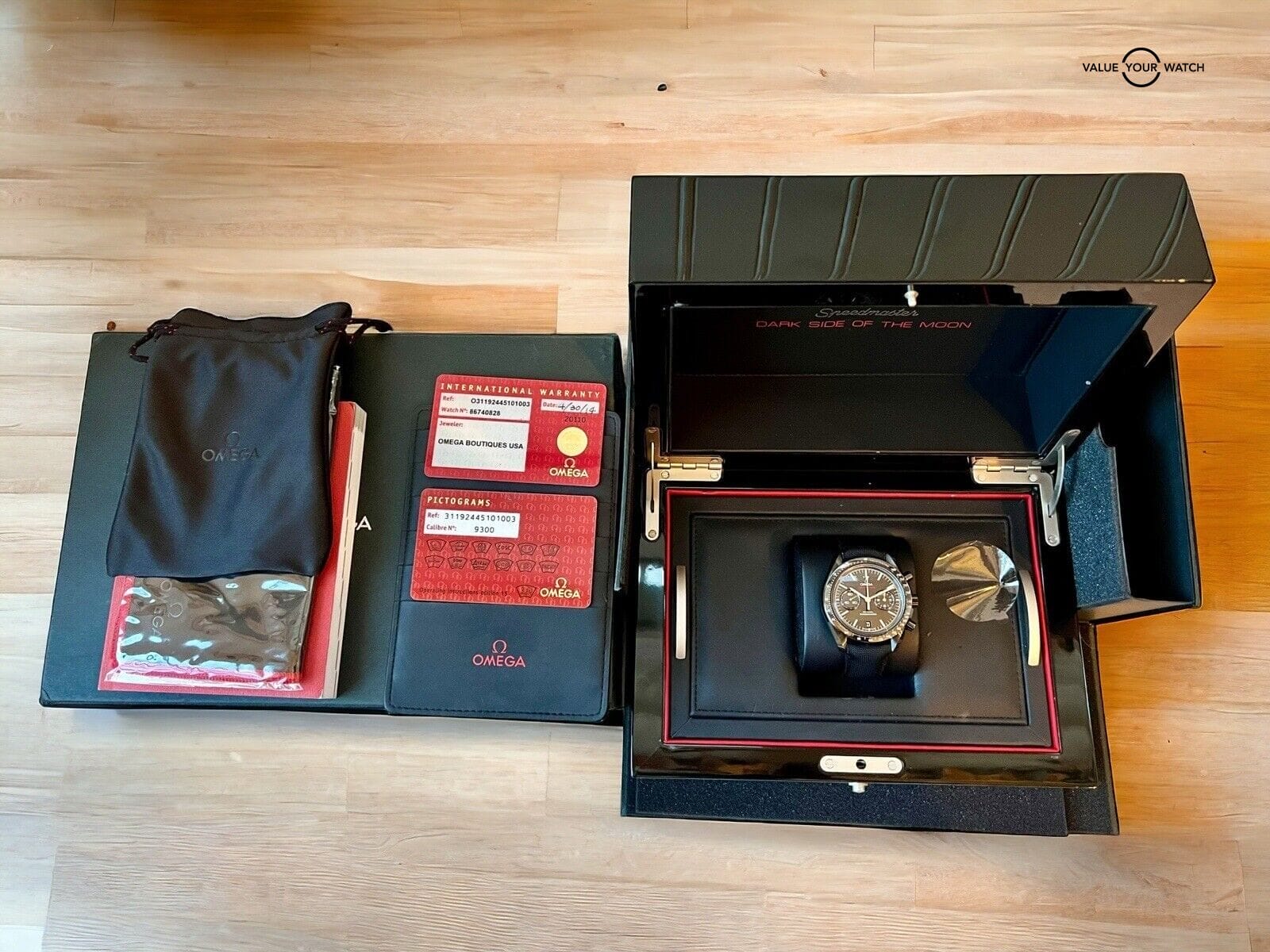 This OMEGA Speedmaster Dark Side of the Moon features a black ceramic case and two-piece strap with deployant clasp. It features a black dial with baton indexes and a tachymeter bezel. The watch has a Co-Axial escapement and is water-resistant up to 50 meters. It has a self-winding mechanical movement with a chronometer and chronograph function, as well as a date indicator. The watch comes with its original box and papers and has a reference number of 311.92.44.51.01.003.