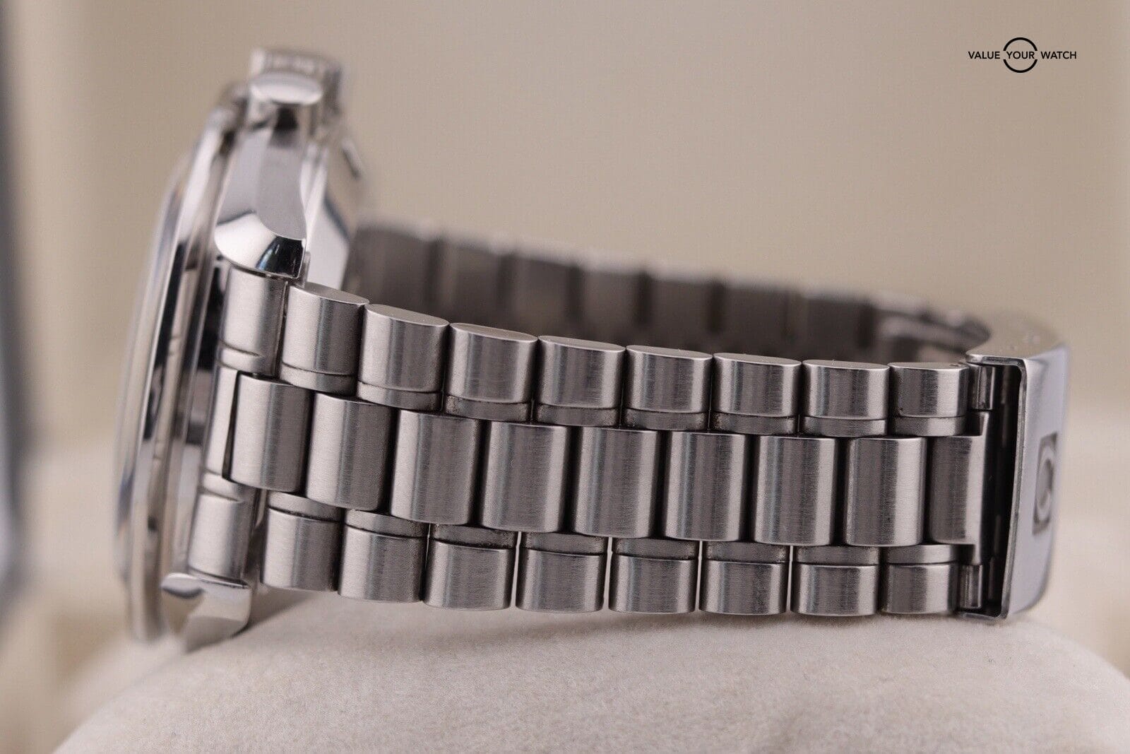 – Overall Good shape for this model. The Hesalite crystal has a couple dull scratches that could be worked out with polywatch. No etching in center of crystal so likely a replacement. Omega service hands as well. Bezel ring is in good shape with no major crack/dings. Case/Bracelet/Clasp only have minor marks — a polish should take care of most, but didn’t want to touch the sharp edges of this case. Watch runs and functions as it should. See pics