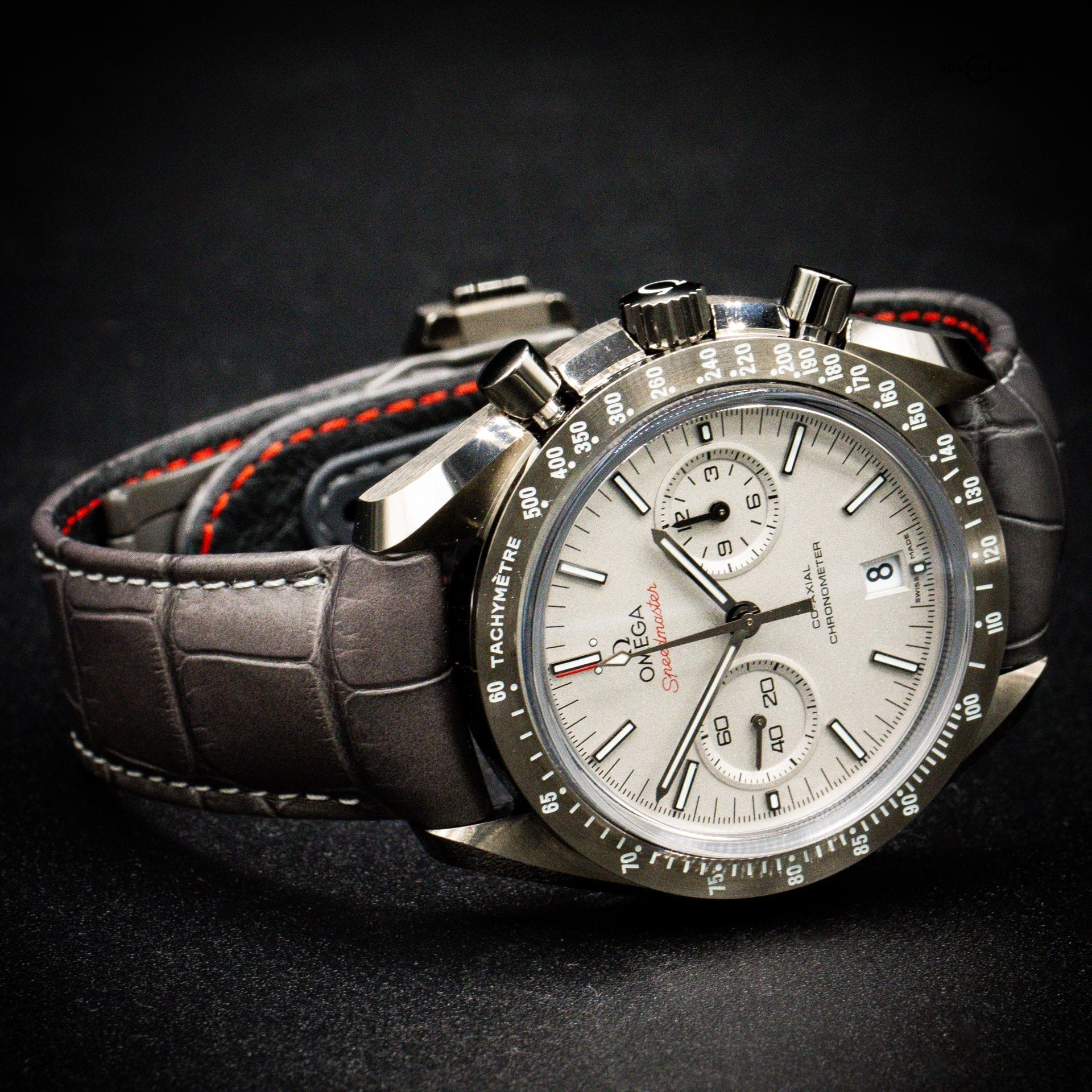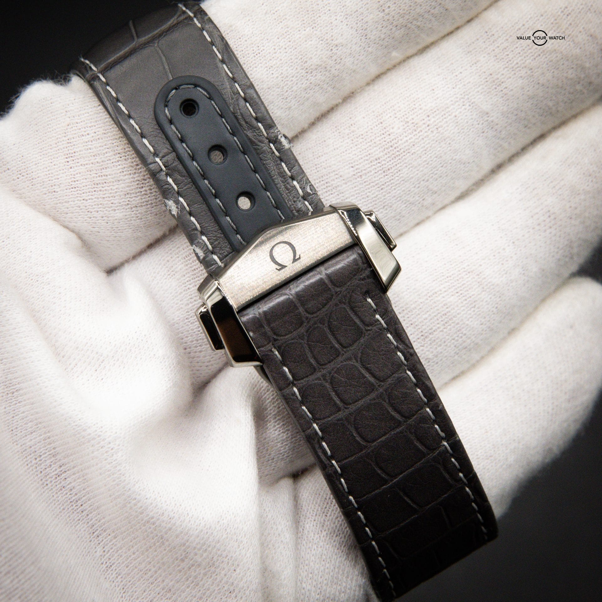 The grey dial showcases sword-shaped hands and stick hour markers, accompanied by two sub-dials at 3 o’clock and 9 o’clock, as well as a date window at 6 o’clock. With a water resistance of 50 meters, it can endure minor water exposure.