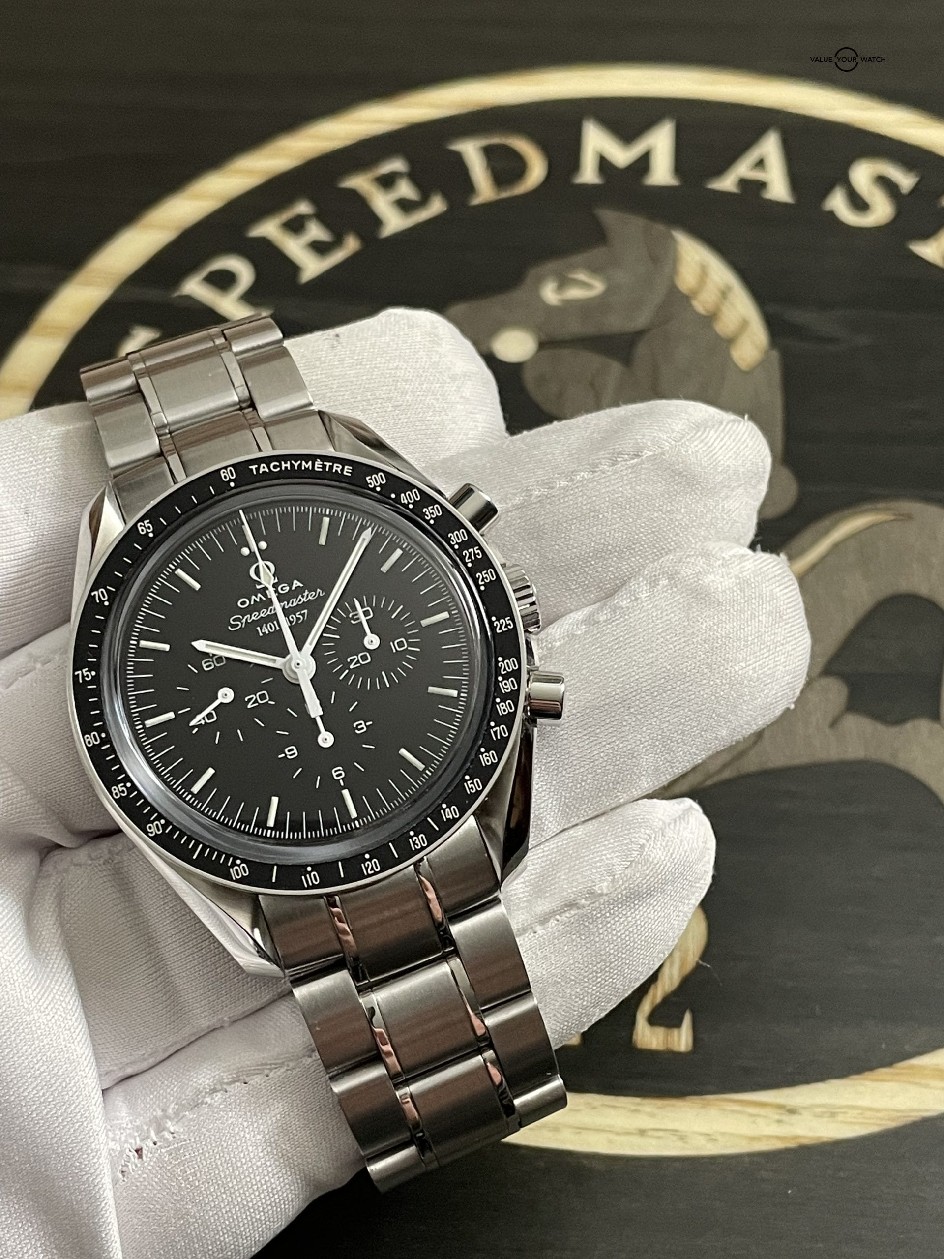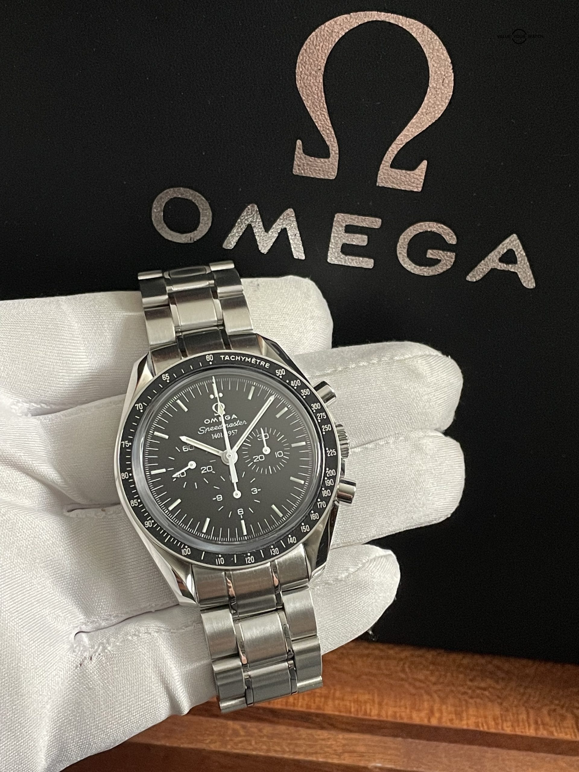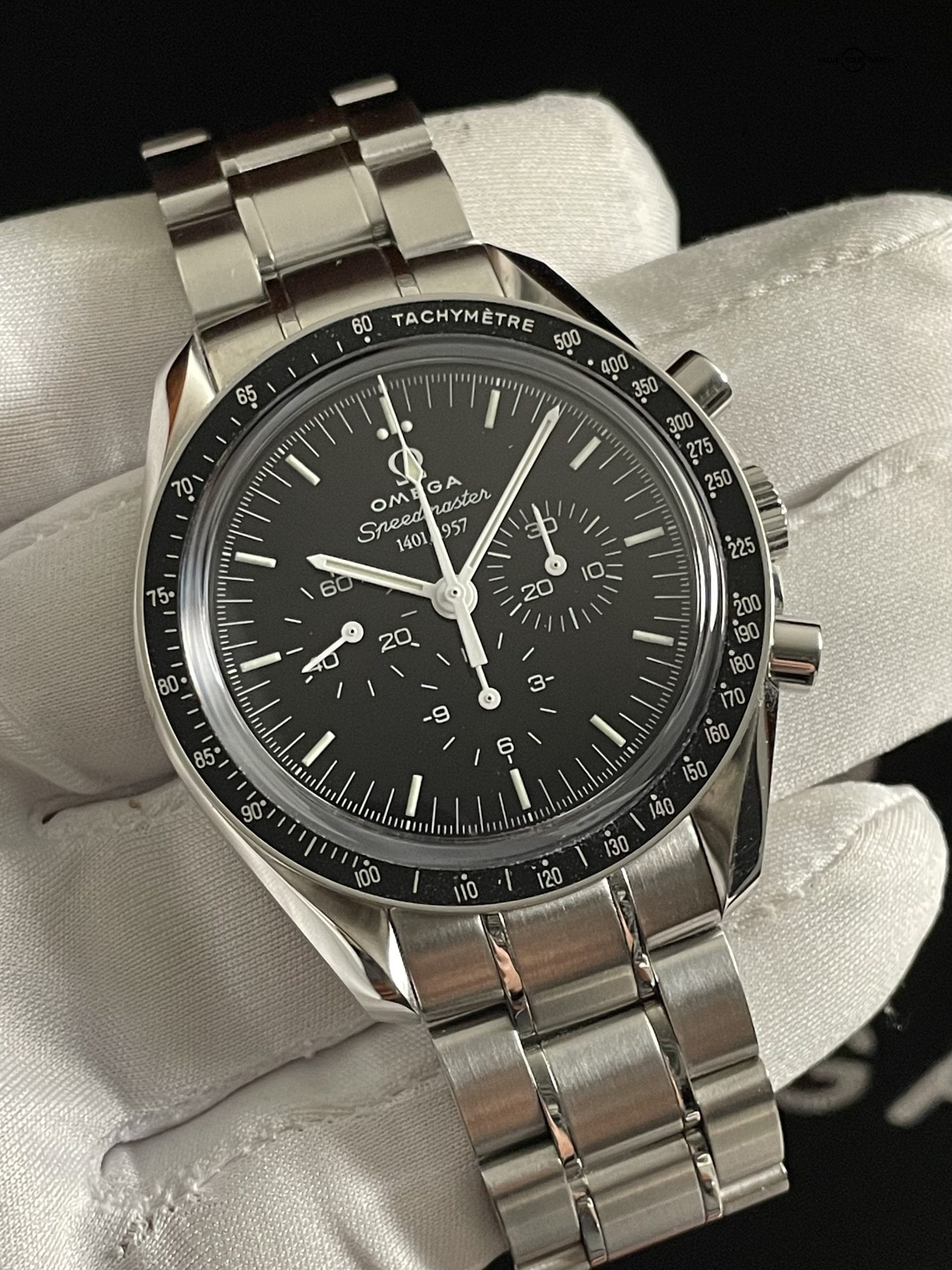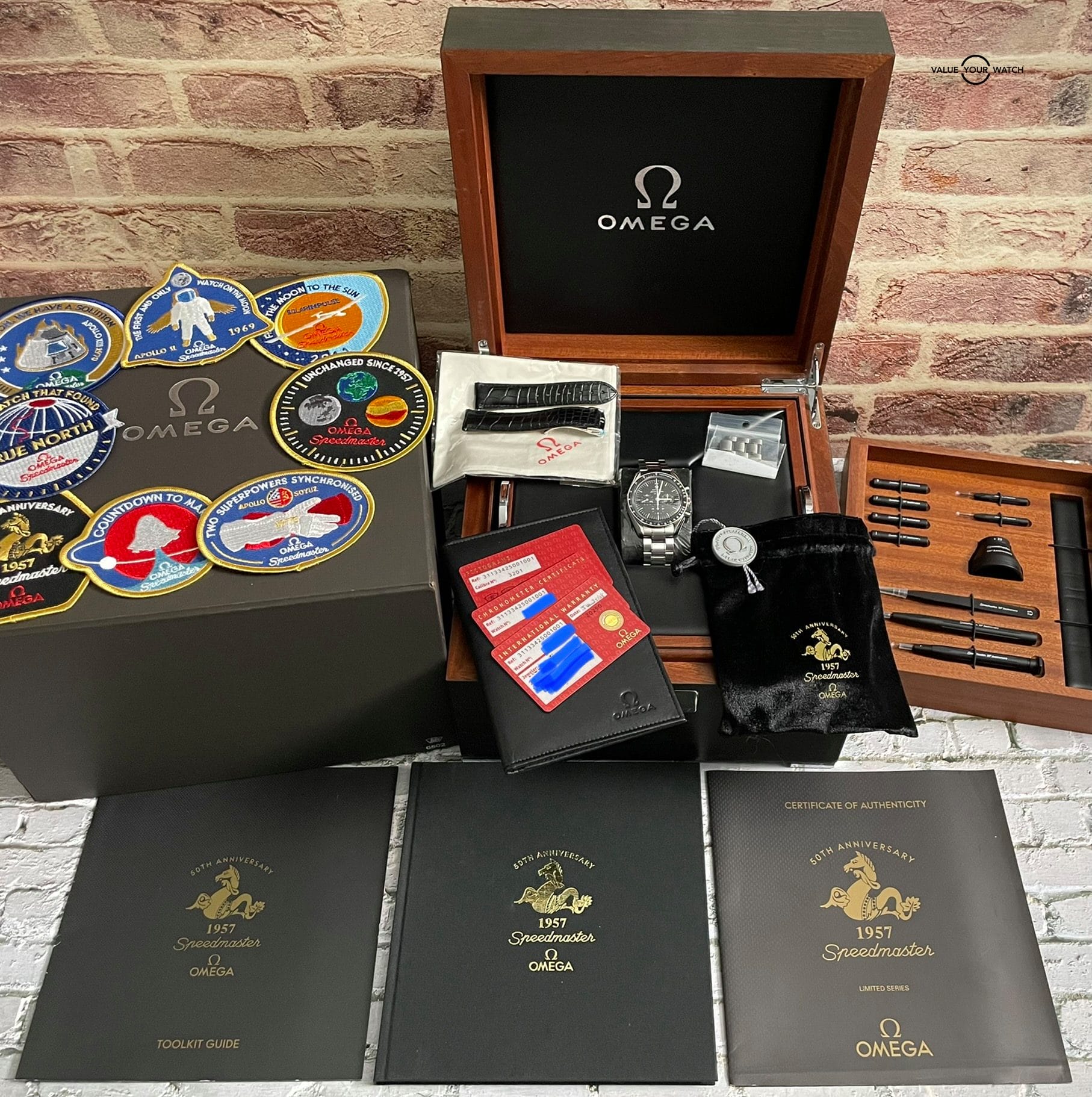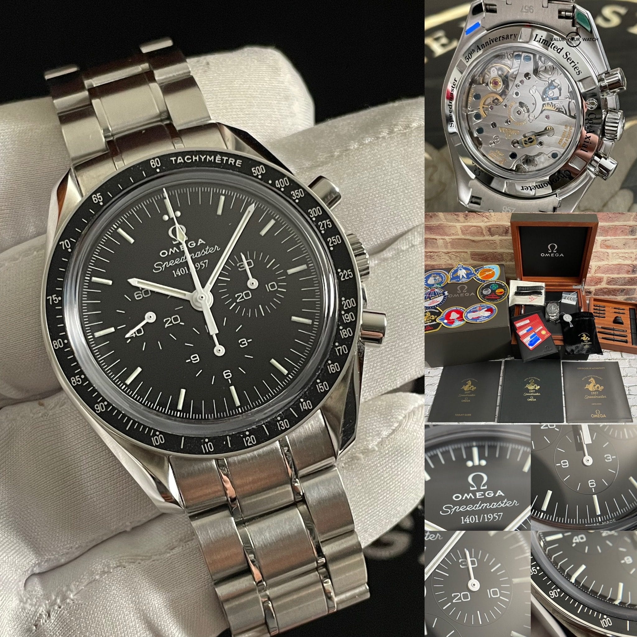 The one and only 50th Anniversary Moonwatch…and a great example of a well-cared for full collectors set! You get the beautiful and unique enamel dial with the numbered 1401 of only 1957 made, and even that vintage Omeaga logo! The sapphire crystal and caseback sandwich together the just as unique manual wind co-axial 3201 movement. Comes with the coolest Speedmaster collector box with all of the Speedmaster tools, books, accessories and even all of the lunar mission patches. A true must have for any Speedmaster collector…and one of the best looking Speedmaster dials around!