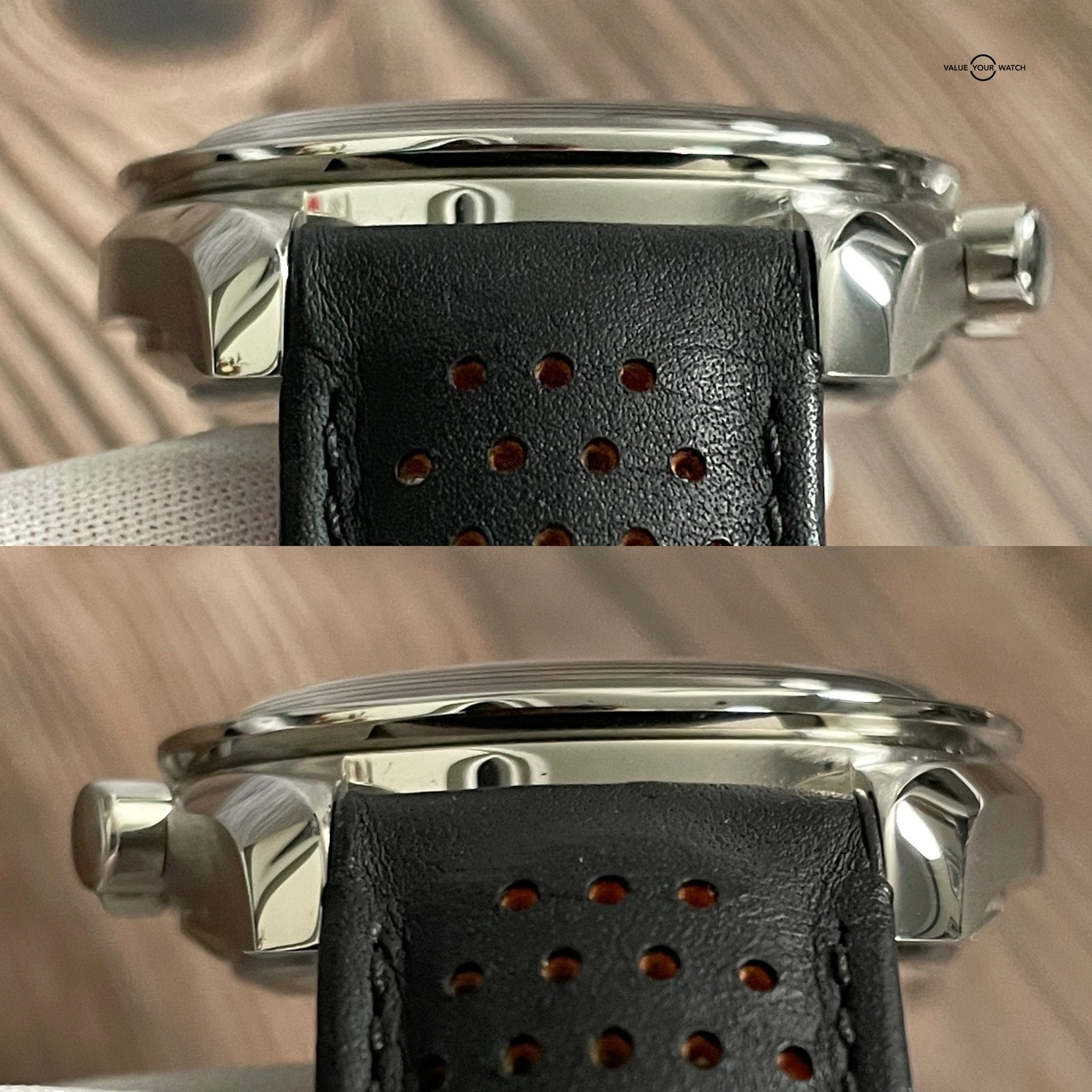 This racing version of the famous Speedmaster, with its iconic orange on black dial, racing style minute track and ceramic tachymetre bezel, is one of our favorite Chronographs out there! This watch was designed for automotive and racing enthusiasts, yet still giving some of the feel of the iconic Speedmaster Moonwatch. Very versatile, it can be worn casual or dressed up. This piece also has an open case back to allow you to enjoy the beautiful Omega 9900 master chronometer column wheel chronograph movement with time zone jumping hour hand…the best Omega has to offer today.