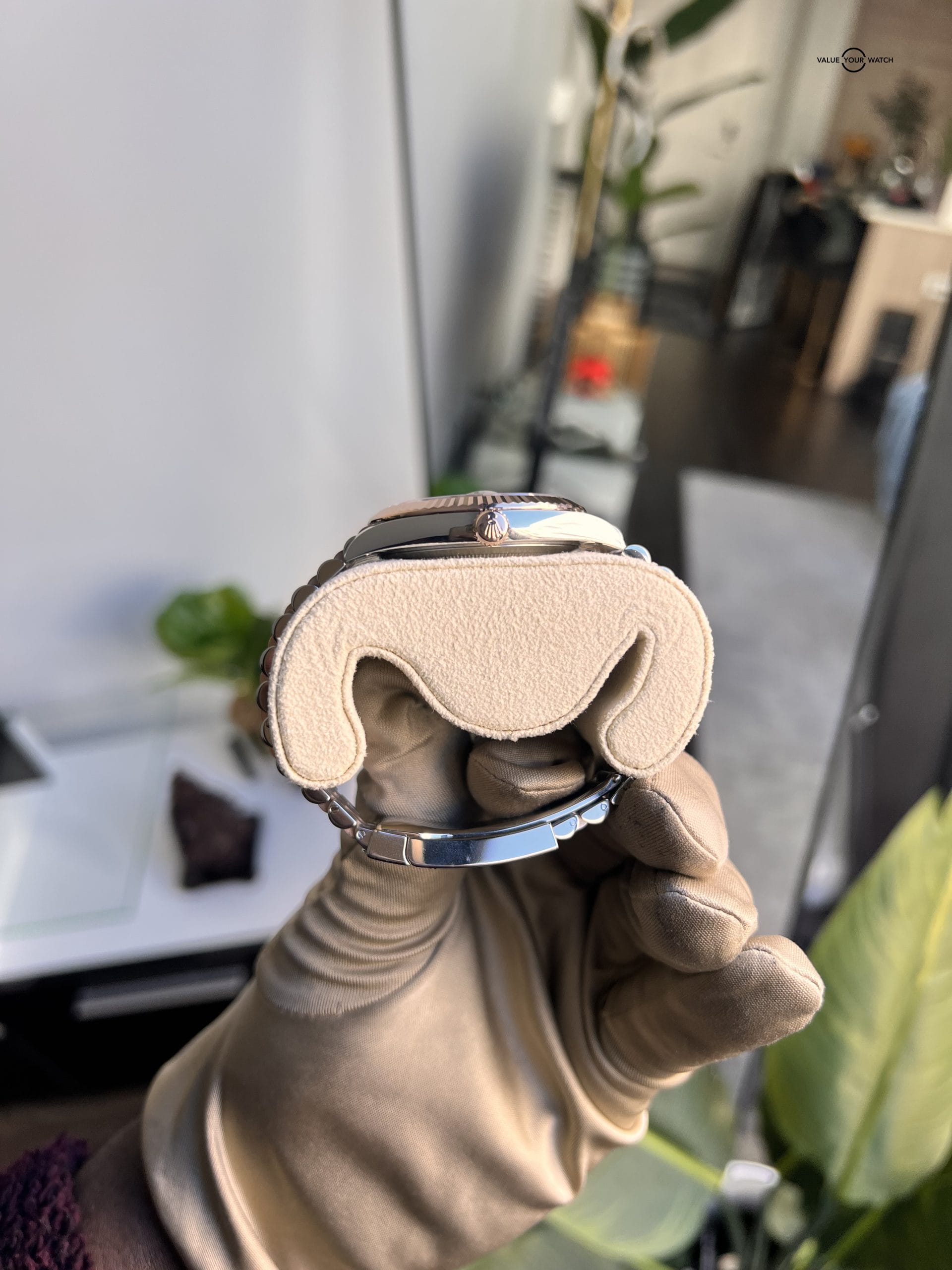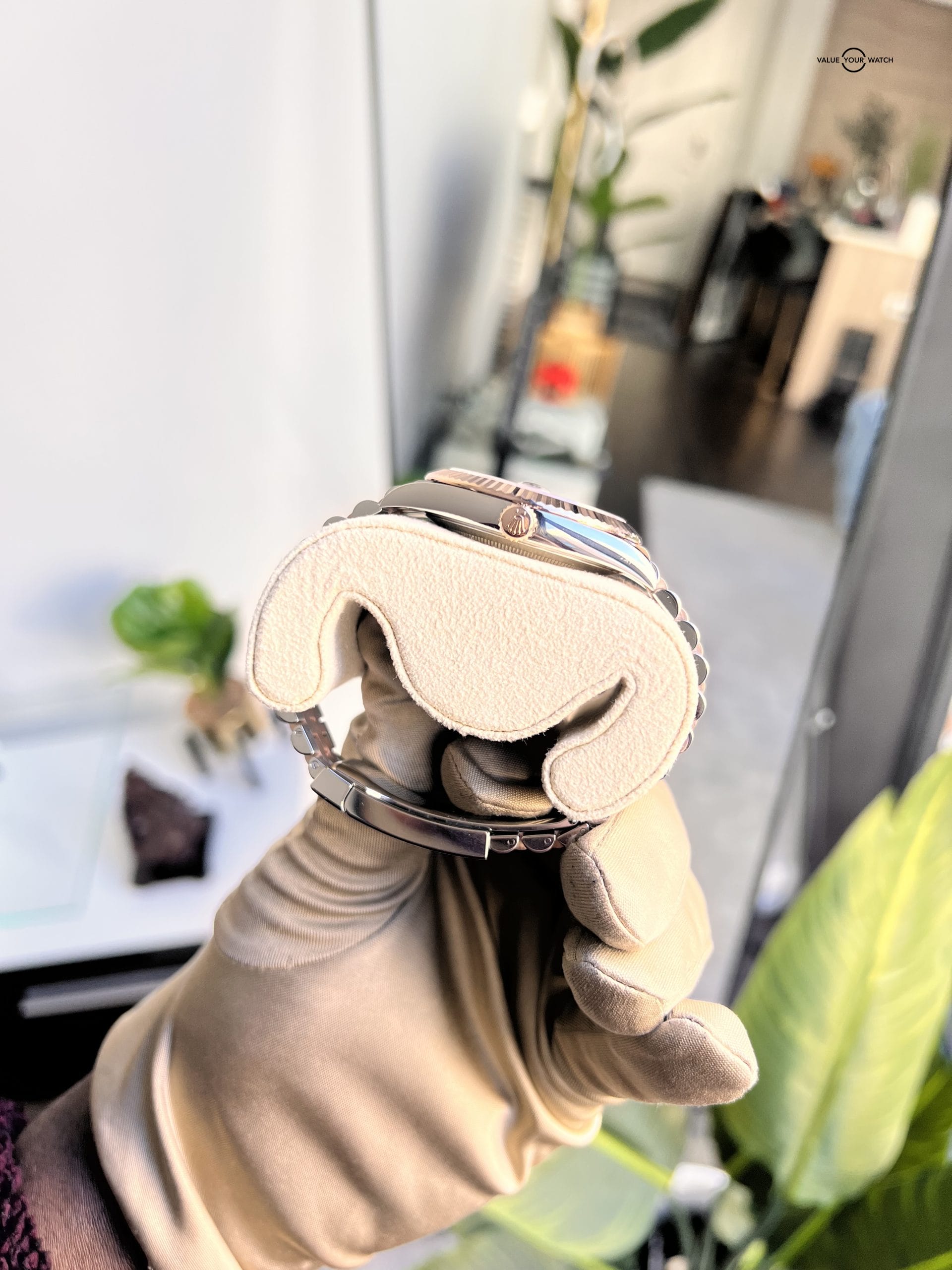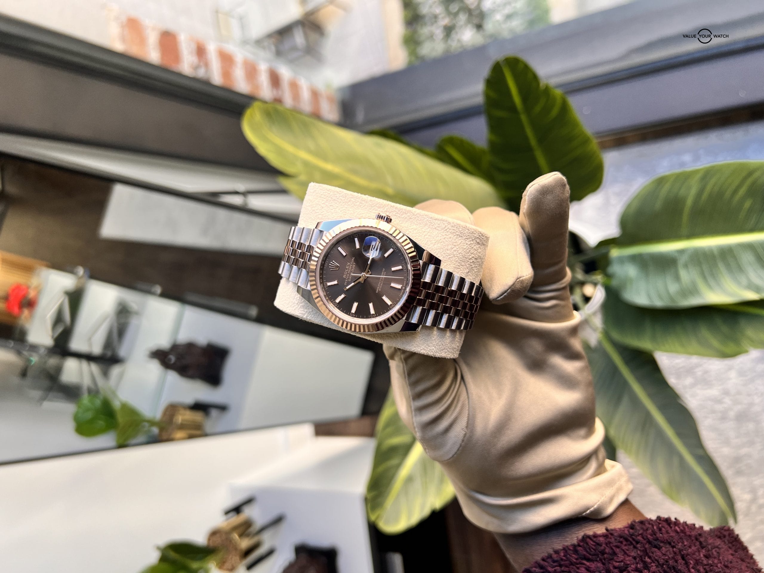 Pristine condition Datejust 41mm in Rose gold. One of the most coveted configurations in the Rolex Datejust lineup. This piece does not only have a lustrous and alluring chocolate dial but the rose gold bezel and parts of the bracelet makes it a perfect wrist candy.
