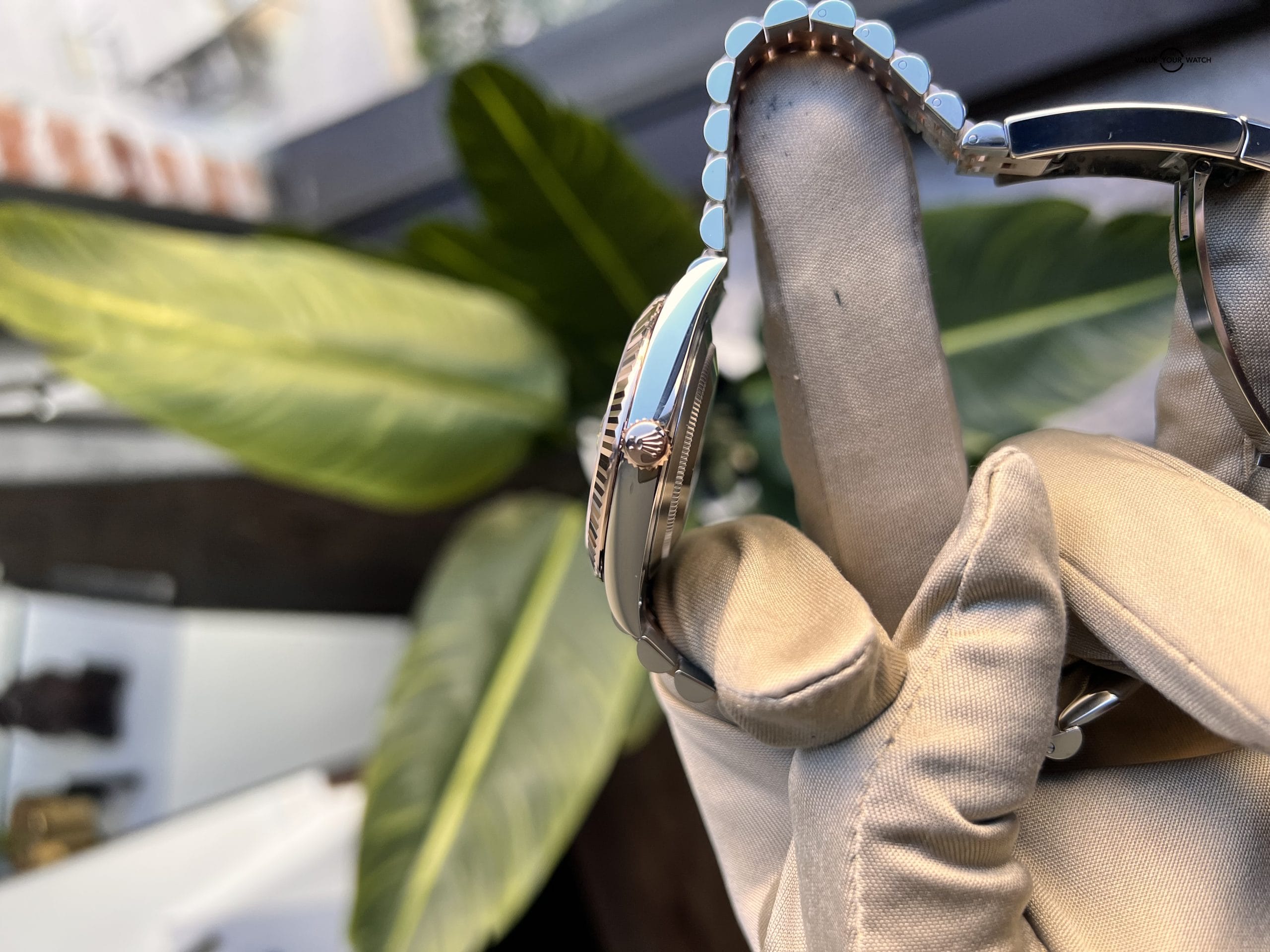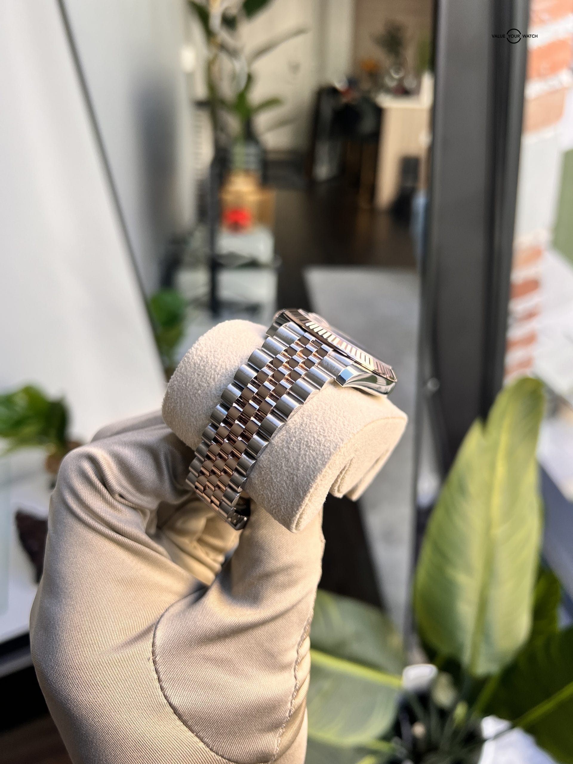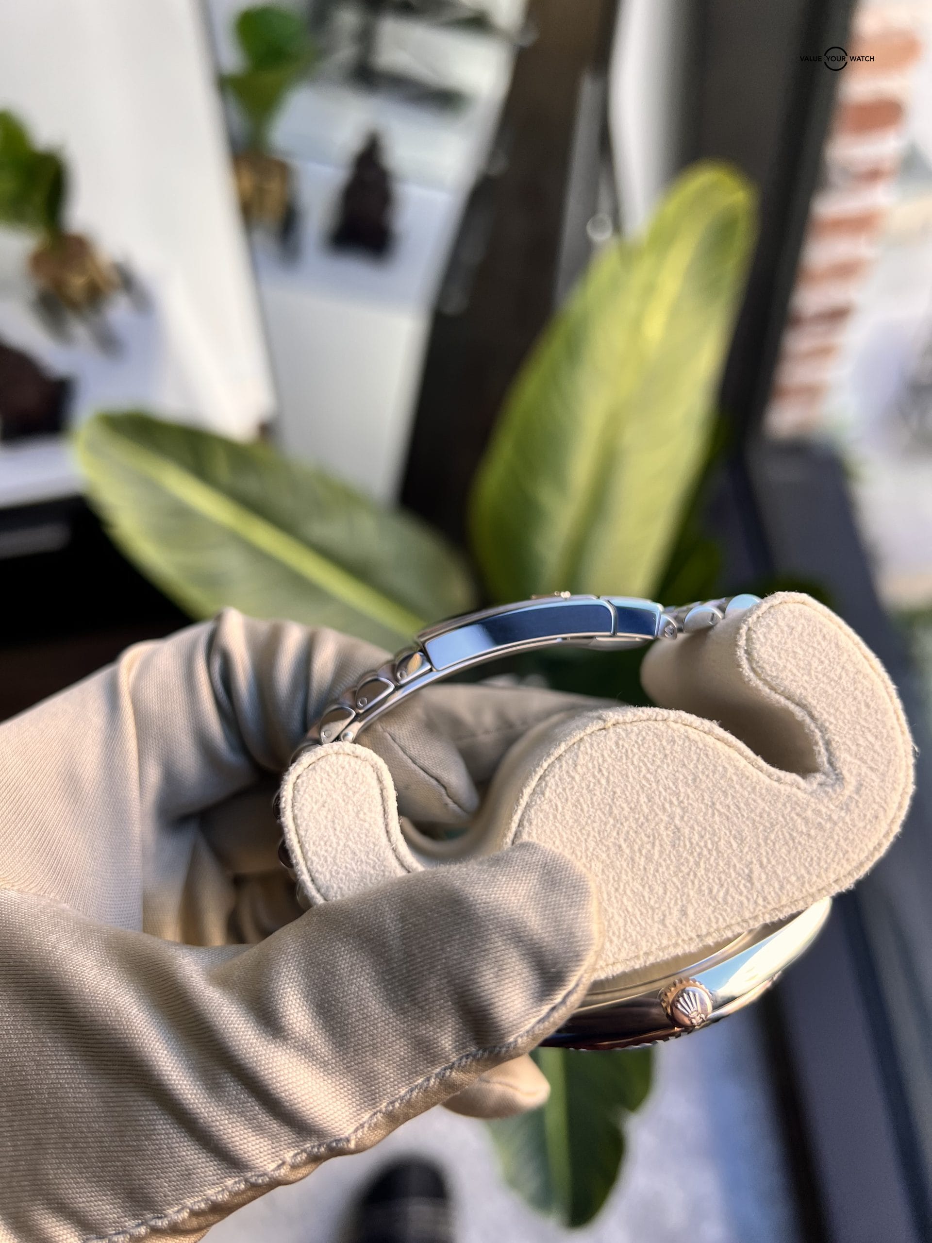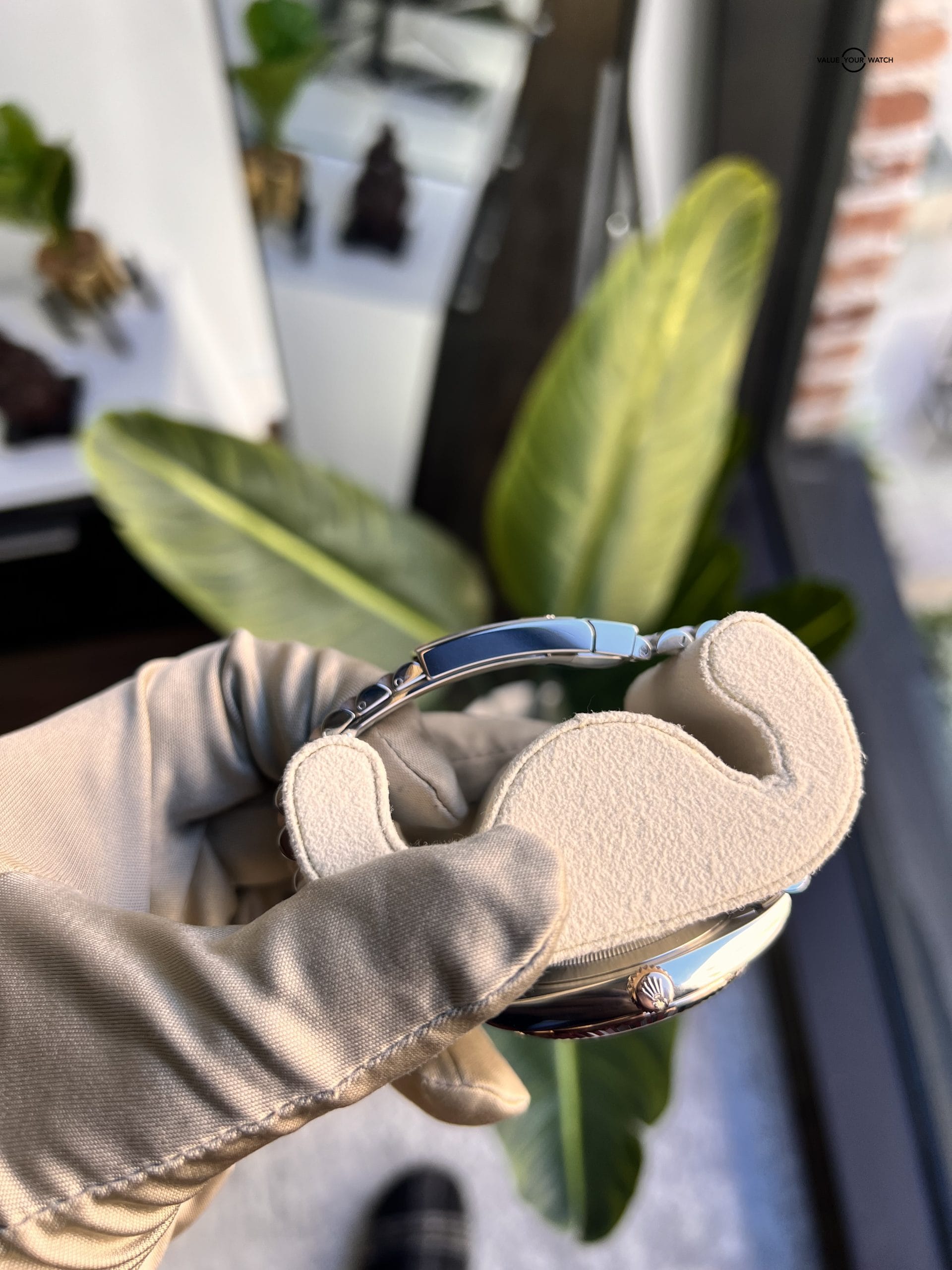 Pristine condition Datejust 41mm in Rose gold. One of the most coveted configurations in the Rolex Datejust lineup. This piece does not only have a lustrous and alluring chocolate dial but the rose gold bezel and parts of the bracelet makes it a perfect wrist candy.