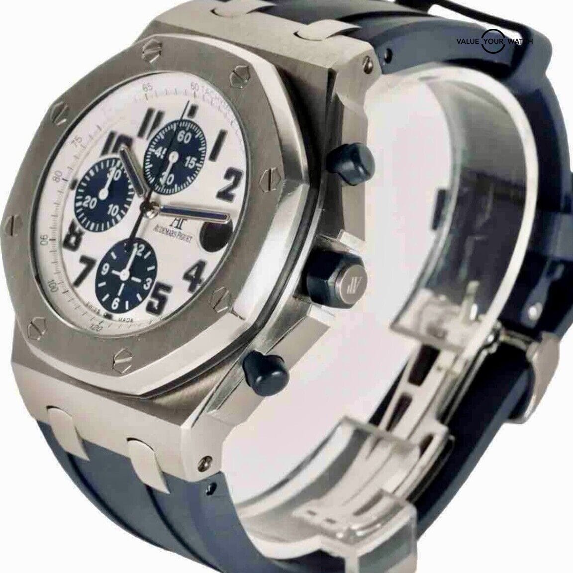 **eBay Listing: Audemars Piguet Royal Oak Offshore Chronograph 26170ST Navy 42mm****Item Condition:** Pre-Owned – This Audemars Piguet Royal Oak Offshore Chronograph is in excellent condition and includes the original box. **Product Description:** Immerse yourself in the elegance of the Audemars Piguet Royal Oak Offshore Chronograph. This exquisite navy 42mm model showcases an automatic movement, a striking white dial, and comes with the original Navy Blue AP band equipped with a locking clasp. A second, white rubber strap from Horus, complete with a buckle, is also included, providing versatility and a fresh look whenever desired.**Key Features:**- **Model:** Audemars Piguet Royal Oak Offshore Chronograph 26170ST- **Case Diameter:** 42mm- **Dial:** White- **Movement:** Automatic- **Band:** Original Navy Blue AP band with locking clasp and an additional white rubber strap from Horus- **Chronograph Function:** Ideal for timing sports events or managing schedules while traveling.- **Gender:** Unisex- **Year of Manufacture:** Not specified **Additional Information:**This Audemars Piguet watch combines timeless design with functionality, making it a splendid addition to any collection or a grand start to a new one. The dual-band options cater to both a classic and a sportier look, suited to various occasions. High-resolution photos of the watch are available in the listing, detailing the impeccable condition and craftsmanship of the timepiece. Please review these images to appreciate the beauty and state of the watch fully.**Seller’s Commitment:** I am dedicated to transparency and customer satisfaction. This watch is guaranteed to be authentic and comes as described. I am happy to provide more details or answer any questions you may have before purchasing. **Enhance your collection with this stunning Audemars Piguet Royal Oak Offshore Chronograph, a symbol of luxury and precision. Purchase with confidence!**