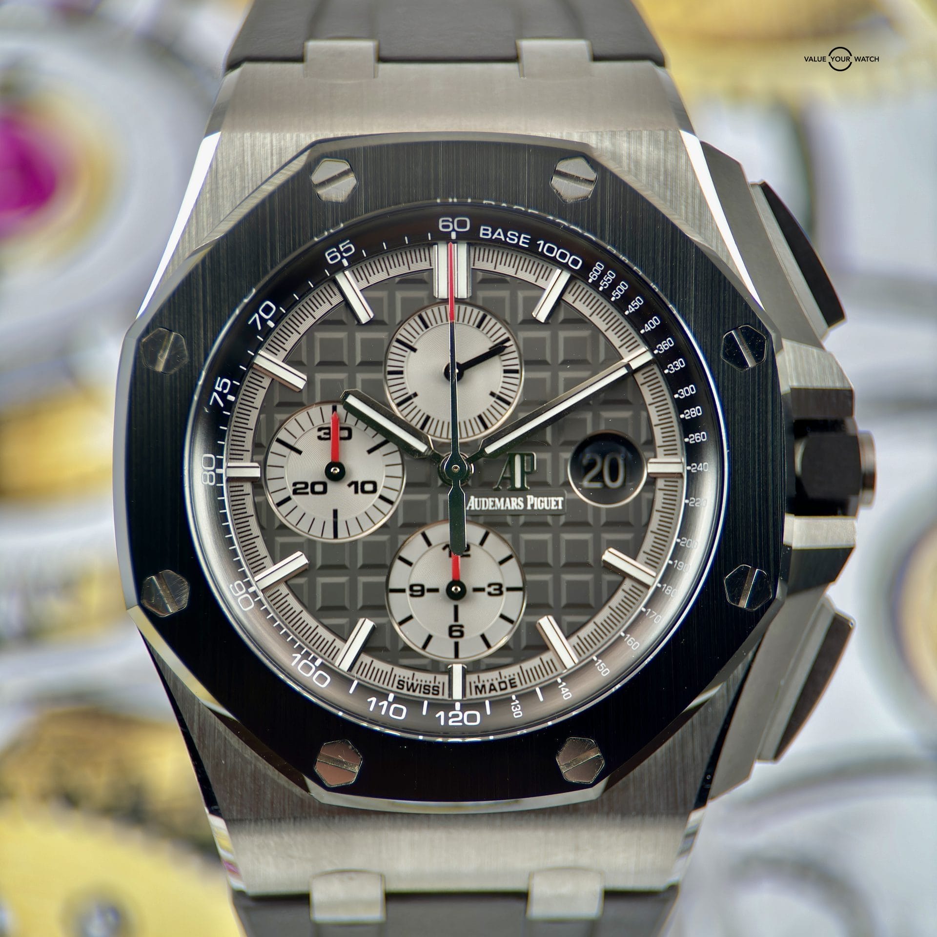 Introducing the Audemars Piguet Royal Oak Offshore Selfwinding Chronograph 26400IO.00.A004CA.01. The 44mm titanium case hosts a black ceramic bezel, slate dial and sub-dials with the iconic Méga Tapisserie pattern, and a date window at 3 o’clock. Luminescent white gold hand and hour markers work with the Sapphire glare-proofed crystal for optimal legibility in any condition. Styled on a grey rubber strap finished with ceramic pins for maximum comfort. This watch has a real physical presence that commands attention in a way only an Audemars can.