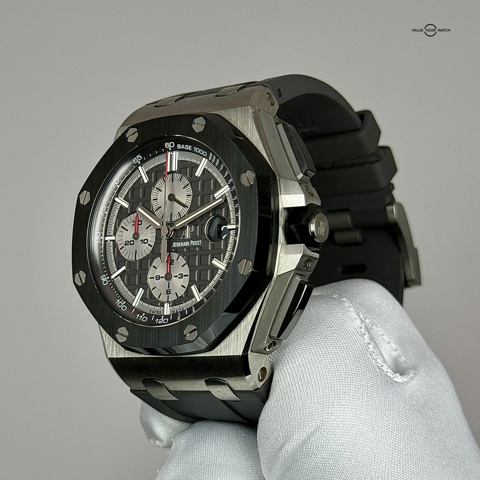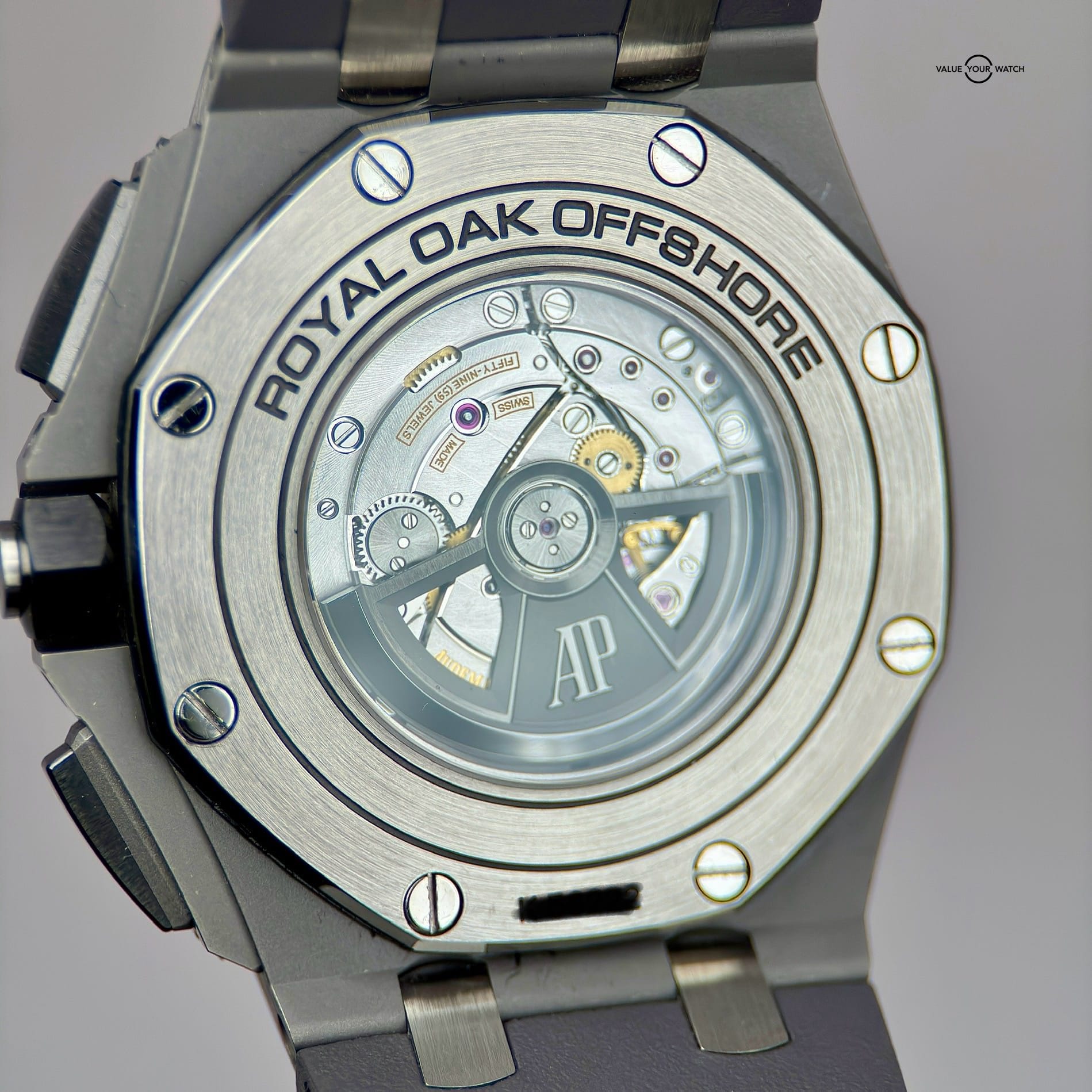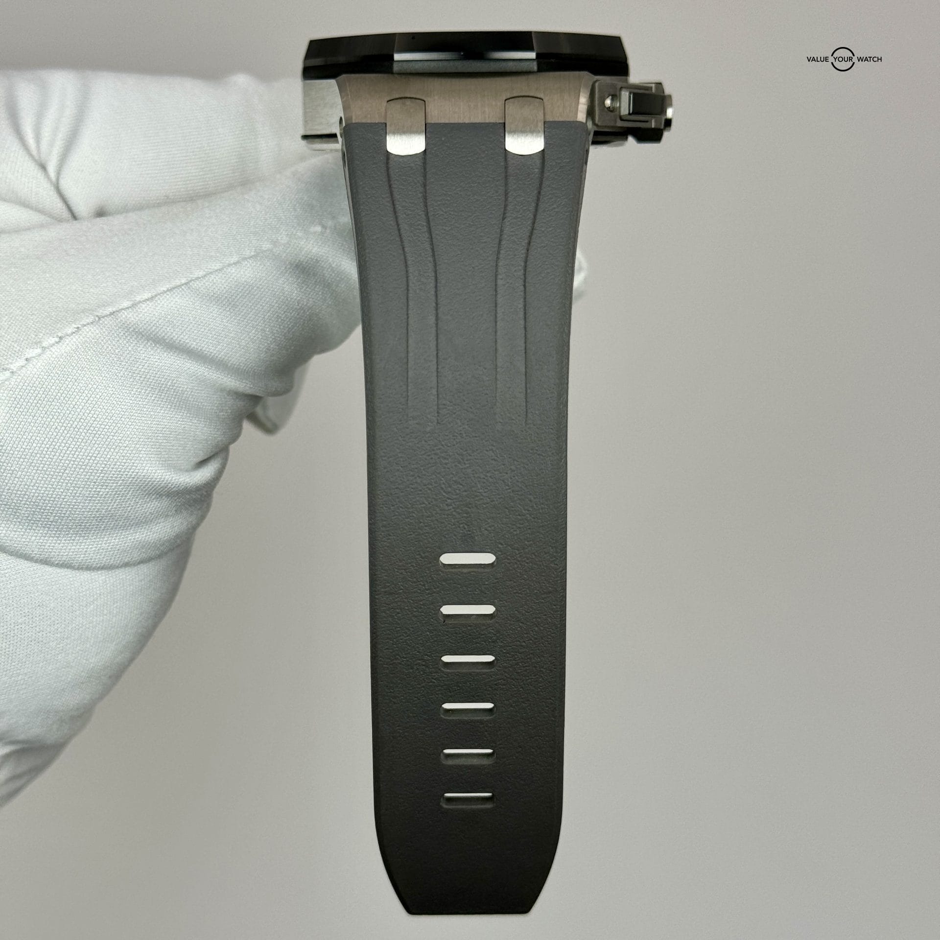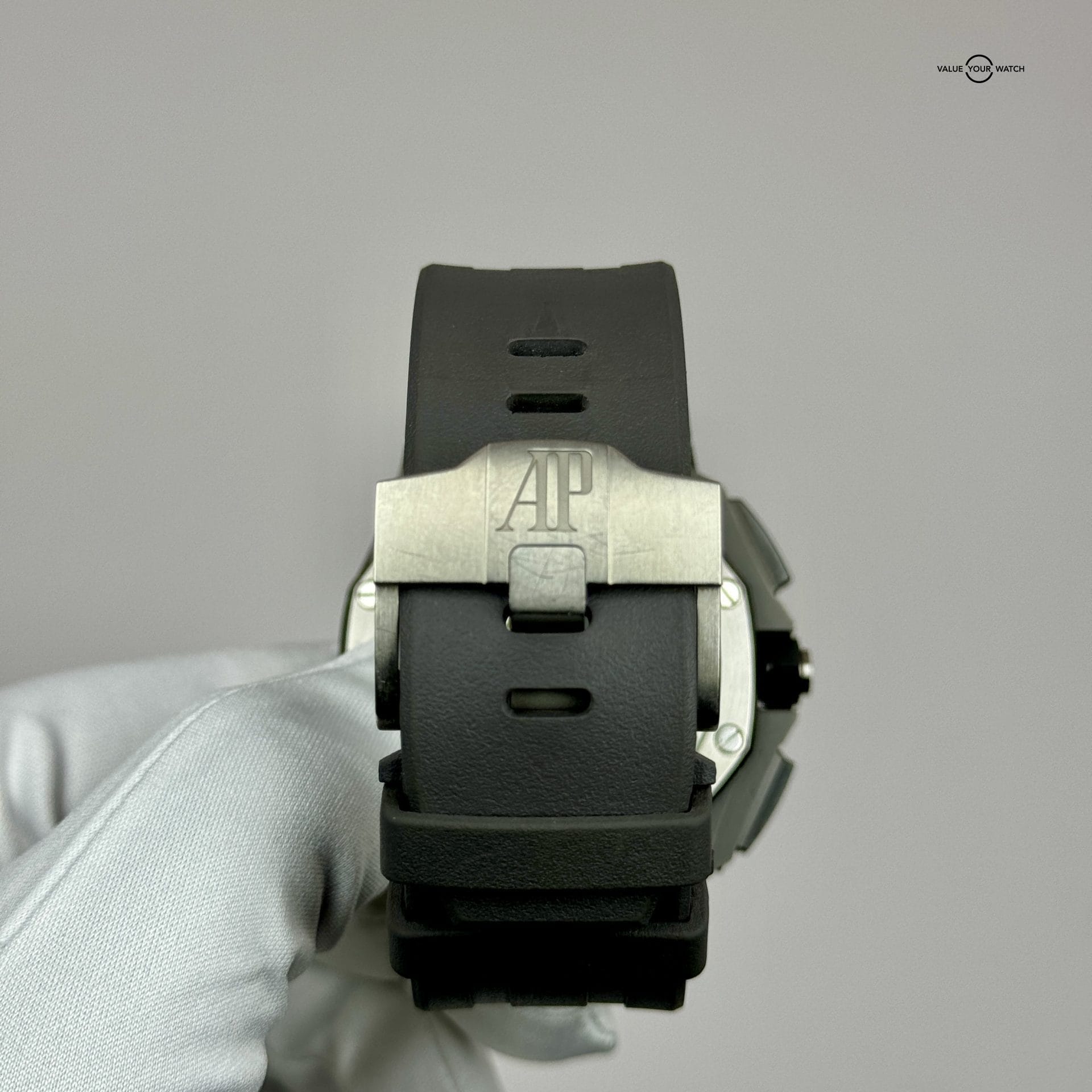 Introducing the Audemars Piguet Royal Oak Offshore Selfwinding Chronograph 26400IO.00.A004CA.01. The 44mm titanium case hosts a black ceramic bezel, slate dial and sub-dials with the iconic Méga Tapisserie pattern, and a date window at 3 o’clock. Luminescent white gold hand and hour markers work with the Sapphire glare-proofed crystal for optimal legibility in any condition. Styled on a grey rubber strap finished with ceramic pins for maximum comfort. This watch has a real physical presence that commands attention in a way only an Audemars can.