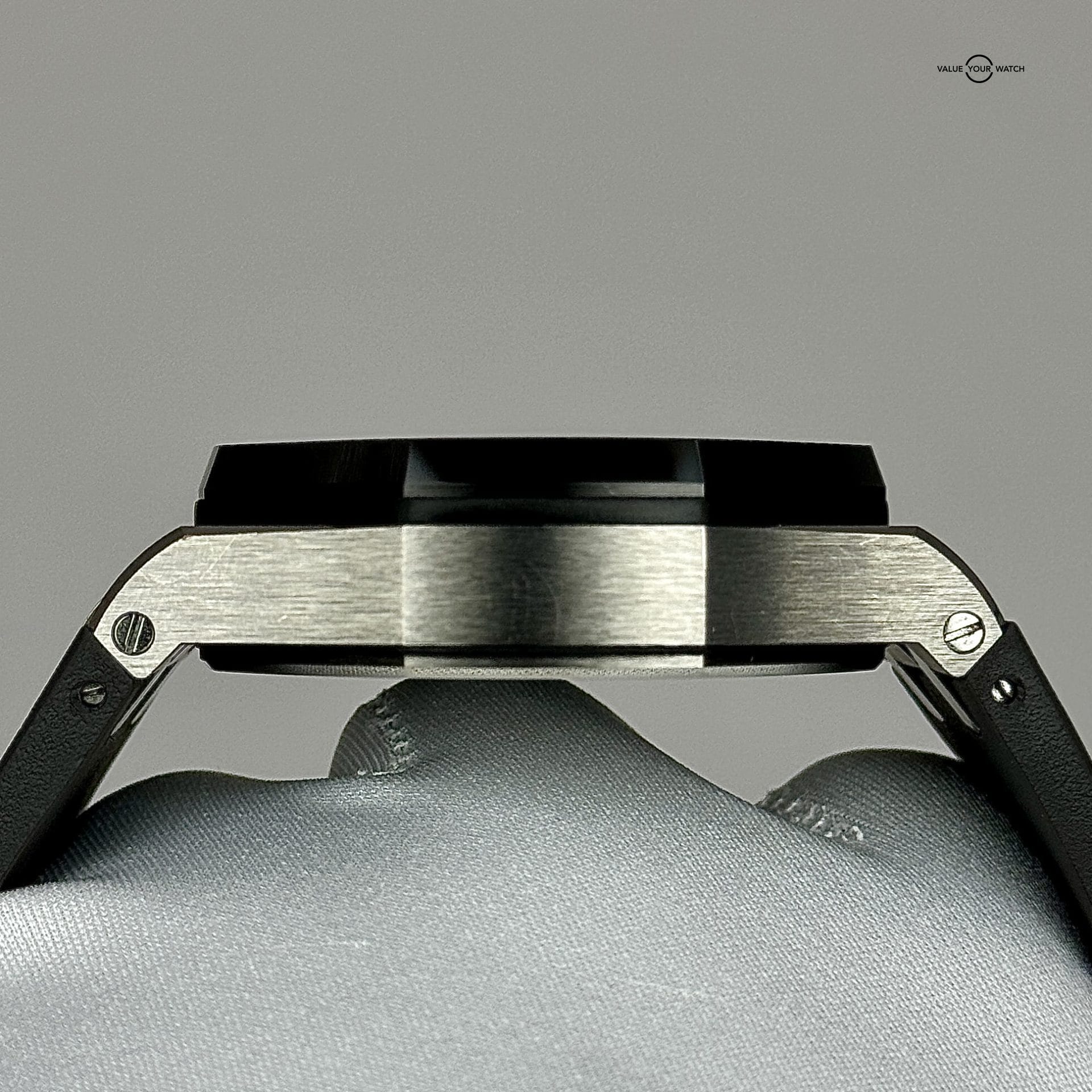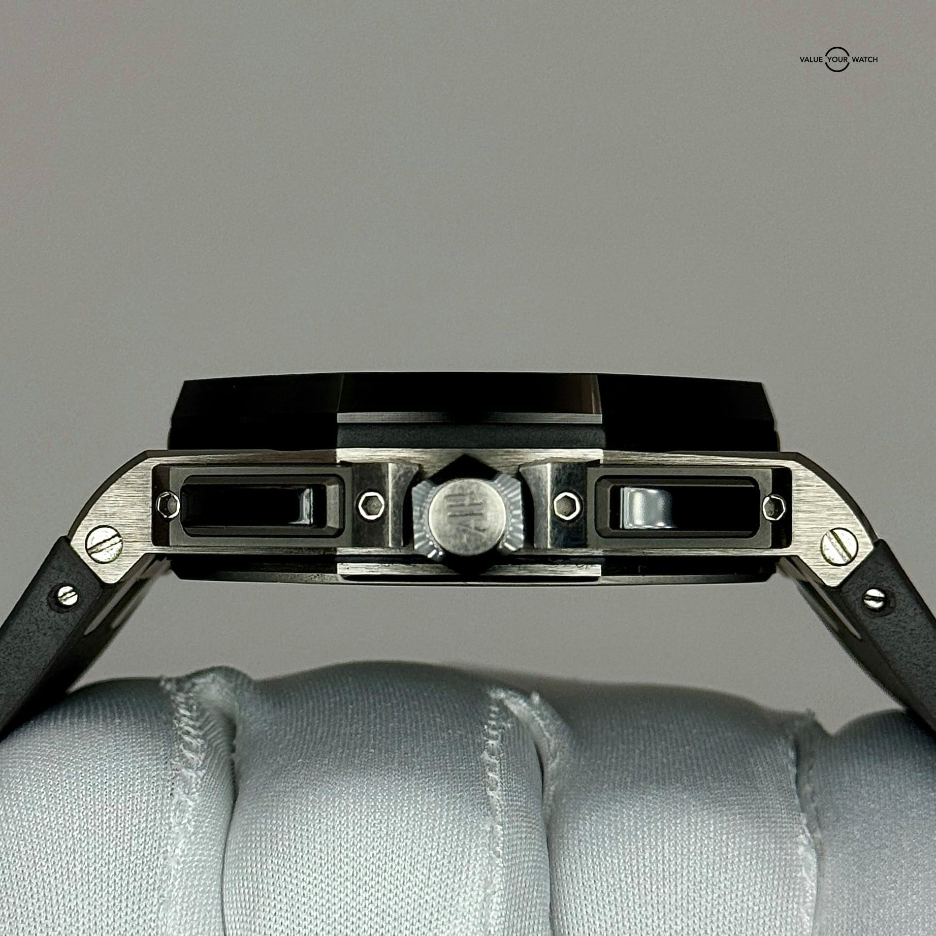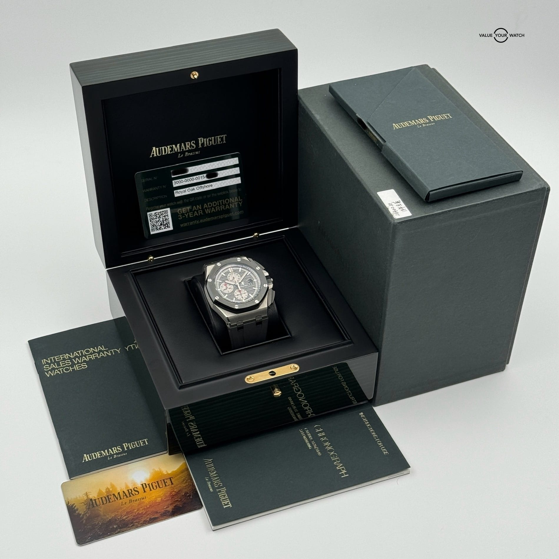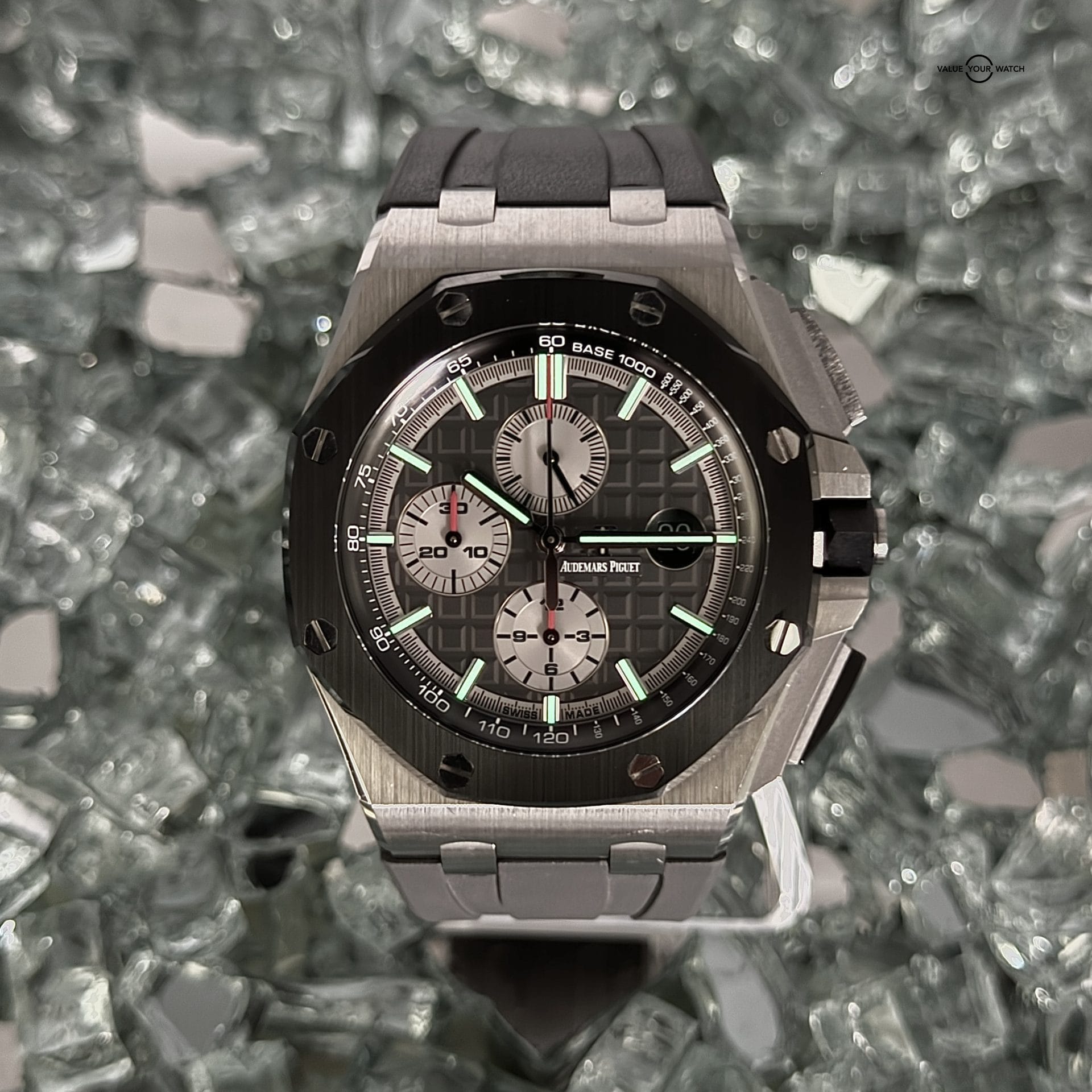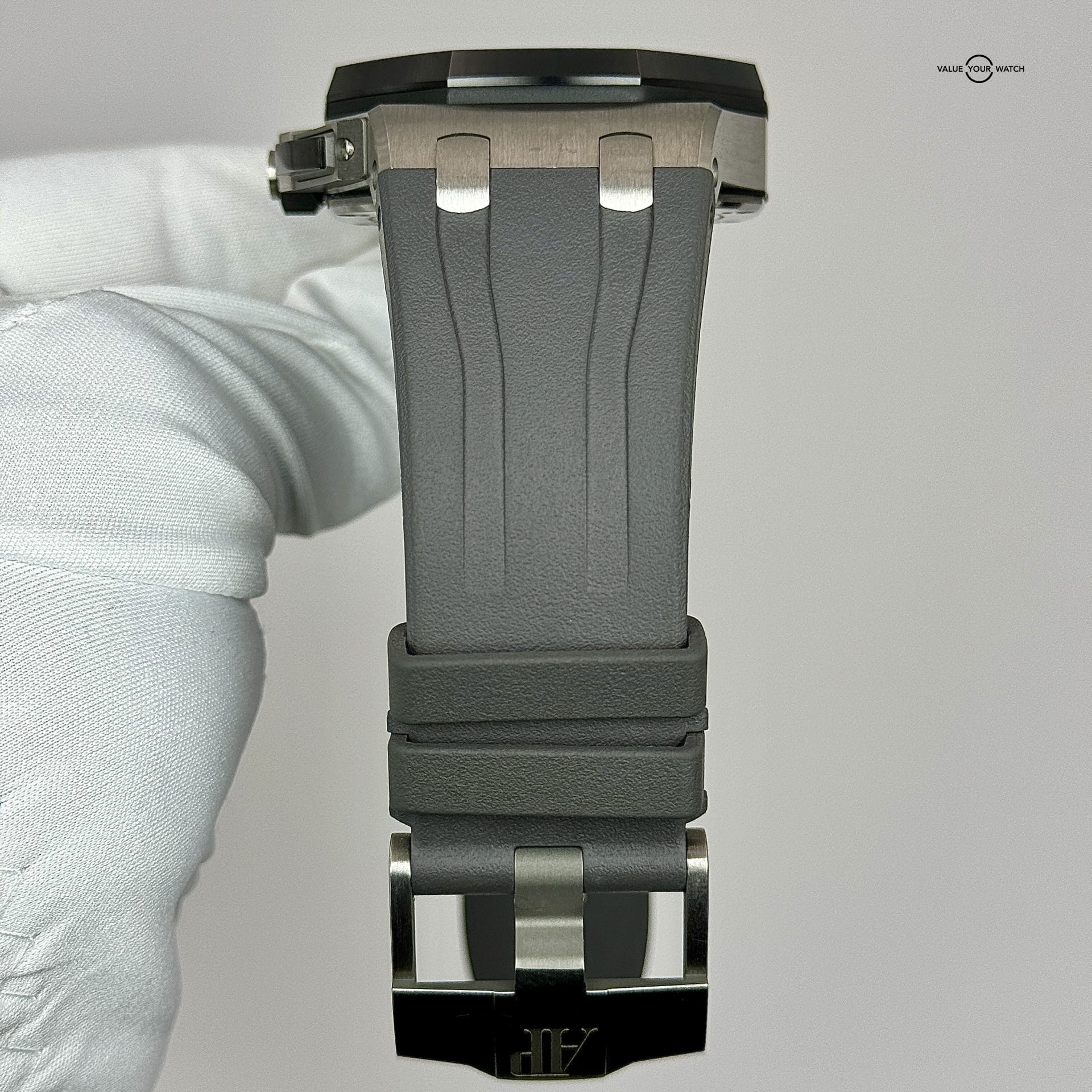 Introducing the Audemars Piguet Royal Oak Offshore Selfwinding Chronograph 26400IO.00.A004CA.01. The 44mm titanium case hosts a black ceramic bezel, slate dial and sub-dials with the iconic Méga Tapisserie pattern, and a date window at 3 o’clock. Luminescent white gold hand and hour markers work with the Sapphire glare-proofed crystal for optimal legibility in any condition. Styled on a grey rubber strap finished with ceramic pins for maximum comfort. This watch has a real physical presence that commands attention in a way only an Audemars can.