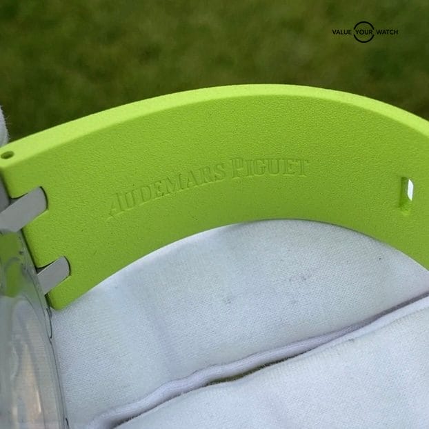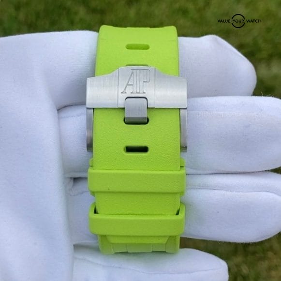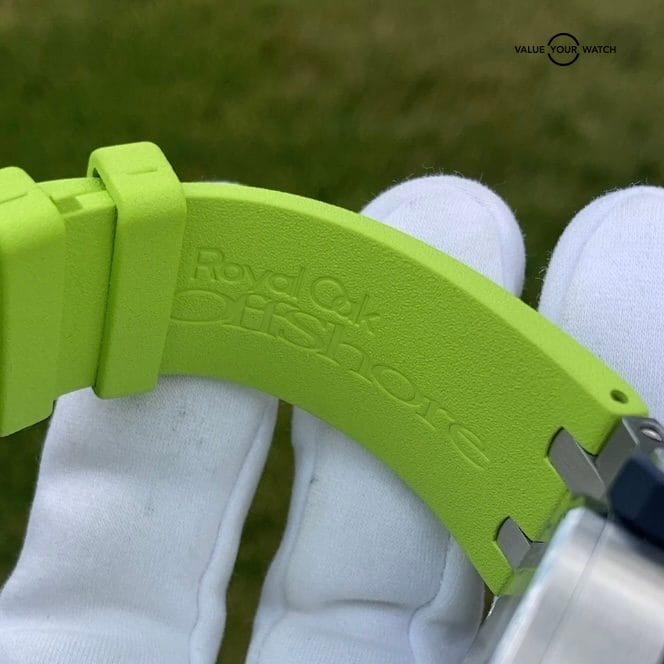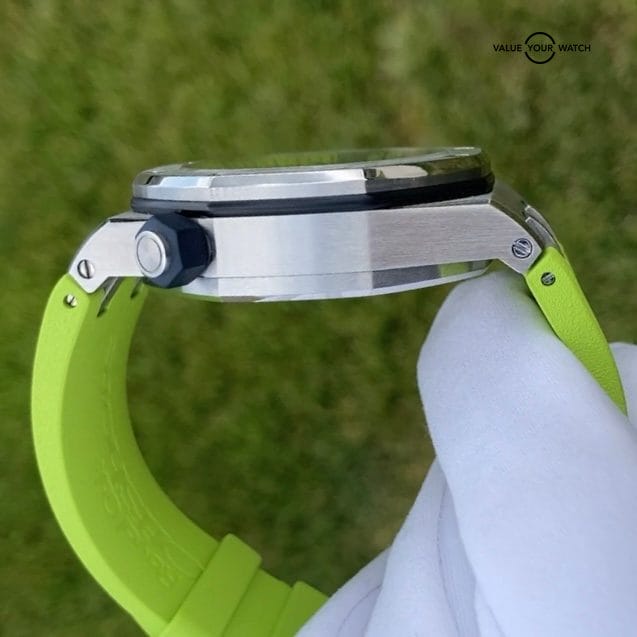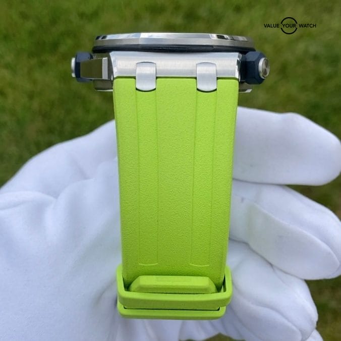 The inner rotating timing bezel a ubiquitous design element of the Royal Oak Offshore Diver is operated by the crown located at 10 o’clock. The blue-colored crowns are coated in vulcanized rubber. Adorned to the cases is an extremely soft and high-quality rubber Royal Oak Offshore tapering straps in lime green that matches the bold lime green color.