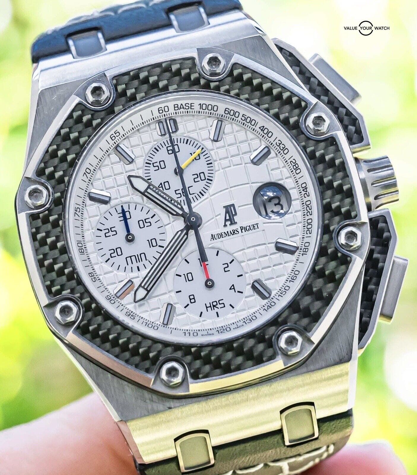 STRIKING Audemars Piguet Royal Oak Offshore Juan Pablo Montoya Limited Edition of 1000 with Silver Dial! Arrives on a *CRISP* matching Montoya Leather Strap, it is impossible to find them in this condition. If you love the look of the 44mm but are like me and can’t make the size work, this Montoya is the one for you! It is the 42mm but has the experimental pushers off of the 44mm, before the 44mm existed. I LOVE the carbon fiber accents and rear rotor resembling a brake rotor, tying to this watch’s heritage with Juan Pablo Montoya being a Race Car Driver. Absolutely STUNNING on wrist! One of my favorite APs in the $50,000 price range. The watch is in very good condition with only very minor wear, nothing notable. Do excuse dust in the pictures as all of our watches are photographed outdoors in natural lighting/conditions. Keeping good time on our timegrapher when tested! Killer watch on wrist, looks like it’s only been worn a handful of times. Beware of other listings with stock pictures and no actual watch in hand; this one is in hand and ready to ship! According to Hodinkee:“Columbian-born racing driver Montoya has a resume filled with racing pedigree from NASCAR to F1 and everything in between. This experience made him the perfect partner for Audemars Piguet to work with during 2005 for a limited edition Offshore. With nods and cues to the high adrenaline sport throughout the watch, this 44mm titanium chronograph is an aggressive and energetic beast. Incorporating the colors of the Columbian flag in descending order via the sub-register hands, as well as the use of carbon fiber and even a brake disc inspired vented automatic rotor seen through the display caseback. Whether you’re a Juan Pablo Montoya fan, an OffShore fan, a racing fan, or a combination of all three, this mid-noughties limited edition piece has clearly stood the test of time. Wave the chequered flag (or imagine the chequered flag tappiserie pattern seen at the center of the dial waving) on this special watch and add to it your collection today.”Do not hesitate to contact me with any questions. I sell over 600 watches per year, have fantastic reviews online, and thousands of references; I seek a very simple and pleasant buying experience for my clients through fostering relationships in the watch community. The serials have been blurred for privacy.Audemars Piguet Royal Oak Offshore Juan Pablo Montoya Limited EditionReference Number: 26030IO.OO.D001IN.01Bezel: Fixed Brushed Titanium & Carbon FiberCase Diameter: 42.00 mmCase Material: Brushed TitaniumClasp: Black TangCrown: Screw-DownCrystal: Sapphire Dial Color: Silver Dial Functions: Hours, Minutes, Seconds, Date, ChronographMovement: Automatic Calibre 2226 / 2840Power Reserve: 42 HoursWater Resistance: 100M / 330FT