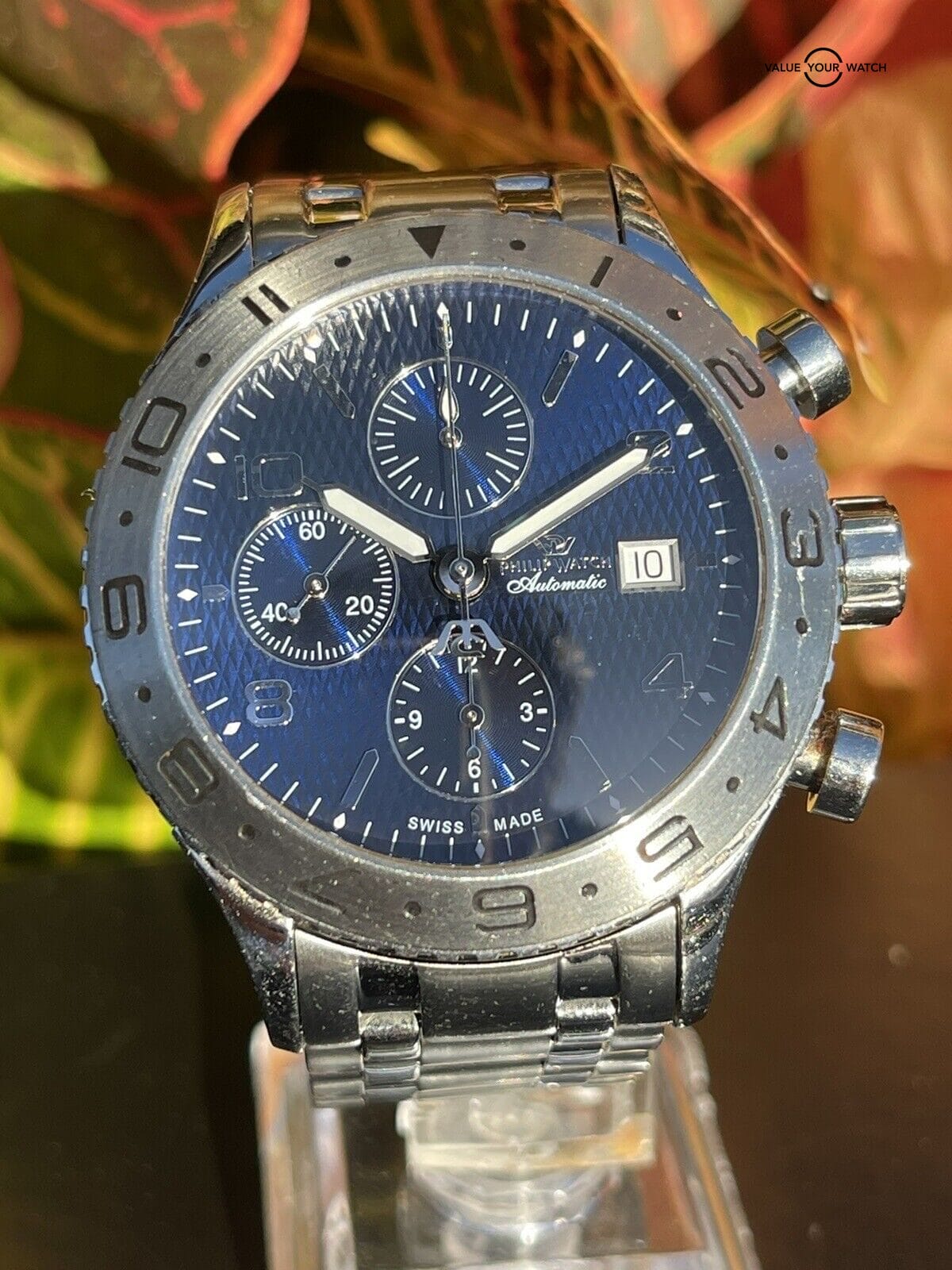Here is a limited edition Philip Watch Admiral Blue Waffle Dial Automatic Chronograph Watch. This is from a military pilots estate sale.