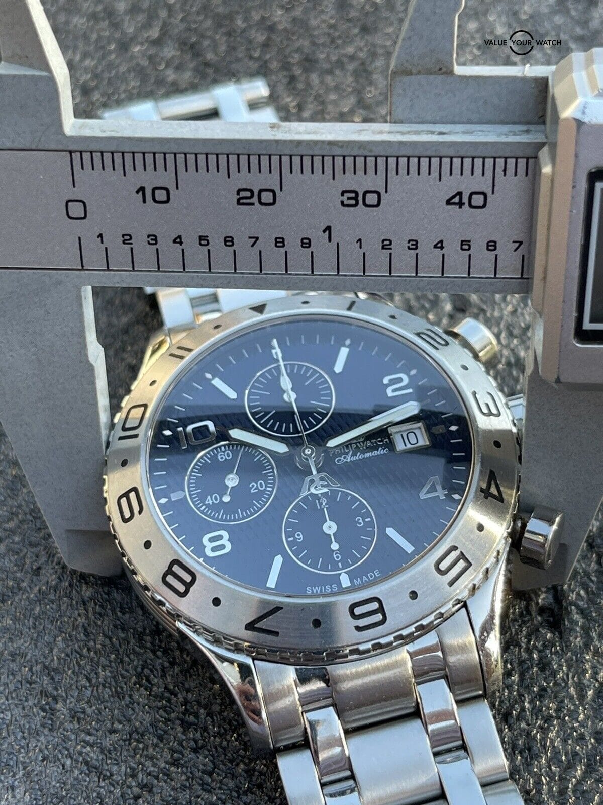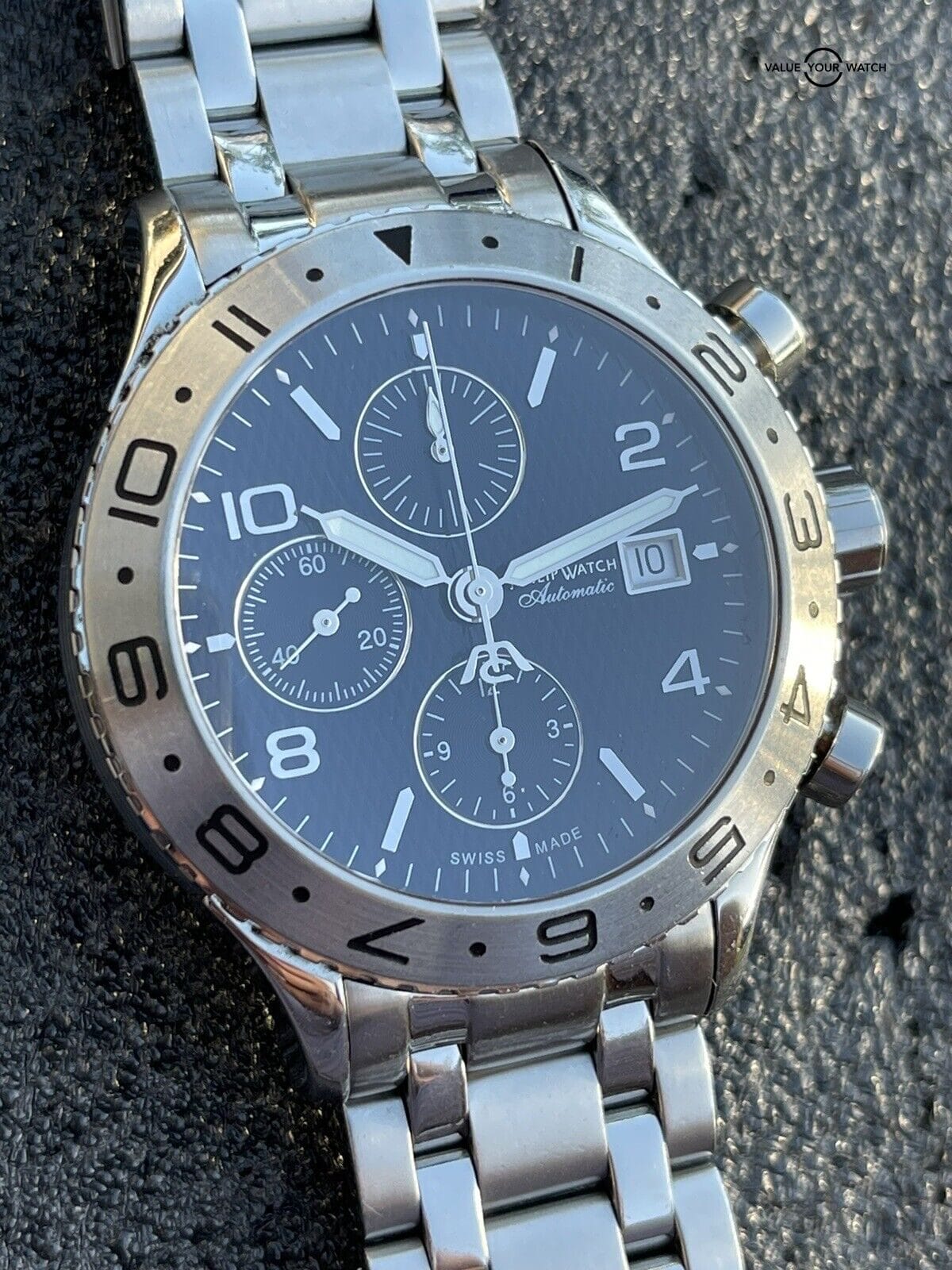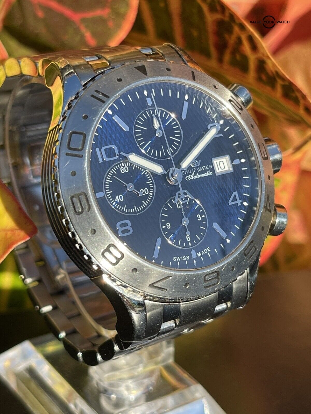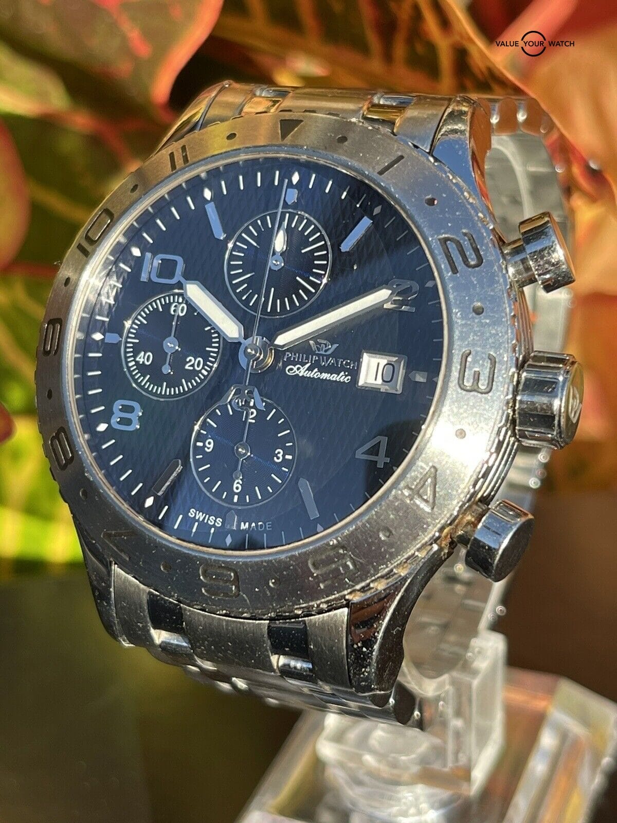 Here is a limited edition Philip Watch Admiral Blue Waffle Dial Automatic Chronograph Watch. This is from a military pilots estate sale.