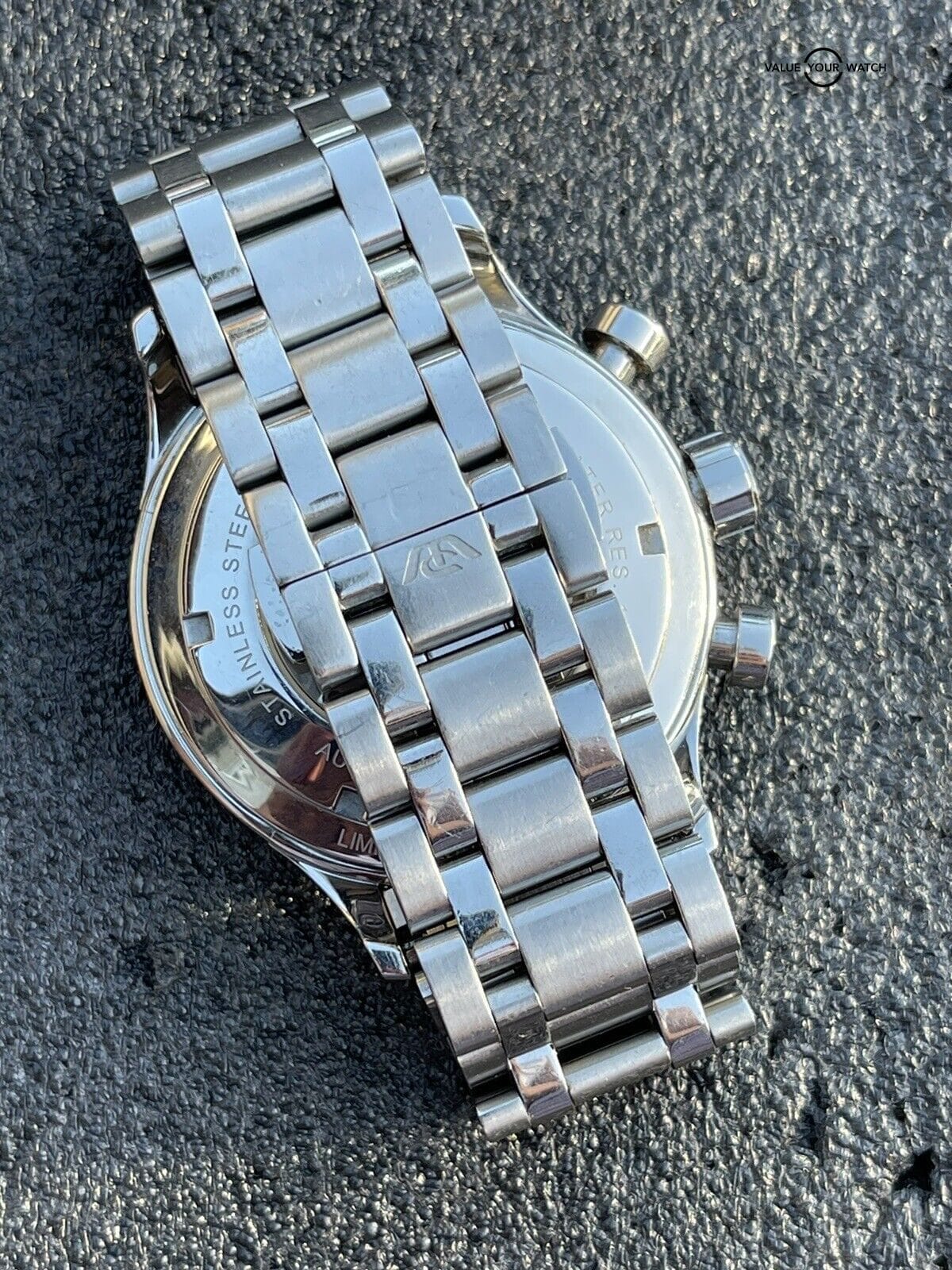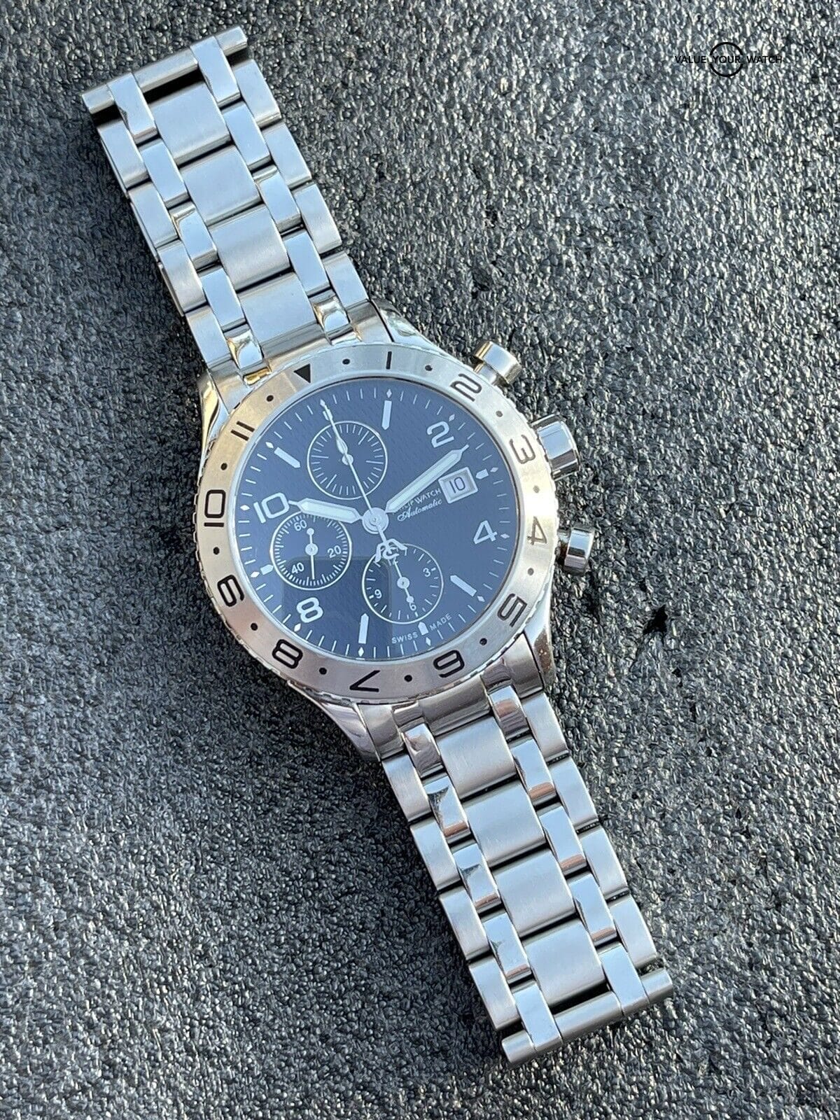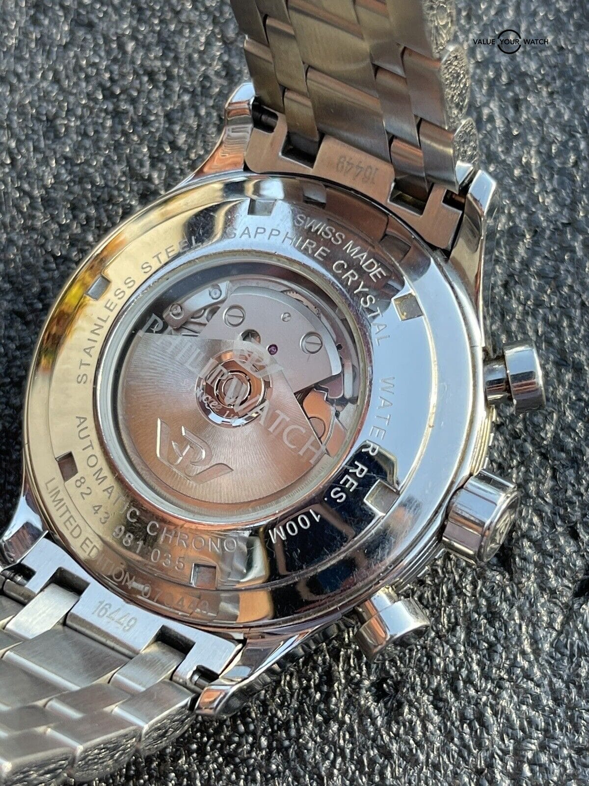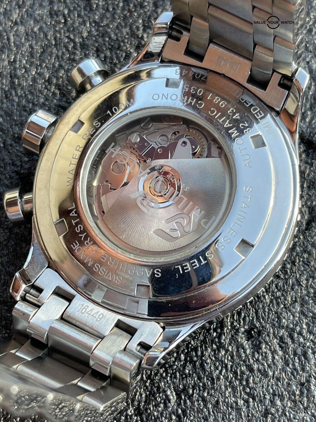 Here is a limited edition Philip Watch Admiral Blue Waffle Dial Automatic Chronograph Watch. This is from a military pilots estate sale.