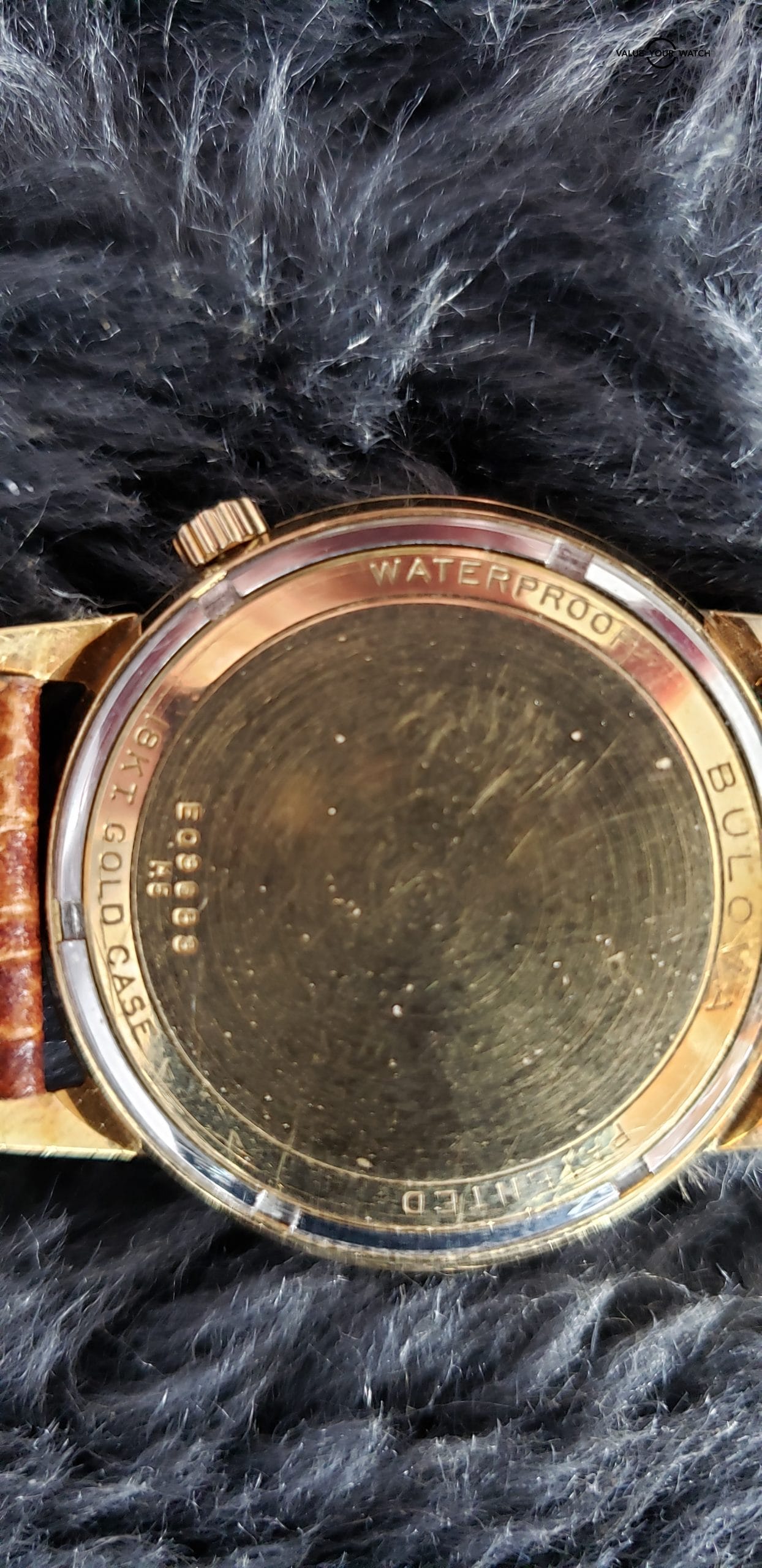 This is a fairly minty original 18k solid gold Bulova Accutron. Movement is a 218 i believe. 34mm. M6 marking dates it to 1966. New battery and recent service. Crown at 4:00. Accutron strap though I’m not sure if it is original to this watch as the accutron buckle is not solid gold.