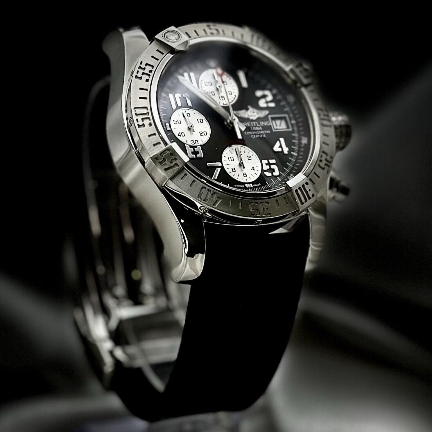 Introducing the remarkable Breitling Avenger II Chronograph, featuring a sophisticated tungsten gray dial set on a professional bracelet, complete with the original Breitling boxes. This model is the epitome of Breitling’s timeless elegance, boasting a fully polished appearance that has become synonymous with the brand’s iconic style.This timepiece maintains an immaculate condition, exhibiting only minimal signs of wear that are hardly noticeable. It performs excellently on our timegrapher, ensuring accurate timekeeping. We photograph all our watches in natural light to capture their true beauty, so please overlook any minor imperfections like the small lint visible between on the rubber band and face markers on the crystal. It’s prepped and ready for wear.For aficionados of Breitling, the Avenger II Chronograph is a must-have. My personal journey with Breitling watches, from the older Skyland 45s to the Super Avengers, has led me to prefer the 43mm size of this model. This generation introduces several enhancements, giving it a more contemporary appearance compared to its predecessors.Feel free to reach out with any inquiries. With large amounts of watches sold annually, my reputation is backed by excellent online reviews and countless references at local jewelry stores. I aim to provide a straightforward and enjoyable purchase experience by building lasting connections within the watch community. This band is designed to comfortably fit on the wrist and be durable with his locking clasp made of stainless steel.Breitling Avenger II Chronograph Details:- Reference Number: A13381 SERIAL: 280####-Caliber: Automatic ETA 7750- Bezel: Unidirectional Rotating Stainless Steel- Bracelet: Rubber Strap with locking stainless steel clasp- Case Diameter: 43.0 mm- Case Material: Stainless Steel Case- Case Thickness: 16.5 mm- Crown: Screwdown- Crystal: Sapphire- Dial Color: Gray- Functions: Hours, Minutes, Seconds, Date, Chronograph- Luminescent Hands & Markers- Movement: Breitling Calibre 13 Automatic- Power Reserve: 42 Hours- Vibrations Per Hour: 28,800- Water Resistance: 300M / 1000FT-Original travel case and box included-No Papers- includes Grailzee authentication and quality report (ask and I’ll send it to you)