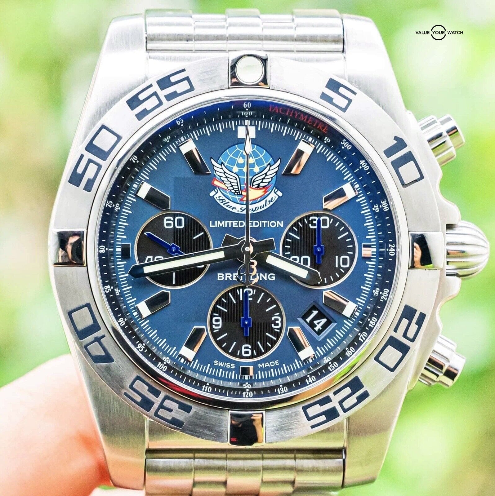 STRIKING Breitling Chronomat 44 “Blue Impulse” Limited Edition #83/400 with Blackeye Blue Dial on Pilot Bracelet! Arrives with the original Breitling boxes. This watch is a killer setup, it is one of the few Chronomats ever offered with the highly desirable black / dark blue bezel numerals and simply has the Blackeye Blue Dial, a good contrast from the all brushed stainless steel finishing. Ready to be on wrist!These watches are very rare and hard to find in the United States; believe it or not, these were originally a Japanese Limited Edition devoted to the Blue Impulse Japan Air Self Defense Force, specifically their aerobatic flight team. The caseback says “Challenge for the Creation”, Blue Impulse’s motto. To me, you can apply that motto to almost anything. There are not any reasons I could come up to not buy the watch- just so solid, exclusive, rare, and striking. Perfect if you’re looking for a great addition to your collection, or even your first watch to wear everyday with that brushed-finish versatility & durability!This Blue Impulse is in phenomenal condition with only very minor wear, nothing notable. In my opinion, It looks far better in person than in the pictures! Do excuse the dust/lint in the photos as we photograph all watches outside in natural lighting/conditions. Keeping great time when tested on our timegrapher. Clean and desirable setup overall, ready to be enjoyed! Do not hesitate to contact me with any questions. I sell over 600 watches per year, have fantastic reviews online, and thousands of references; I seek a very simple and pleasant buying experience for my clients through fostering relationships in the watch community. The serials have been blurred for privacy. The bracelet can accommodate a 7.5 inch wrist at maximum without additional links.Breitling Chronomat 44 Blue Impulse Limited Edition Reference Number: AB01107E/C885Bezel: Bi-Directional Rotating Polished Stainless Steel Bracelet: Brushed Stainless Steel PilotCase: Brushed & Polished Stainless SteelCase Diameter: 44.00 mmCase Thickness: 16.95 mmCrown: Screw-DownCrystal: SapphireDial Color: “Blackeye Blue”; Blue Dial w/Black SubdialsFunctions: Hours, Minutes, Seconds, Date, ChronographJewels: 47Luminescent Hands & Markers Movement: Automatic Breitling Calibre 01 Power Reserve: 70 HoursVibrations Per Hour: 28,800Water Resistance: 500M / 1650FT