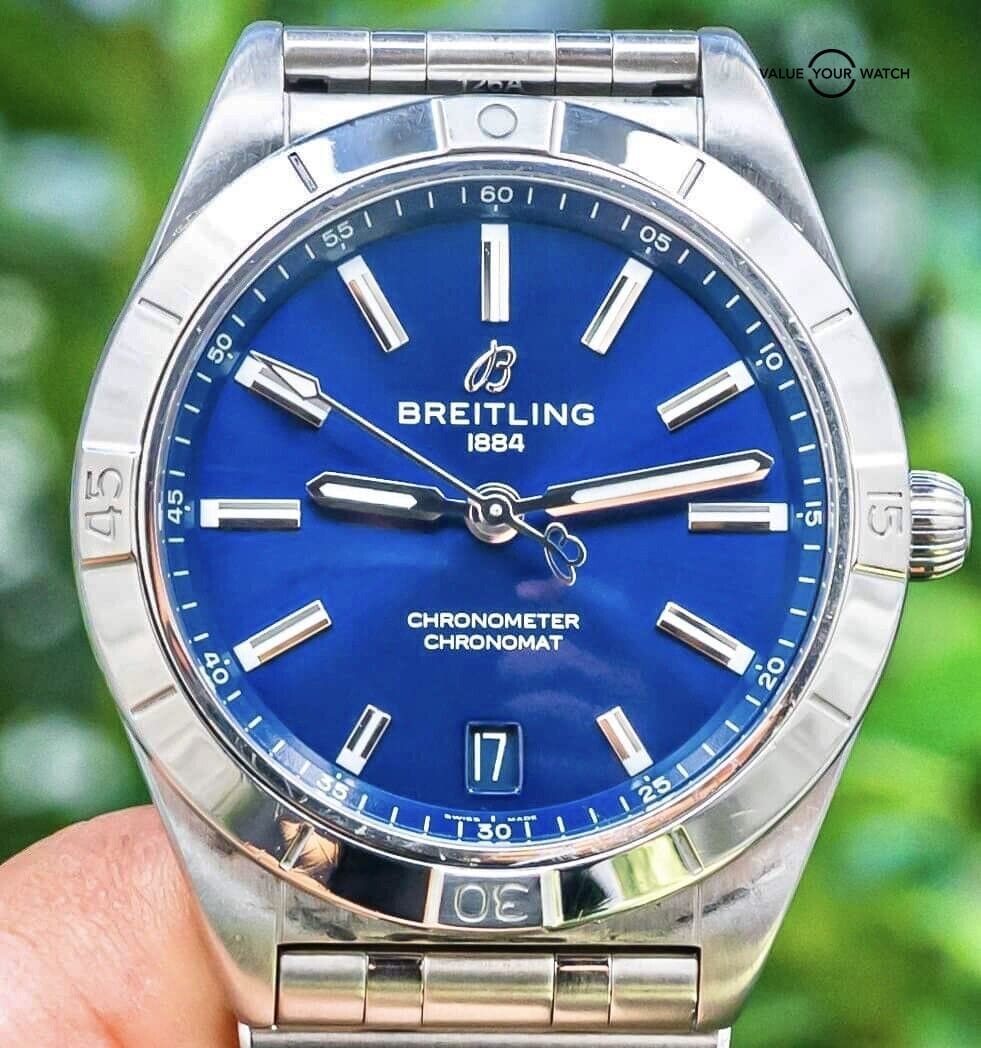 STRIKING Breitling Chronomat Automatic 36 with Blue Dial on Rouleaux “Bullet” Bracelet! Comes with the original Breitling box. Killer setup, the watch is pretty much entirely brushed with the exception of the polished bezel and sections of the Bullet Bracelet. This model has not been out for long- take this opportunity to get a recent release at a killer cost!The watch has typical pre-owned wear as pictured. Keeping good time on my timegrapher when tested! Do excuse dust/lint in the pictures as all of our watches are photographed outdoors in natural lighting/conditions. Ready to be on wrist!From Breitling:“Stylish yet elegant, the modern-retro inspired Chronomat Automatic 36 is the versatile sporty and chic watch for any occasion. Featuring Breitling’s iconic and comfortable “Rouleaux” bracelet with a butterfly clasp, the Chronomat Automatic 36 is powered by the Breitling Caliber 10, a COSC-certified chronometer.”Do not hesitate to contact me with any questions. I sell over 600 watches per year, have fantastic reviews online, and thousands of references; I seek a very simple and pleasant buying experience for my clients through fostering relationships in the watch community. The serials have been blurred for privacy. The bracelet can accommodate a 7 inch wrist at maximum without additional links.Breitling Chronomat Automatic 36Reference Number: A10380101C1A1Bezel: Polished Unidirectional Rotating Stainless SteelBand: Polished & Brushed Stainless Steel Rouleaux Bullet BraceletCase: Brushed Stainless SteelCase Diameter: 36.0 mmCase Thickness: 10.0 mmCrown: Push-PullCrystal: SapphireDial: BlueJewels: 25Movement: Breitling Caliber 10 Power Reserve: 42 HoursVibrations: 28,800 vphWater Resistance: 100M / 330FT