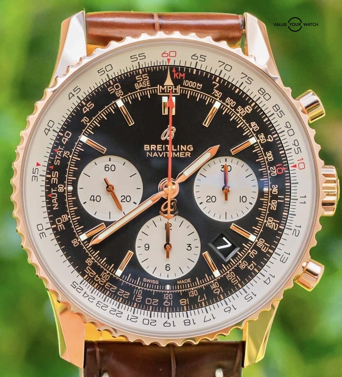 STUNNING Breitling Navitimer B01 Chronograph 43 in Solid Red Gold with the In-House B01 Movement and Black Dial on Brown Croco and Solid Red Gold Deploy Clasp! Comes complete with all original Breitling boxes and papers including the international warranty card. Originally purchased from a Breitling Authorized Dealer in October 2021 and is WARRANTIED through Breitling until October 2026. SERVICED at Breitling in November 2022. Very classic Breitling, timeless and sure to be a future classic with the In-House B01 Movement! This Navitimer is in phenomenal condition! FRESHLY SERVICED in November 2022 at Breitling and is quite literally now near a brand new watch. I feel the pictures are very representative of the condition; however, please excuse the dust in the pictures, the watch looks even better in person! This is a clean watch that belongs in any watch rotation and its classic Navitimer style matches with almost any outfit. At 43, it’s a perfect all around size to use with cuffs if needed! Easy piece to dress up or down.Do not hesitate to contact me with any questions. I sell over 600 watches per year, have fantastic reviews online, and thousands of references; I seek a very simple and pleasant buying experience for my clients through fostering relationships in the watch community. The serials have been blurred for privacy.Breitling Navitimer B01 Chronograph 43Reference Number: RB0121211B1P2Band: Brown CrocoBezel: Bidirectional Rotating Solid Red GoldBand Width: 22.00 mmCase Material: Solid Red GoldCase Diameter: 43.00 mmCase Finish: Polished Clasp: DeployCrown: Push-PullCrystal: Sapphire Dial Color: Black w/Silver SubdialsDial Markers: Stick Hour MarkersFunctions: Hours, Minutes, Seconds, Date, ChronographLuminescent Hands & MarkersMovement: Automatic Breitling Caliber B01Power Reserve: 70 HoursVibrations Per Hour: 28,800Water Resistance: 30M / 100FT