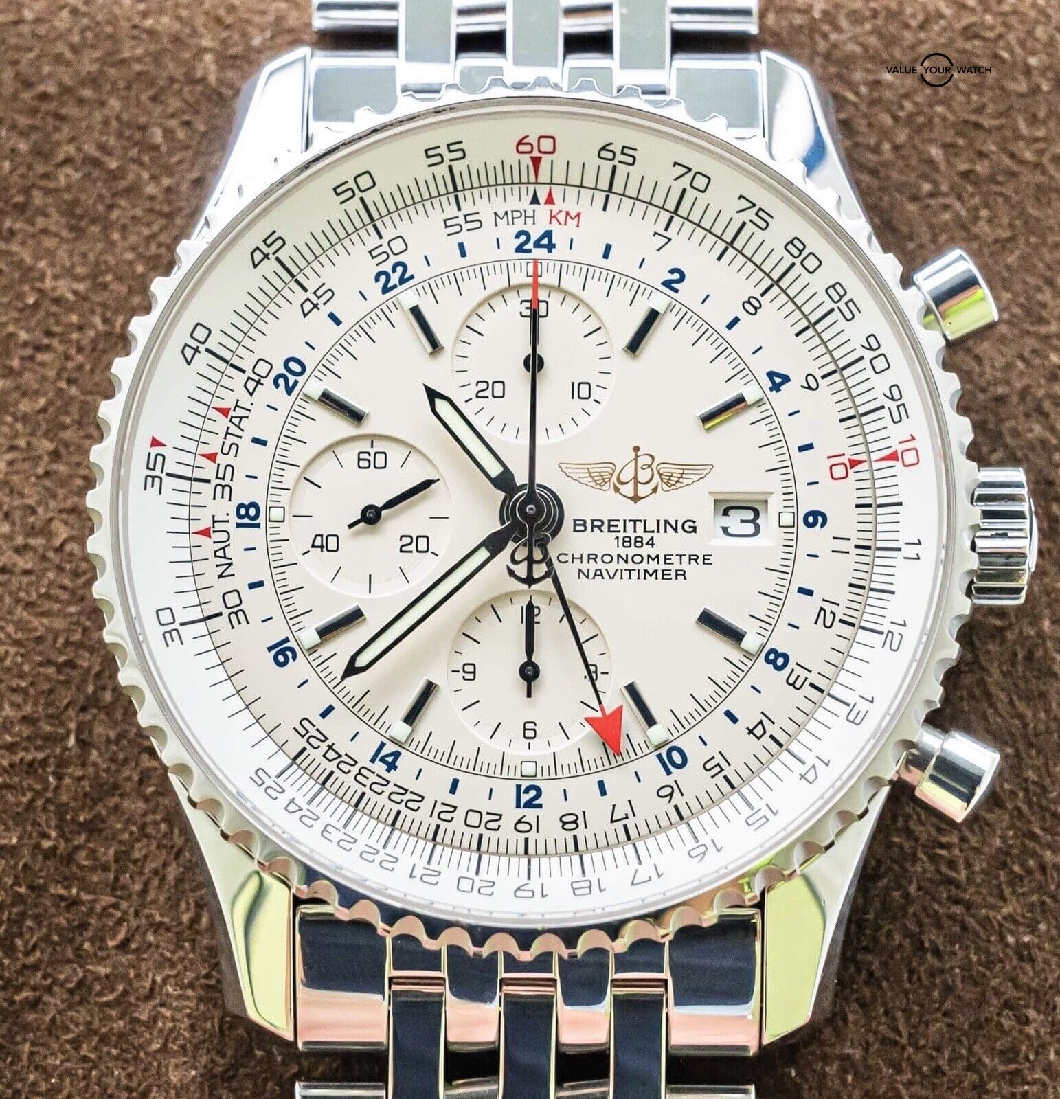 STUNNING Breitling Navitimer World 46 GMT with Silver Dial on Stainless Steel Navitimer Bracelet! Comes with original Breitling boxes. The silver dial and stainless steel bracelet is the most desirable Navitimer combination and has a very classic look with the iconic discontinued “Winged-B” Logo! This Navi is clean overall with only very minor wear, nothing notable. Keeping good time on our timegrapher when tested! Do excuse the dust/lint in the pictures as all our watches are photographed outside in natural lighting/conditions. Clean watch that belongs in any watch rotation, with the Navitimer World being the most popular Navitimer in recent production. It’s classic Navitimer style matches with almost any outfit! Do not hesitate to contact me with any questions. I sell over 600 watches per year, have fantastic reviews online, and thousands of references; I seek a very simple and pleasant buying experience for my clients through fostering relationships in the watch community. The serials have been blurred for privacy. The bracelet can accommodate a 7.9 inch wrist at maximum without additional links, a huge value-add. Breitling Navitimer World 46Reference Number: A2432212/G571MSRP: $7,940Bezel: Bidirectional Ratcheting Stainless Steel with Slide RuleBracelet: Stainless Steel Navitimer Bracelet Case Diameter: 46.00 mmCase Material: Stainless SteelCase and Bracelet Finish: Polished Case Thickness: 15.5 mmCrown: Push/PullCrystal: Sapphire Dial Color: SilverFunctions: Hours, Minutes, Seconds, Date, Chronograph, GMTLug Width: 24.00 mmLuminescent Hands & Markers Movement: Automatic Breitling Calibre 24Power Reserve: 42 HoursVibrations Per Hour: 28,800Water Resistance: 30M / 100FT