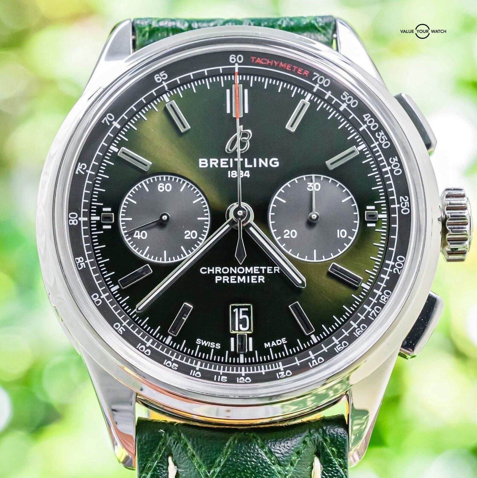 STRIKING Breitling Premier B01 Chronograph 42 Bentley with British Racing Green Dial and Black Subdials on BRAND NEW UNWORN Green Breitling Quilted Leather & Stainless Steel Deploy Clasp! Arrives as a complete set with the original Breitling boxes and papers including the electronic international warranty card, serialized COSC certificate, maintenance booklet, manual, and hand tag. Originally purchased from a Breitling Authorized Dealer in April 2020. Have peace of mind, the watch is WARRANTIED until April 2025! The Quilted Breitling Leather Strap is super cool, designed to be reminiscent of Bentley’s Leather Car Seats. I’ve had several Premiers at this point, and this Bentley Green Dial is simply KILLER! The watch is in phenomenal condition with only minor wear, nothing notable. Keeping good time on my timegrapher when tested! Do excuse the dust/lint/fingerprints in the pictures as all of our watches are photographed outdoors in natural lighting/conditions. Super comfortable piece, easy to dress up or down. Ready to be on wrist! Do not hesitate to contact me with any questions. I sell over 600 watches per year, have fantastic reviews online, and thousands of references; I seek a very simple and pleasant buying experience for my clients through fostering relationships in the watch community. The serial number has been blurred for privacy. Breitling Premier B01 Chronograph 42 BentleyReference Number: AB0118A11L1X1MSRP: $8,750Band: BRAND NEW UNWORN Green Breitling Quilted LeatherBezel: Fixed Polished Stainless SteelCase Diameter: 42.00 mm Case Material: Polished & Brushed Stainless SteelCase Thickness: 13.60 mmClasp: Brushed Stainless Steel DeployCrystal: Sapphire Dial: British Racing Green w/Black SubdialsFunctions: Hours, Minutes, Seconds, Date, ChronographJewels: 41Movement: Breitling Caliber 01Power Reserve: 70 HoursVibrations Per Hour: 28,800Water Resistance: 100 Meters / 330 Feet