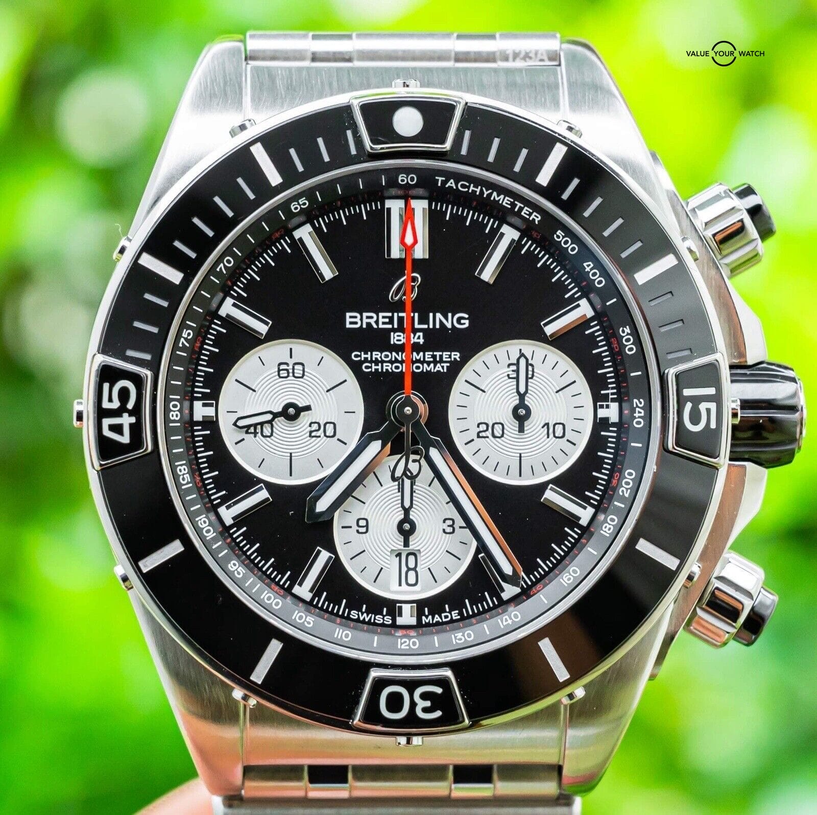 STRIKING Breitling Super Chronomat B01 44 with Black Dial and Silver Subdials on Rouleaux Bracelet! Arrives with original Breitling boxes. Killer setup, the watch is pretty much entirely brushed with the exception of the polished bezel and edges of case! The watch is in phenomenal condition with only very minor wear, nothing notable. Keeping good time on my timegrapher when tested! Do excuse the extreme amount of dust & lint in the pictures (especially this exact photoshoot, there was tons due to wind) as all of our watches are photographed outdoors in natural lighting/conditions. This is the best variant of the new Super Chronomat B01 44 in production, the classic black dial on bracelet is killer! Do not hesitate to contact me with any questions. I sell over 600 watches per year, have fantastic reviews online, and thousands of references; I seek a very simple and pleasant buying experience for my clients through fostering relationships in the watch community. The serials have been blurred for privacy. Please mention your wrist size prior to purchase to clarify if the bracelet’s length can accommodate your wrist size. Breitling Super Chronomat B01 44Reference Number: AB0136251B1A1MSRP: $10,200Band: Rouleaux BraceletCase: Brushed & Polished Stainless SteelCase Diameter: 44.0 mmCase Thickness: 14.4 mmCrown: Screw-DownCrystal: SapphireDial: Black with Silver SubdialsJewels: 47Movement: Self -Winding Breitling Caliber 01 Power reserve: 70 HoursVibrations: 28,800 vphWater Resistance: 200M / 660FT
