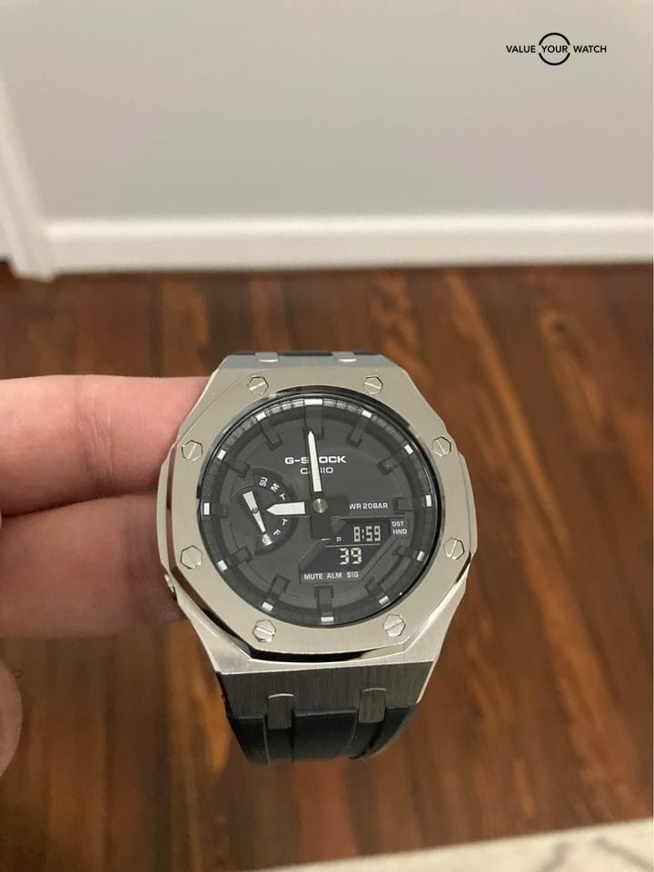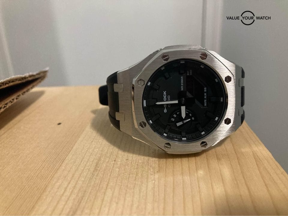 Beautiful watch with a customized kit (casioak) Steel on black rubber band. Will come with box, papers and warranty card.