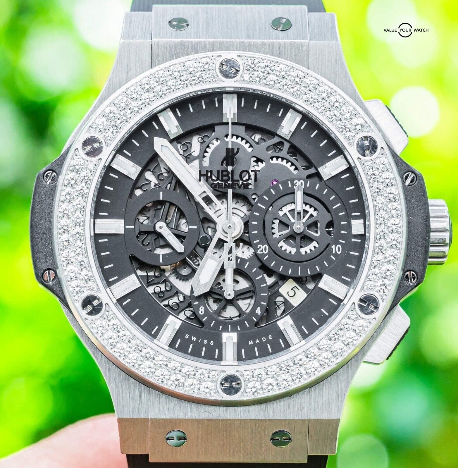 STRIKING Hublot Aero Bang 44 in Stainless Steel with FACTORY SET Hublot VVS Diamond Bezel and Skeleton Dial on Black Hublot Rubber Strap! Arrives as watch only and has a super impressive MSRP around $24K, a significant value on the secondary market. This is a desirable Aero Bang spec with the black and all silver skeleton contrast, made even more special with the factory diamond bezel. Stunning, comfortable, and clean! The watch is incredibly clean with only very minor wear, nothing notable. It looks even better than in the photos! Do excuse the dust/lint in the pictures as all of our watches are photographed outdoors in natural lighting/conditions. Keeping good time on my timegrapher when tested and is ready to be on your wrist! Do not hesitate to contact me with any questions. I sell over 600 watches per year, have fantastic reviews online, and thousands of references; I seek a very simple and pleasant buying experience for my clients through fostering relationships in the watch community. The serials have been blurred for privacy. Hublot Aero Bang 44 SteelReference Number: 311.SX.1170.GR.1104Band: Black Hublot Rubber StrapBezel: Brushed Stainless Steel FACTORY SET with Hublot VVS DiamondsCase Diameter: 44.00 mmCase Material: Brushed Stainless SteelCase Thickness: 14.00 mmClasp: DeploymentCrystal: Sapphire Dial: Black SkeletonDial Markers: Stick Hour MarkersFunctions: Hours, Minutes, Seconds, Date, ChronographJewels: 27Luminous Hands & Dial MarkersMovement: Automatic Hublot Calibre HUB4214Power Reserve: 42 HoursCrown: Pull / PushVibrations: 28,800 vph Water Resistance: 100M / 330FT 257 Hand-Assembled Components