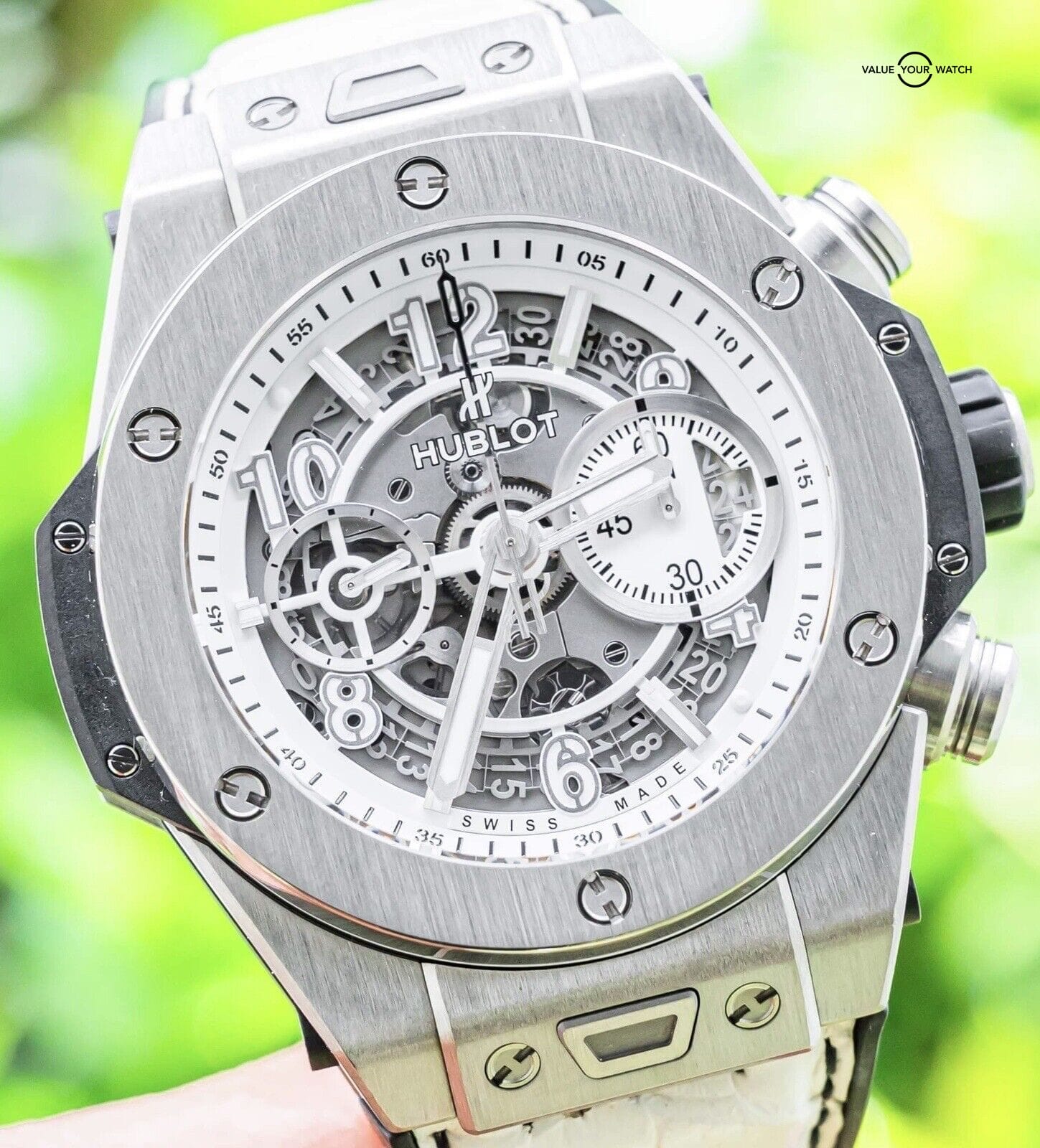STRIKING Hublot Big Bang Unico 45 JSM15 White in Titanium with White Skeleton Dial on White Hublot Alligator Strap! Arrives with the original Hublot boxes and papers including the international warranty card. Originally purchased in June 2018 from a Hublot Authorized Dealer! Very comfortable watch on the White Alligator Strap being that it’s backed in Rubber, giving you that great look of leather but comfort of a rubber strap. I wear Hublots everyday as they are my go tos due to their comfort. The skeleton dial and titanium case provide a killer contrast; a lot of people also don’t know that Hublot developed this Unico movement entirely in-house, pretty impressive!This Unico is in phenomenal condition with only very minor wear, nothing notable outside of normal strap wear as pictured. Keeping great time when tested on my timegrapher! Do excuse the dust as we take all photos outside in natural lighting/conditions. Clean and desirable setup overall, ready to be enjoyed and on wrist! Do not hesitate to contact me with any questions. I sell over 600 watches per year, have fantastic reviews online, and thousands of references; I seek a very simple and pleasant buying experience for my clients through fostering relationships in the watch community. The serials have been blurred for privacy. Hublot Big Bang Unico 45 JSM15Reference Number: 411.NE.2010.LR.JSM15MSRP: $19,900Band: White Hublot Alligator Strap, Backed in RubberBezel: Fixed Brushed TitaniumCase: Brushed Titanium Case Diameter: 45.00 mmClasp: Fold Over with Push Button ReleaseCrown: Screw-DownCrystal: Sapphire Dial: White SkeletonFunctions: Hours, Minutes, Seconds, Date, ChronographJewels: 38Movement: Automatic Hublot Caliber HUB1242Power Reserve: 72 HoursWater Resistance: 100M / 330FT 330 Individually Hand-Assembled Components
