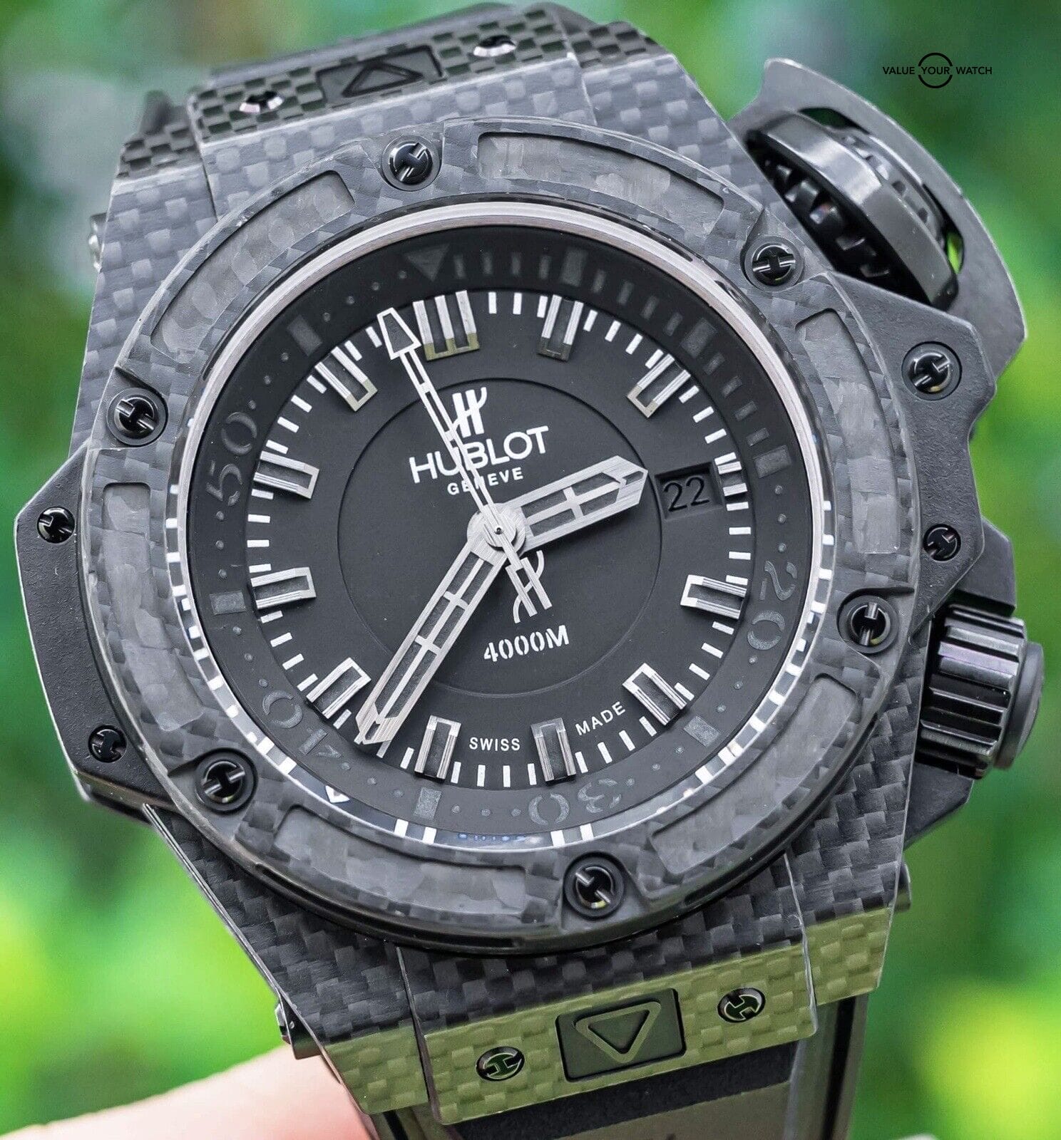 STRIKING Hublot King Power Oceanographic 4000 Carbon Fiber Limited Edition of 500 with Black Dial on Black Hublot Rubber Strap! Arrives as watch only and is ready to be on wrist. This is my favorite Oceanographic spec in the Full Matte Carbon Fiber, giving a very versatile look that you can easily dress up and down daily. If you’re a car nut like me, the Carbon Fiber is even a better match for your love of cars. Stunning, comfortable, and clean! The watch is in very good condition as pictured but doe shave minor wear, way better than the last one I sold in February. Keeping great time when tested on our timegrapher! Do excuse dust/lint in the photos as all of our watches are photographed outdoors in natural lighting/conditions. Desirable Hublot ready to be on your wrist! Do not hesitate to contact me with any questions. I sell over 600 watches per year, have fantastic reviews online, and thousands of references; I seek a very simple and pleasant buying experience for my clients through fostering relationships in the watch community. The serials have been blurred for privacy. Hublot King Power Oceanographic 4000 Limited Edition of 500Reference Number: 731.QX.1140.RX MSRP: $29,100Band: Black Hublot Rubber Bezel: Fixed Matte Carbon FiberCase Diameter: 48.00 mmCase Material: Matte Carbon FiberCase Thickness: 22.40 mmClasp: DeploymentCrystal: Sapphire Dial: Black SkeletonDial Markers: Luminescent Stick Hour MarkersFunctions: Hours, Minutes, Seconds, Chronograph, Date, FlybackJewels: 23Movement: Hublot AutomaticPower Reserve: 42 HoursVibrations: 28,800 vph Water Resistance: 4000M / 13120FT 180 Individually Hand Assembled Components