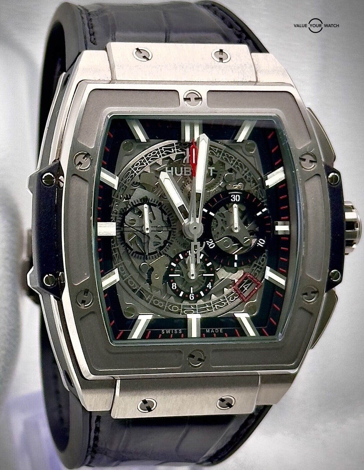 Step into a world of unparalleled sophistication with this Hublot Spirit of Big Bang, a testament to Hublot’s mastery in fusing elegance with cutting-edge functionality. This luxury timepiece is crafted from satin-finished and polished titanium, is accentuated by a striking black ceramic bezel, meticulously detailed with microblasting and held together with six signature H-shaped titanium screws.Key Features:Dial: Avant-garde skeleton dial protected by anti-reflective sapphire crystal, showcasing the precise HUB4700 automatic skeleton chronograph movement with a 50-hour power reserve.Case & Bezel: Robust ceramic case paired with a satin-finished, microblasted black ceramic bezel.2 Straps: Premium black alligator leather with a black titanium-coated titanium deployment clasp for a secure and stylish fit. White Rubber Strap with Athletic fit.Water Resistance: Up to 100 metersExceptional Value:Condition: Pristine, appears as new with minimal signs of wear, meticulously documented in the photographs provided.Included: Original packaging and warranty documentation to ensure authenticity and value.Pricing: Competitively priced between $25,000 and $30,000 retail, this Spirit of Big Bang is offered at an attractive rate, making it a standout addition to any collection.Additional Info: Original warranty activation date 04/2018. Open to discussions and potential trades as part of my dedication to the art of watch collecting.Investment Opportunity:This watch sets a new standard in luxury and engineering, rivaling prestigious brands like Richard Mille, yet is available at a fraction of the cost. Whether adding to a collection or starting a new one, this Hublot Spirit of Big Bang is not just a purchase but an investment in enduring style and mechanical mastery.Feel free to reach out for further details or to initiate a conversation about this exceptional timepiece.