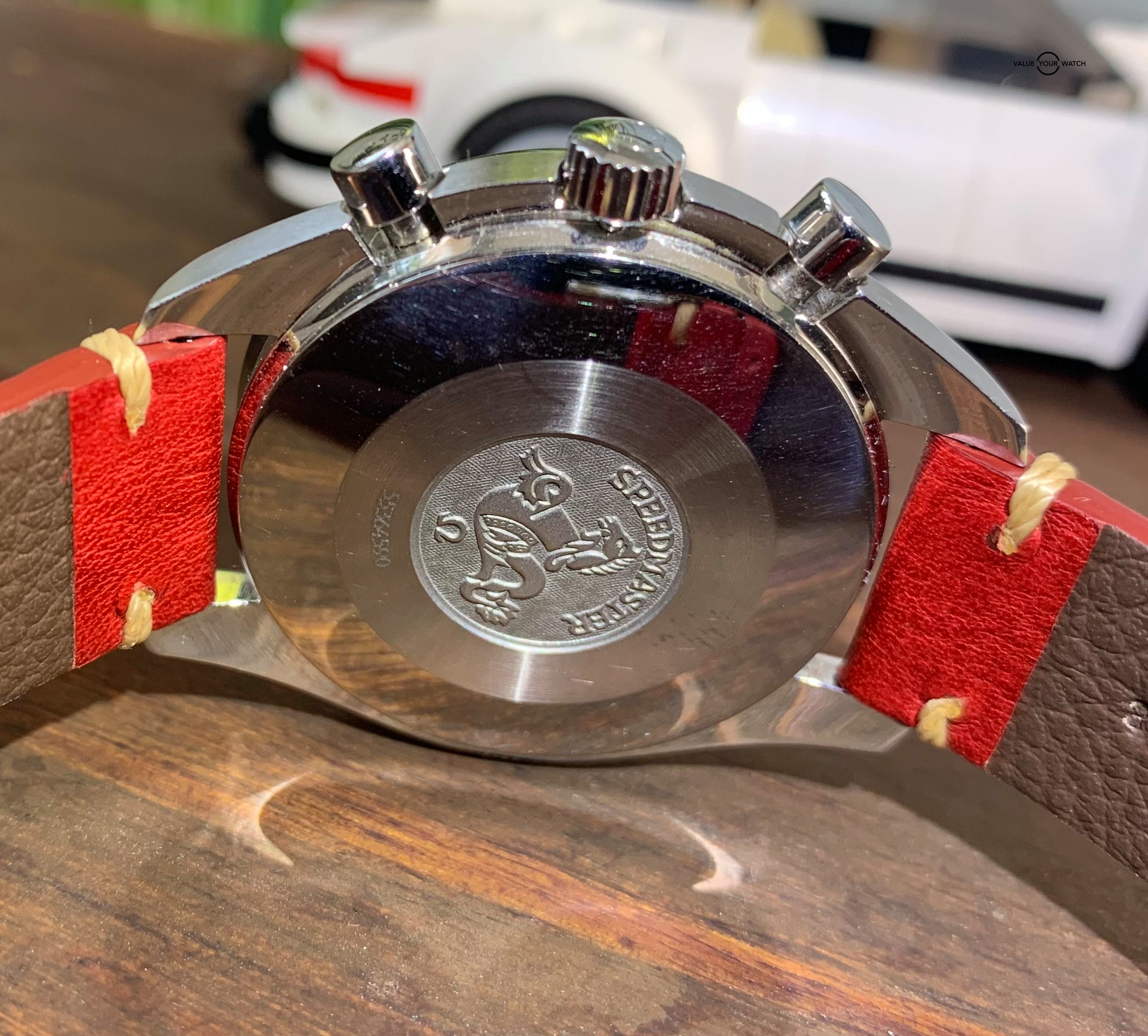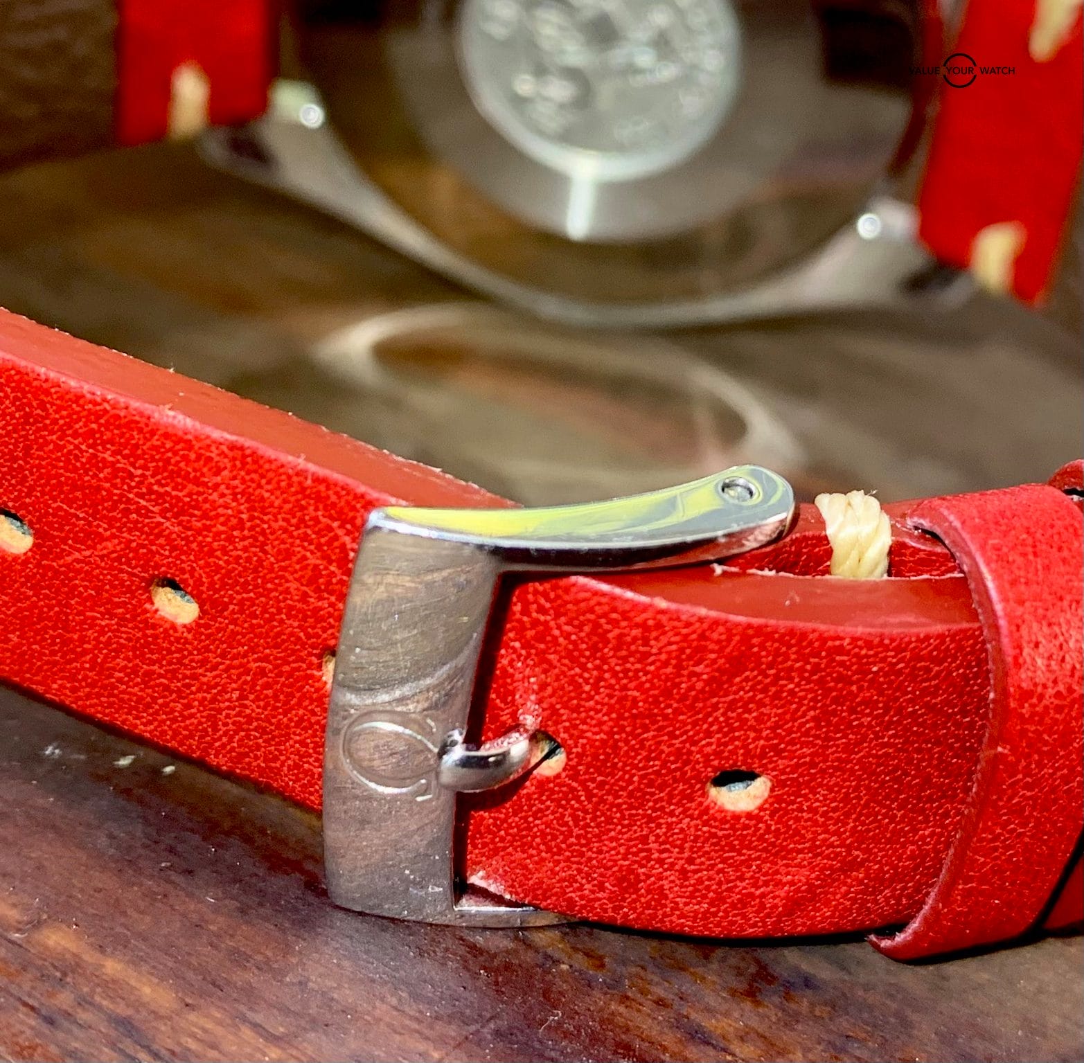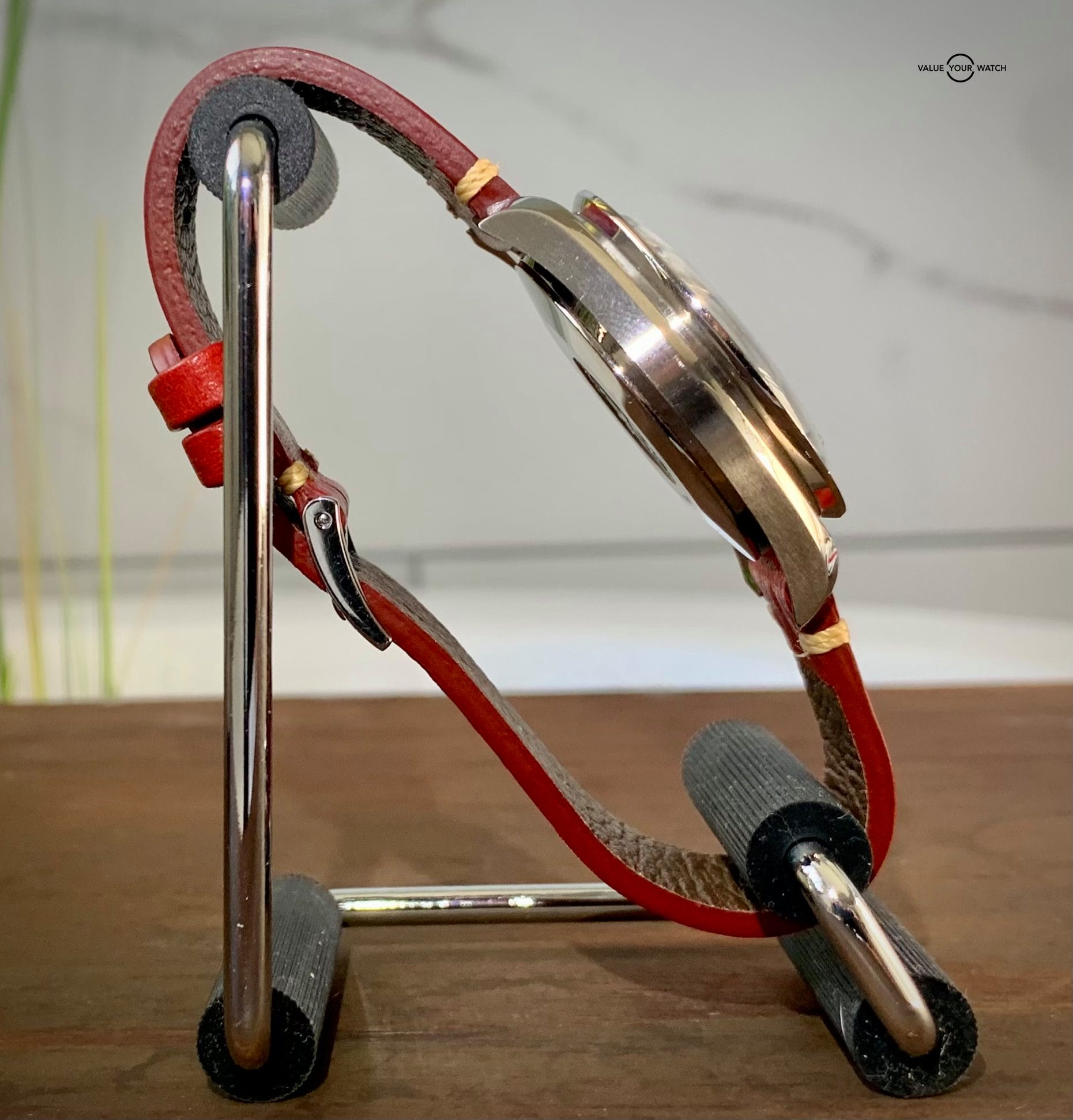 The Omega Speedmaster Michael Schumacher LE run of this watch was in the late 90s and most of the complete kits have all but disappeared. Our offering is almost a complete kit as it is just missing the warranty card. The watch comes with Outer box, Inner F1 tire box, and instruction manual, and warranty card. To sweeten the deal we have included an uncle seiko 1171 bracelet to go with the already beautiful Red leather strap!!
