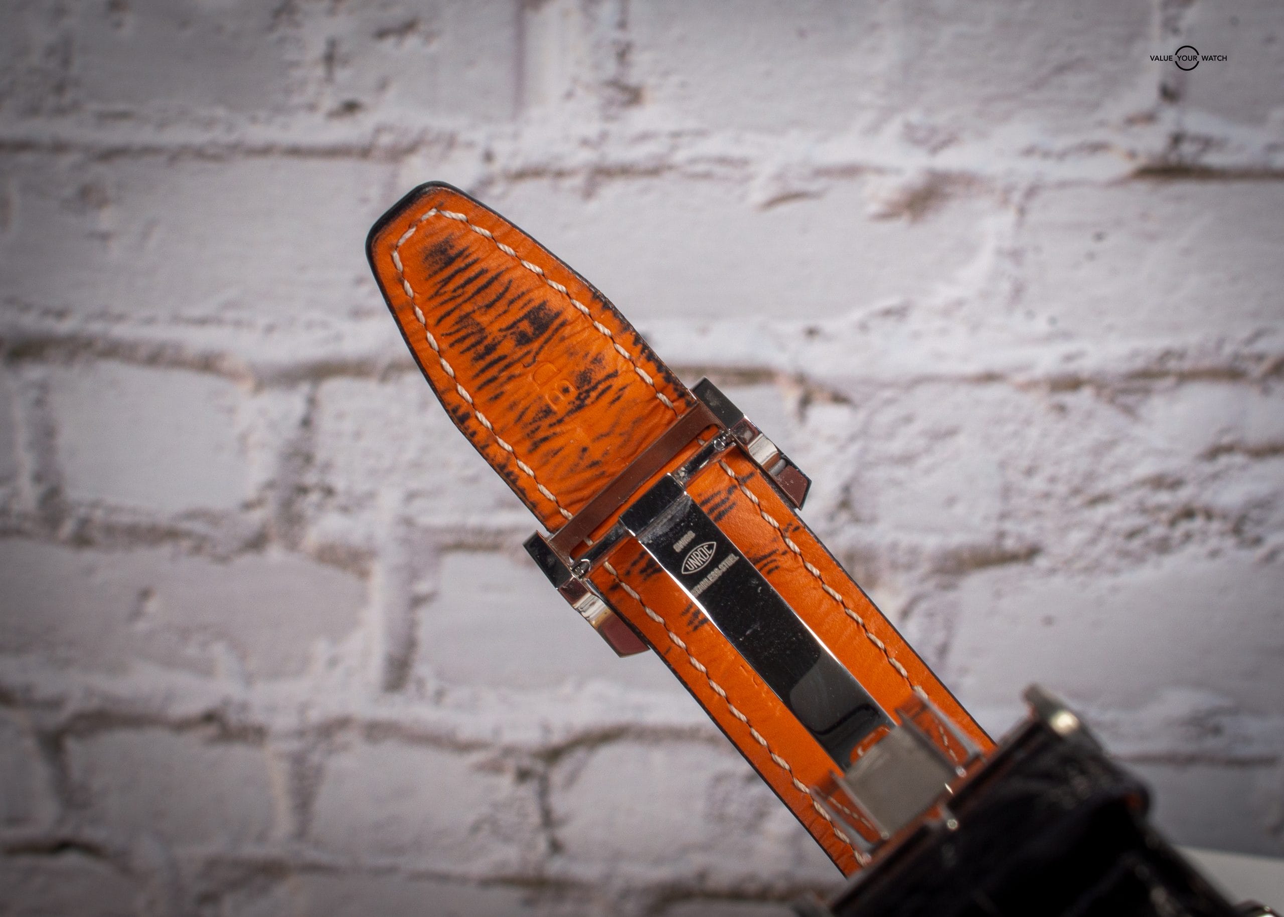 watch is running well with no issues and the crystal is clean with no nicks or scratches that I can see. The case has minimal wear that is more evident on the polished sections of the case and lugs. Some light marks on the brushed ends of the case and clasp as well. The black side of the strap is in excellent condition with some minor staining on the inside. New OEM strap is included as a backup. Feel free to reach out if any additional pictures or videos are required.