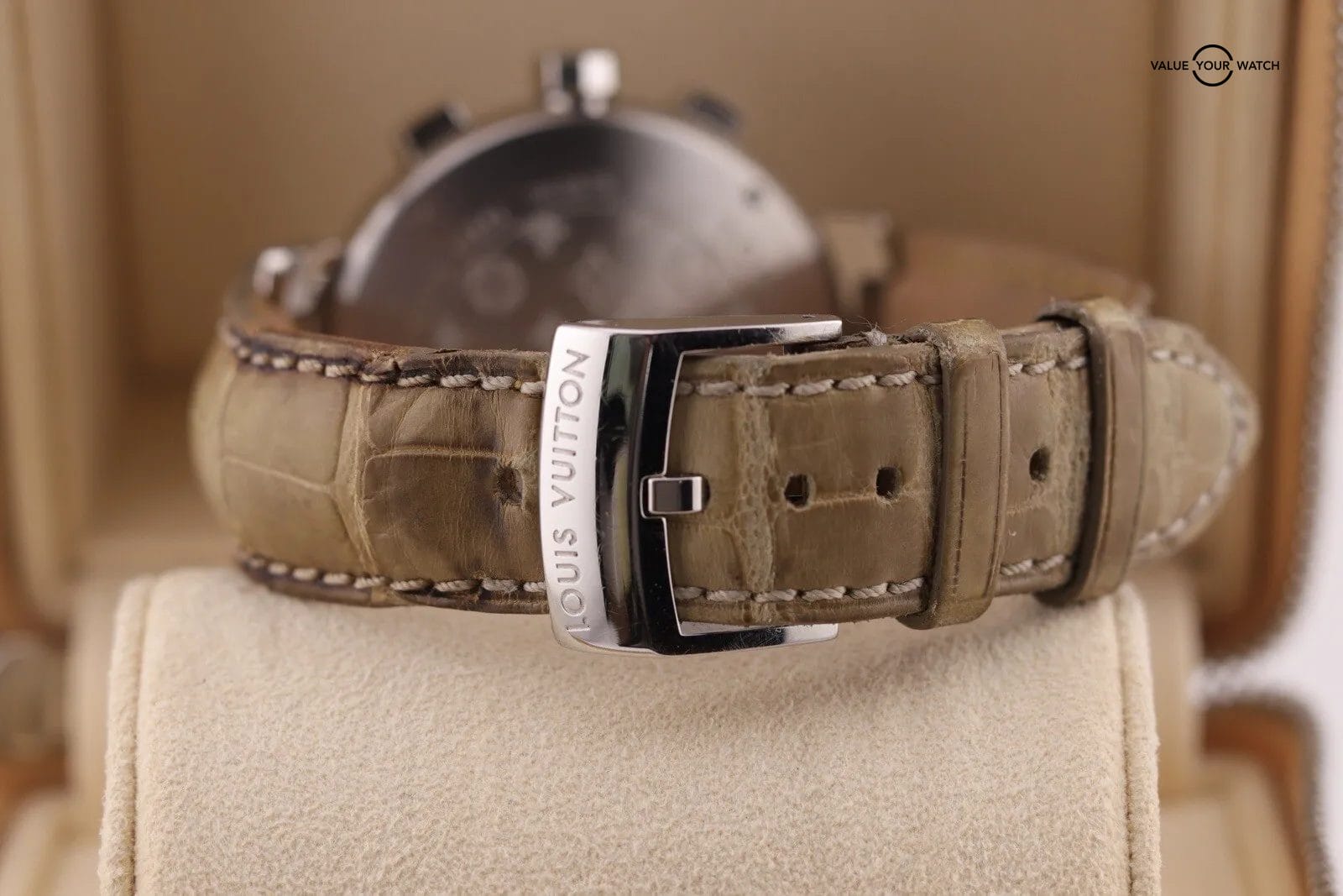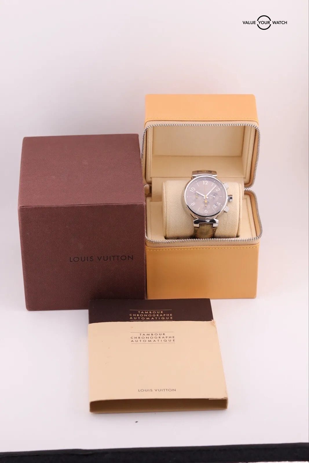 Elevate your style with this exquisite Louis Vuitton Tambour Chronograph men’s watch, model Q1121. Crafted with precision, this watch boasts a mechanical (automatic) movement and a sleek stainless steel case color. The brown dial color and leather band material add to its overall elegance. This watch is a perfect blend of sophistication and functionality, featuring a chronograph and a reference number of Q1121. It’s a complete set that’s ideal for any wristwatch collector or fashion enthusiast.