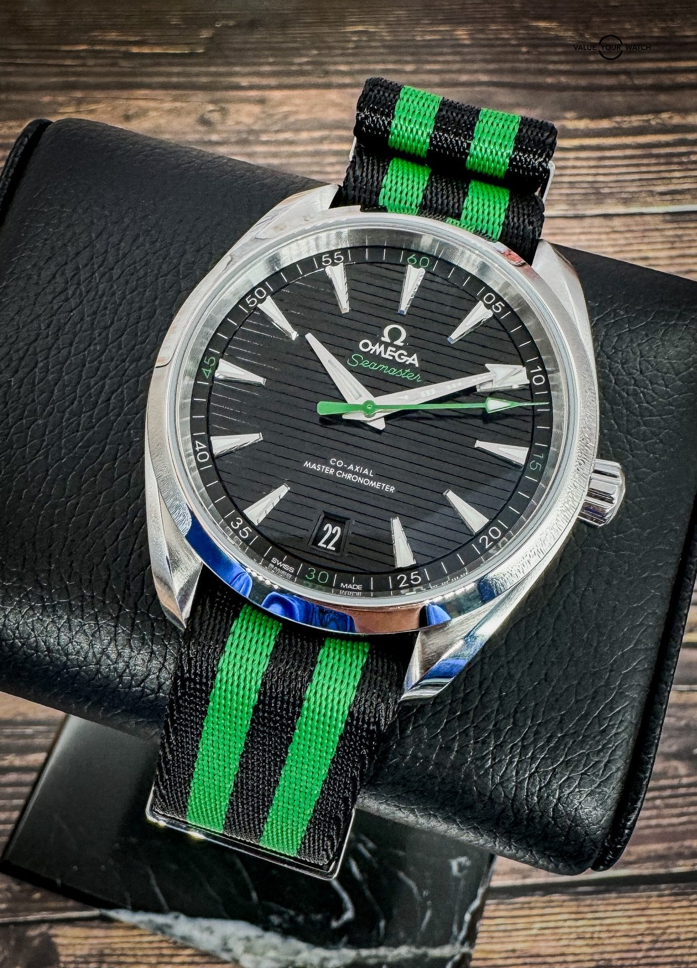 Offered by NoVA Watch Supply of Fairfax, VA: A very good condition Omega Seamaster Aqua Terra 150M 41mm Steel on NATO Strap – 220.12.41.21.01.002. This is a special Golf Edition of the classic Omega Aqua Terra design, but with the numerous color variations available in the Aqua Terra line up, this special Golf Edition with contrasting green accents is a fun way to add a little color variety to an Omega collection. The choice of Sergio Garcia, this Seamaster Aqua Terra “Golf Edition” model features a symmetrical case in stainless steel, with a wave-edged design featured on the back. The design includes a sunbrushed black dial distinguished by a horizontal “teak” pattern as well as a date window at 6 o’clock and rhodium-plated hands and indexes filled with white Super-LumiNova. Green is used for the central seconds hand, the “Seamaster” wording and the four quarter numbers on the minute track. In addition to all that, this piece comes with the following:
