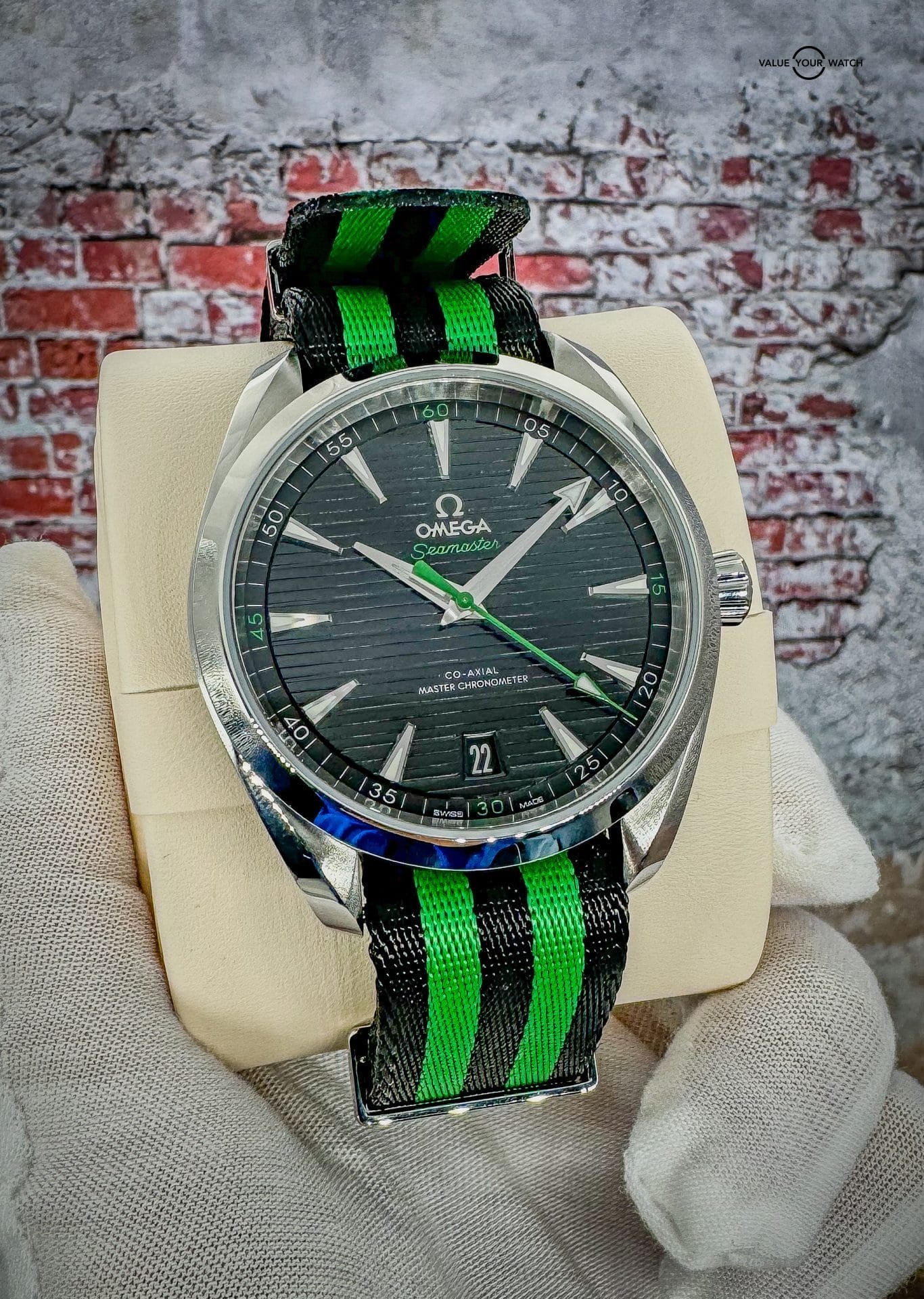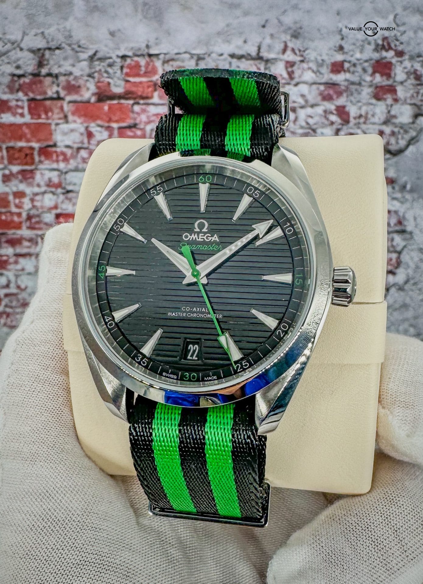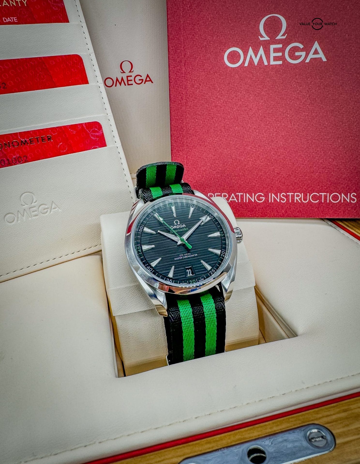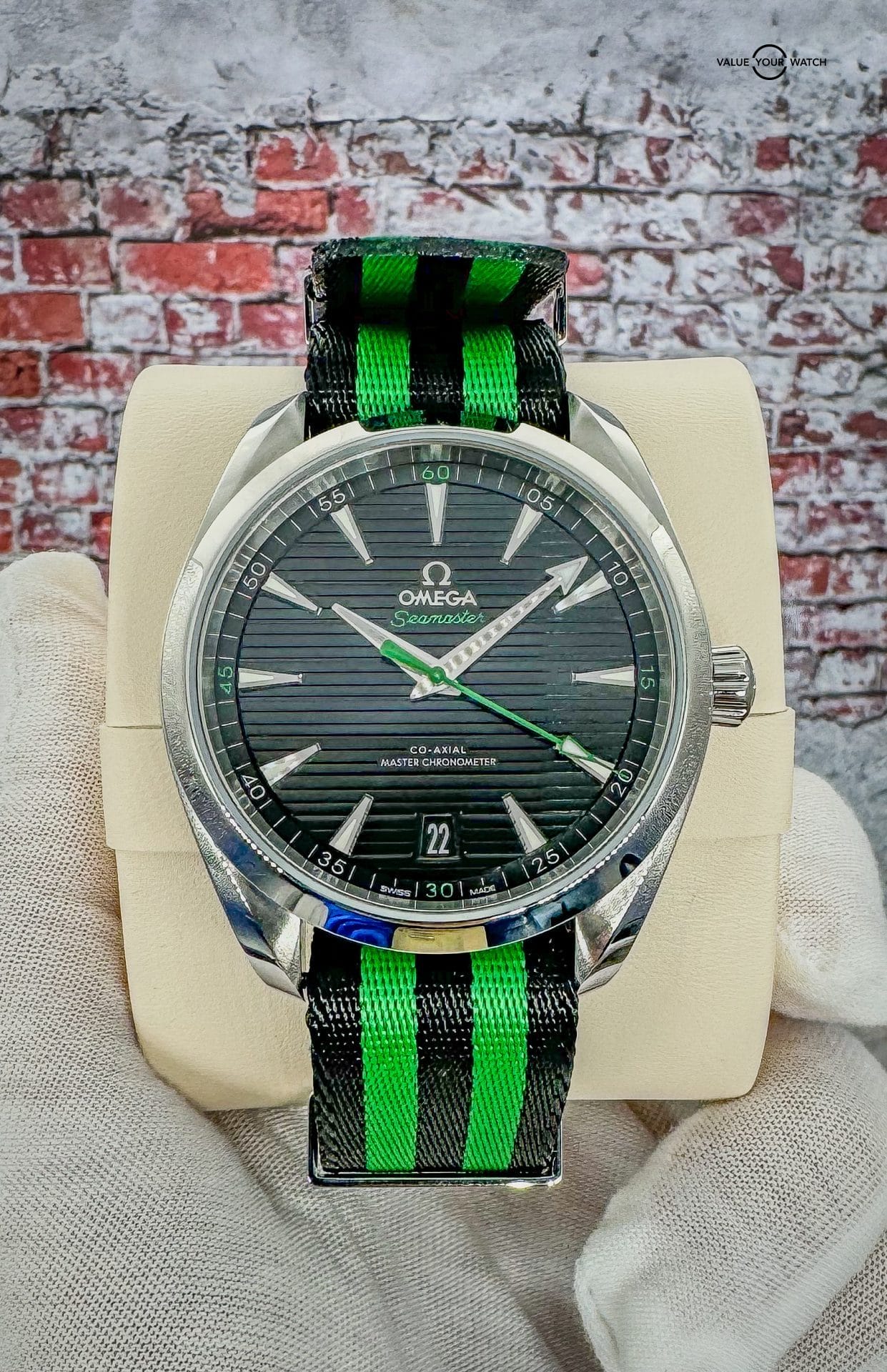 Offered by NoVA Watch Supply of Fairfax, VA: A very good condition Omega Seamaster Aqua Terra 150M 41mm Steel on NATO Strap – 220.12.41.21.01.002. This is a special Golf Edition of the classic Omega Aqua Terra design, but with the numerous color variations available in the Aqua Terra line up, this special Golf Edition with contrasting green accents is a fun way to add a little color variety to an Omega collection. The choice of Sergio Garcia, this Seamaster Aqua Terra “Golf Edition” model features a symmetrical case in stainless steel, with a wave-edged design featured on the back. The design includes a sunbrushed black dial distinguished by a horizontal “teak” pattern as well as a date window at 6 o’clock and rhodium-plated hands and indexes filled with white Super-LumiNova. Green is used for the central seconds hand, the “Seamaster” wording and the four quarter numbers on the minute track. In addition to all that, this piece comes with the following: