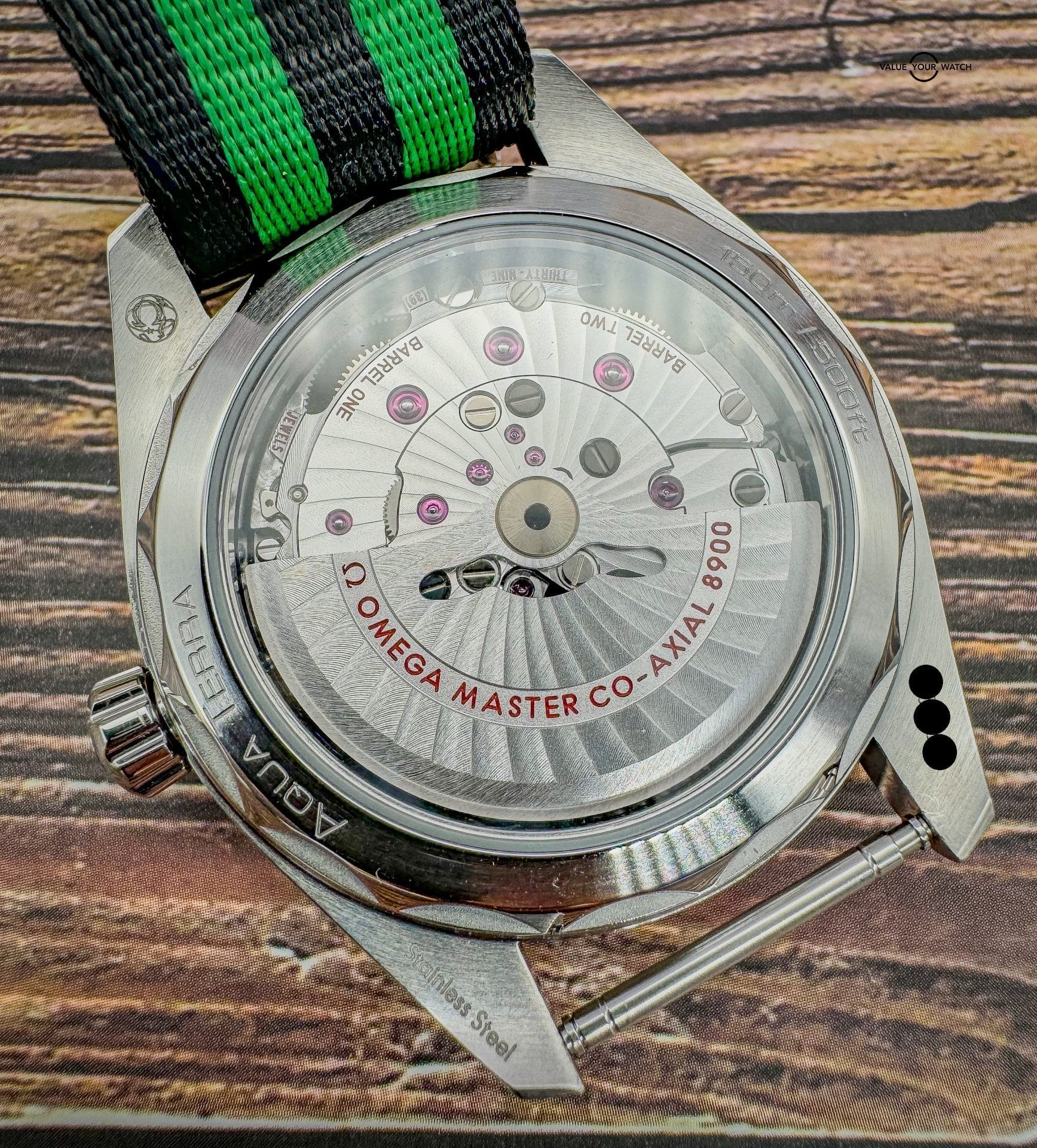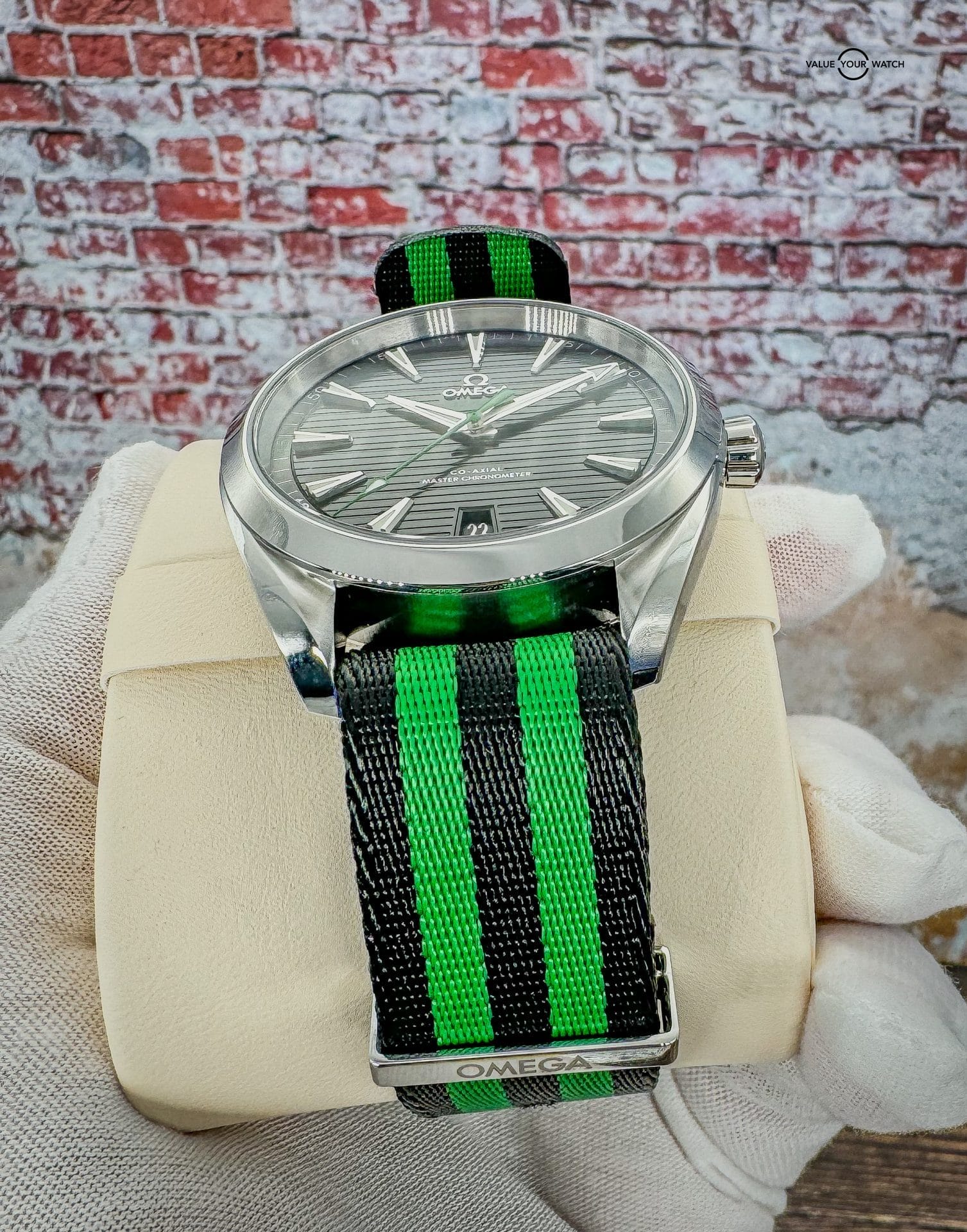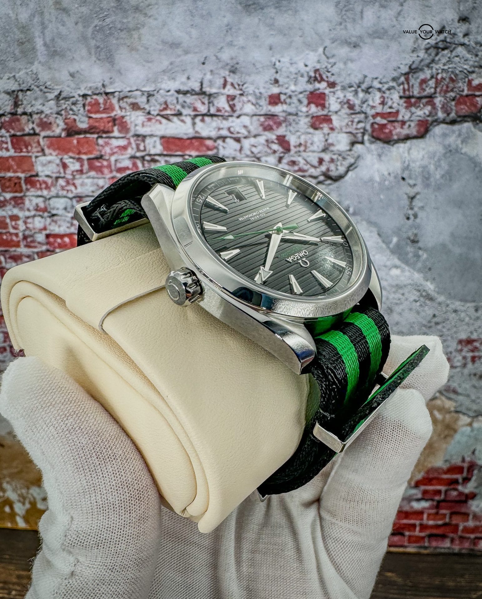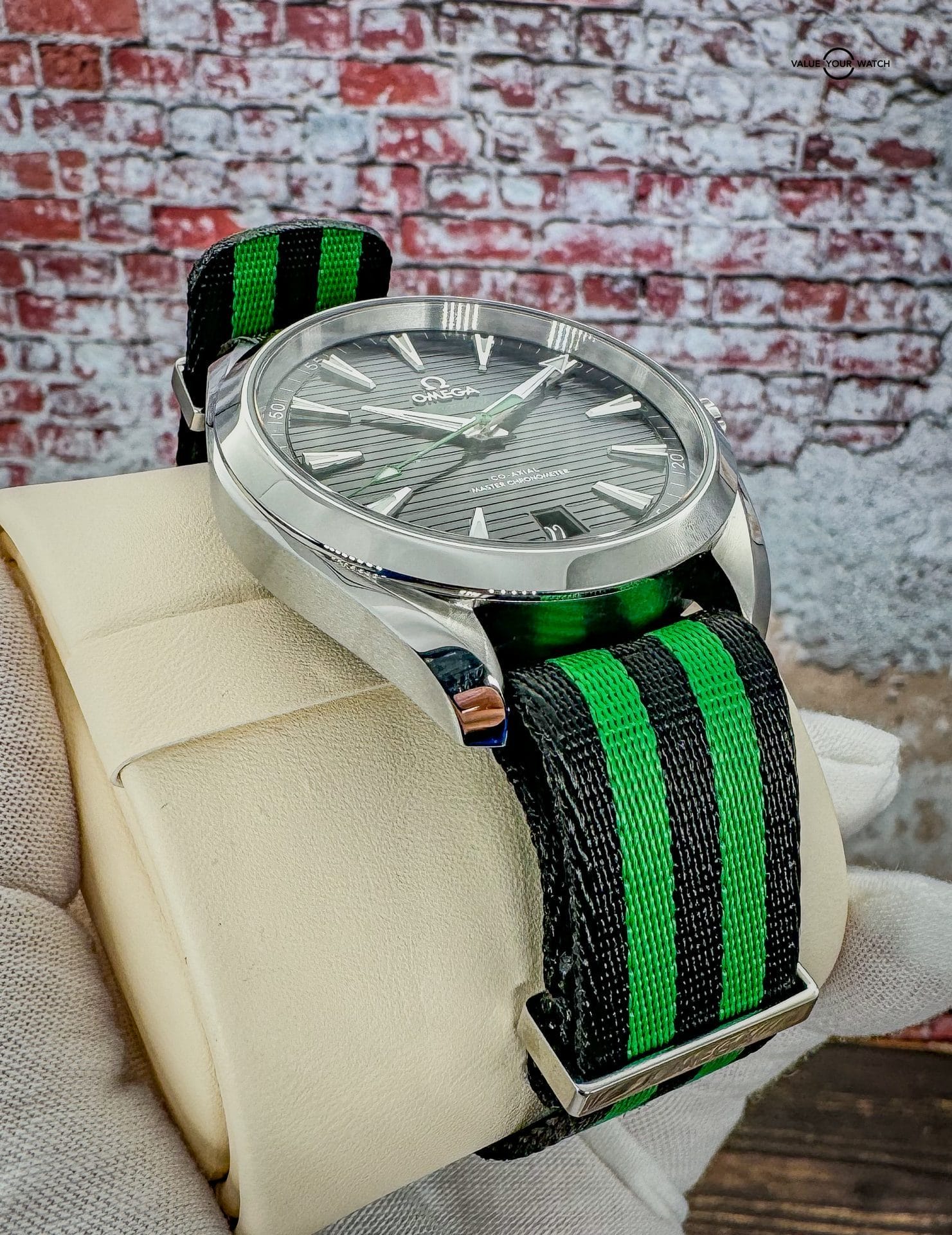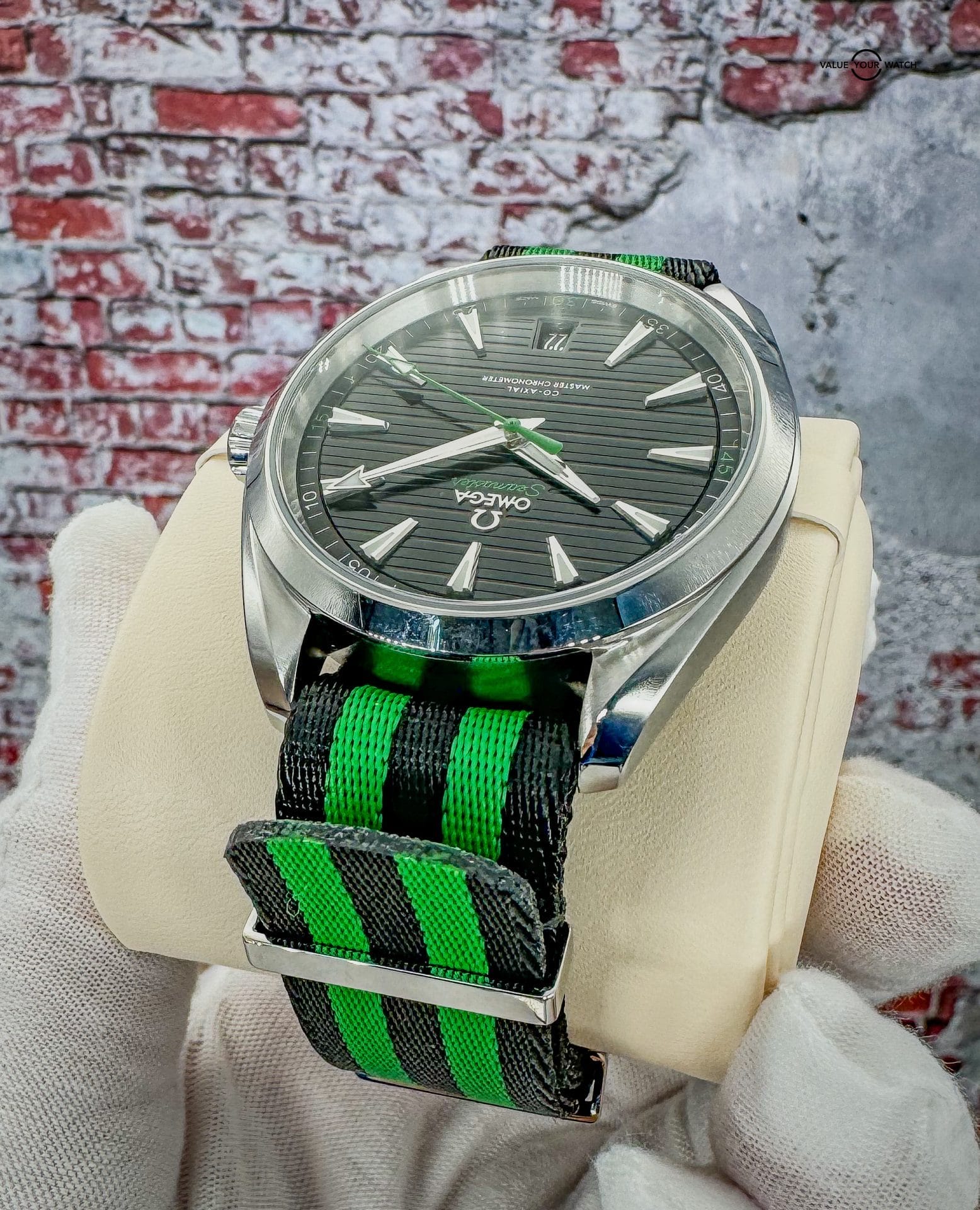 Offered by NoVA Watch Supply of Fairfax, VA: A very good condition Omega Seamaster Aqua Terra 150M 41mm Steel on NATO Strap – 220.12.41.21.01.002. This is a special Golf Edition of the classic Omega Aqua Terra design, but with the numerous color variations available in the Aqua Terra line up, this special Golf Edition with contrasting green accents is a fun way to add a little color variety to an Omega collection. The choice of Sergio Garcia, this Seamaster Aqua Terra “Golf Edition” model features a symmetrical case in stainless steel, with a wave-edged design featured on the back. The design includes a sunbrushed black dial distinguished by a horizontal “teak” pattern as well as a date window at 6 o’clock and rhodium-plated hands and indexes filled with white Super-LumiNova. Green is used for the central seconds hand, the “Seamaster” wording and the four quarter numbers on the minute track. In addition to all that, this piece comes with the following: