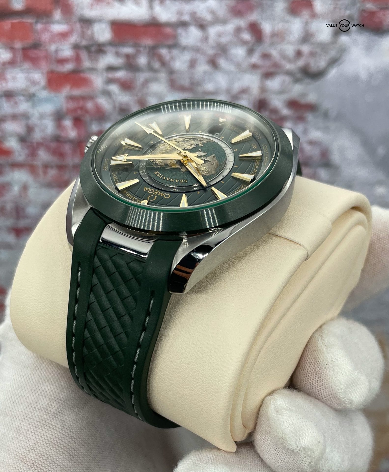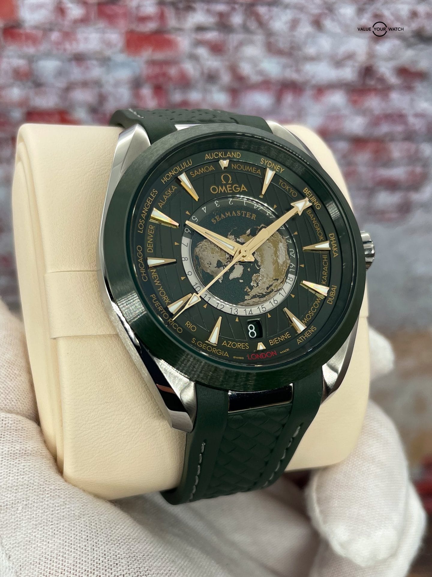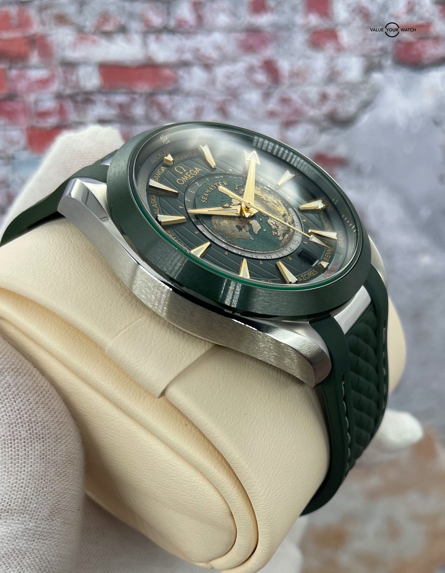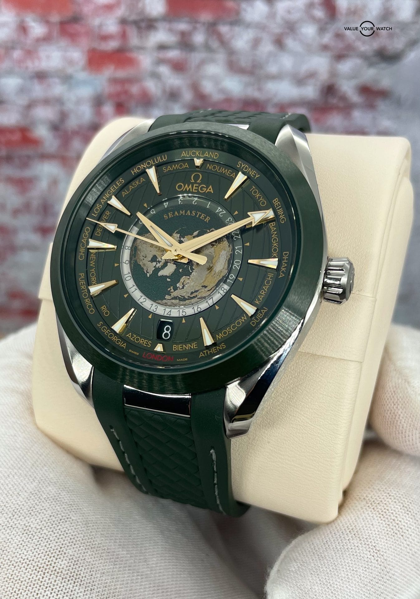 Offered by NoVA Watch Supply of Fairfax, VA: An excellent condition Omega Seamaster Aqua Terra 150M Co‑Axial Master Chronometer GMT Worldtimer 43mm watch REF. 220.30.43.22.10.001. This is an absolutely amazing piece with enough detail in the dial to keep your attention for an entire trip around the world. The detail on this 43 mm Worldtimer dial is a vision of Earth, viewed from above the North Pole, created by laser-ablating continents and colours on a grade 5 titanium surface. Circling the topographic map is a 24-hour indication, divided into night and day sections. OMEGA’s home city of Bienne Switzerland is among the many global destinations circling around the dial and its outer ring. All place names, with the exception of the British capital are coloured yellow gold. London is in red to highlight Greenwich Mean Time, now more formally known as Universal Time Coordinated (UTC). All this cased in stainless steel with a sun-brushed green dial and polished-brushed green ceramic bezel with an integrated strap in green rubber, with additional decorative link and clasp in polished steel. To complement the green colour of the dial, OMEGA has presented the World times measure by hands and indexes in 18K Moonshine Gold. Powering the watch is OMEGA’s Co-Axial Master Chronometer Calibre 8938. Truly a work of art, both inside and out. The perfect piece for a world traveler, someone who works internationally, or someone who simply appreciates the finer elements of life. This piece comes with the following: