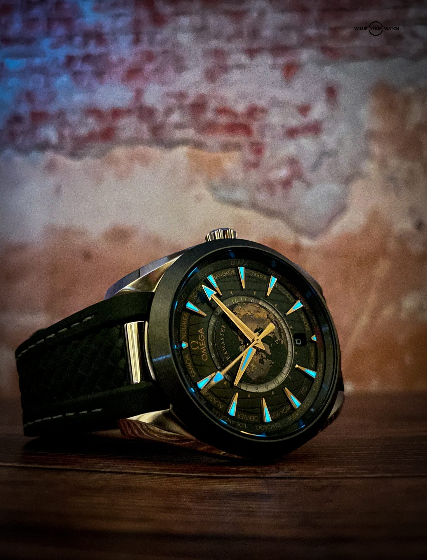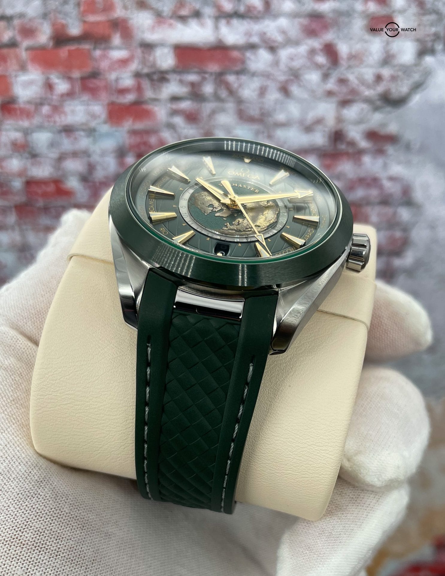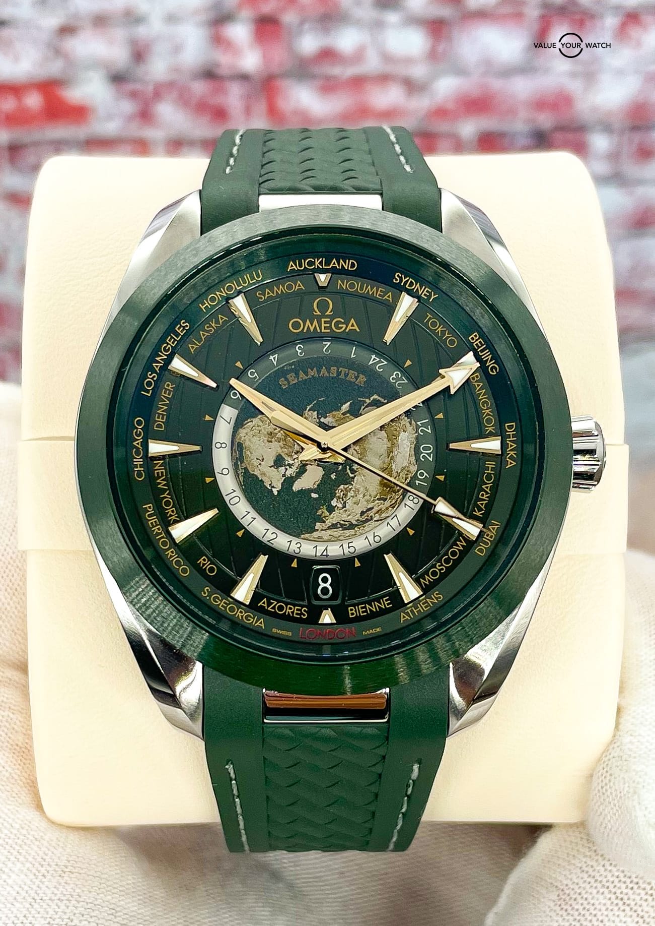 Offered by NoVA Watch Supply of Fairfax, VA: An excellent condition Omega Seamaster Aqua Terra 150M Co‑Axial Master Chronometer GMT Worldtimer 43mm watch REF. 220.30.43.22.10.001. This is an absolutely amazing piece with enough detail in the dial to keep your attention for an entire trip around the world. The detail on this 43 mm Worldtimer dial is a vision of Earth, viewed from above the North Pole, created by laser-ablating continents and colours on a grade 5 titanium surface. Circling the topographic map is a 24-hour indication, divided into night and day sections. OMEGA’s home city of Bienne Switzerland is among the many global destinations circling around the dial and its outer ring. All place names, with the exception of the British capital are coloured yellow gold. London is in red to highlight Greenwich Mean Time, now more formally known as Universal Time Coordinated (UTC). All this cased in stainless steel with a sun-brushed green dial and polished-brushed green ceramic bezel with an integrated strap in green rubber, with additional decorative link and clasp in polished steel. To complement the green colour of the dial, OMEGA has presented the World times measure by hands and indexes in 18K Moonshine Gold. Powering the watch is OMEGA’s Co-Axial Master Chronometer Calibre 8938. Truly a work of art, both inside and out. The perfect piece for a world traveler, someone who works internationally, or someone who simply appreciates the finer elements of life. This piece comes with the following: