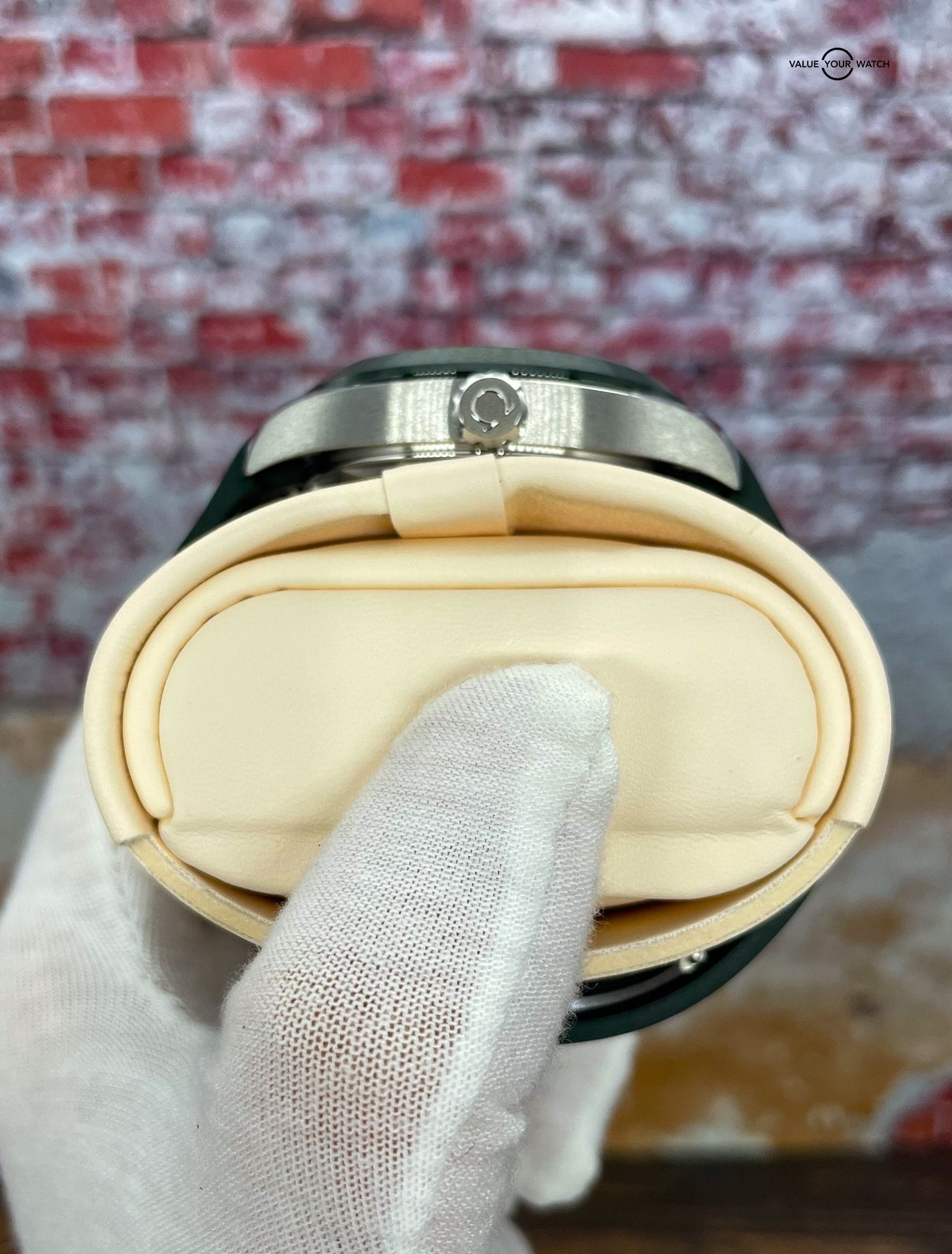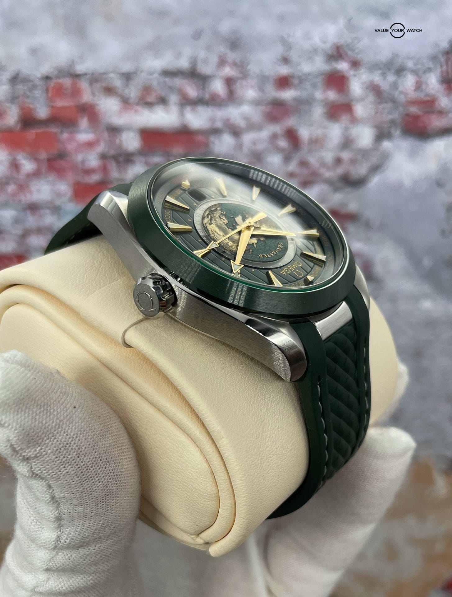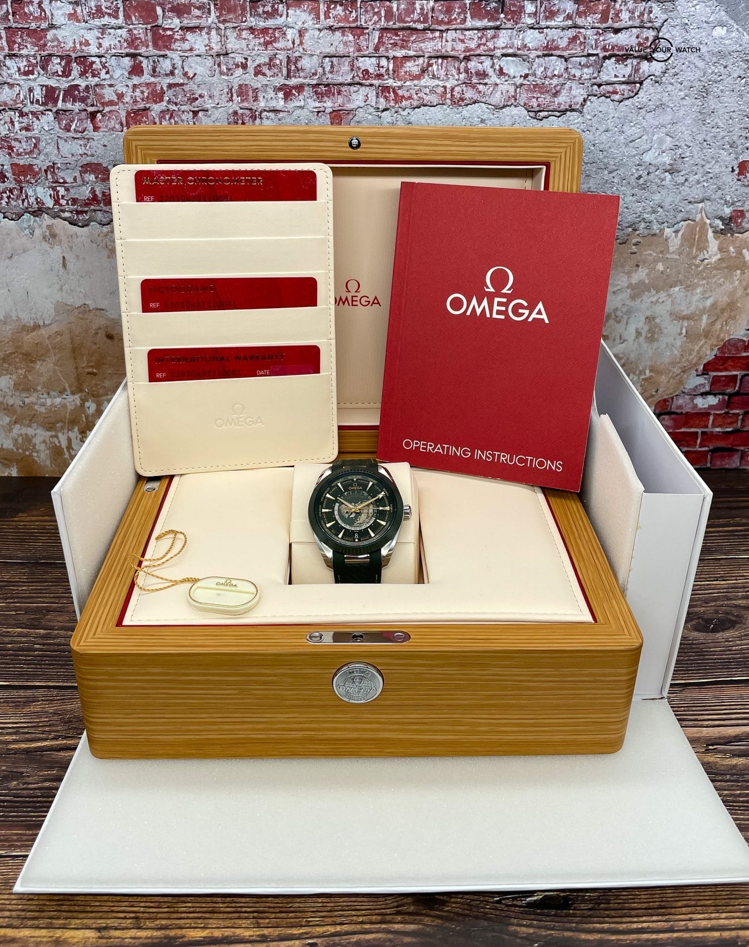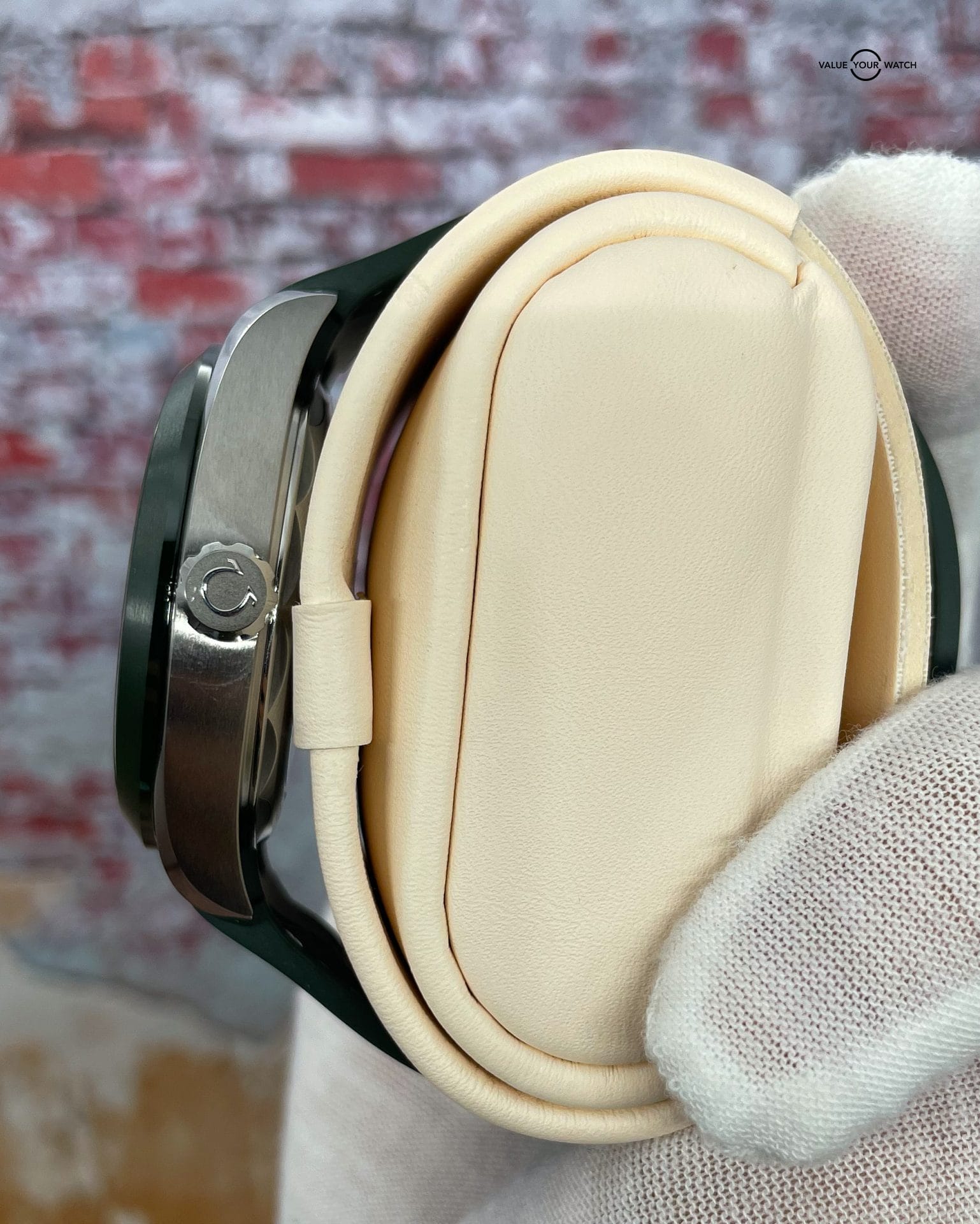 Offered by NoVA Watch Supply of Fairfax, VA: An excellent condition Omega Seamaster Aqua Terra 150M Co‑Axial Master Chronometer GMT Worldtimer 43mm watch REF. 220.30.43.22.10.001. This is an absolutely amazing piece with enough detail in the dial to keep your attention for an entire trip around the world. The detail on this 43 mm Worldtimer dial is a vision of Earth, viewed from above the North Pole, created by laser-ablating continents and colours on a grade 5 titanium surface. Circling the topographic map is a 24-hour indication, divided into night and day sections. OMEGA’s home city of Bienne Switzerland is among the many global destinations circling around the dial and its outer ring. All place names, with the exception of the British capital are coloured yellow gold. London is in red to highlight Greenwich Mean Time, now more formally known as Universal Time Coordinated (UTC). All this cased in stainless steel with a sun-brushed green dial and polished-brushed green ceramic bezel with an integrated strap in green rubber, with additional decorative link and clasp in polished steel. To complement the green colour of the dial, OMEGA has presented the World times measure by hands and indexes in 18K Moonshine Gold. Powering the watch is OMEGA’s Co-Axial Master Chronometer Calibre 8938. Truly a work of art, both inside and out. The perfect piece for a world traveler, someone who works internationally, or someone who simply appreciates the finer elements of life. This piece comes with the following: