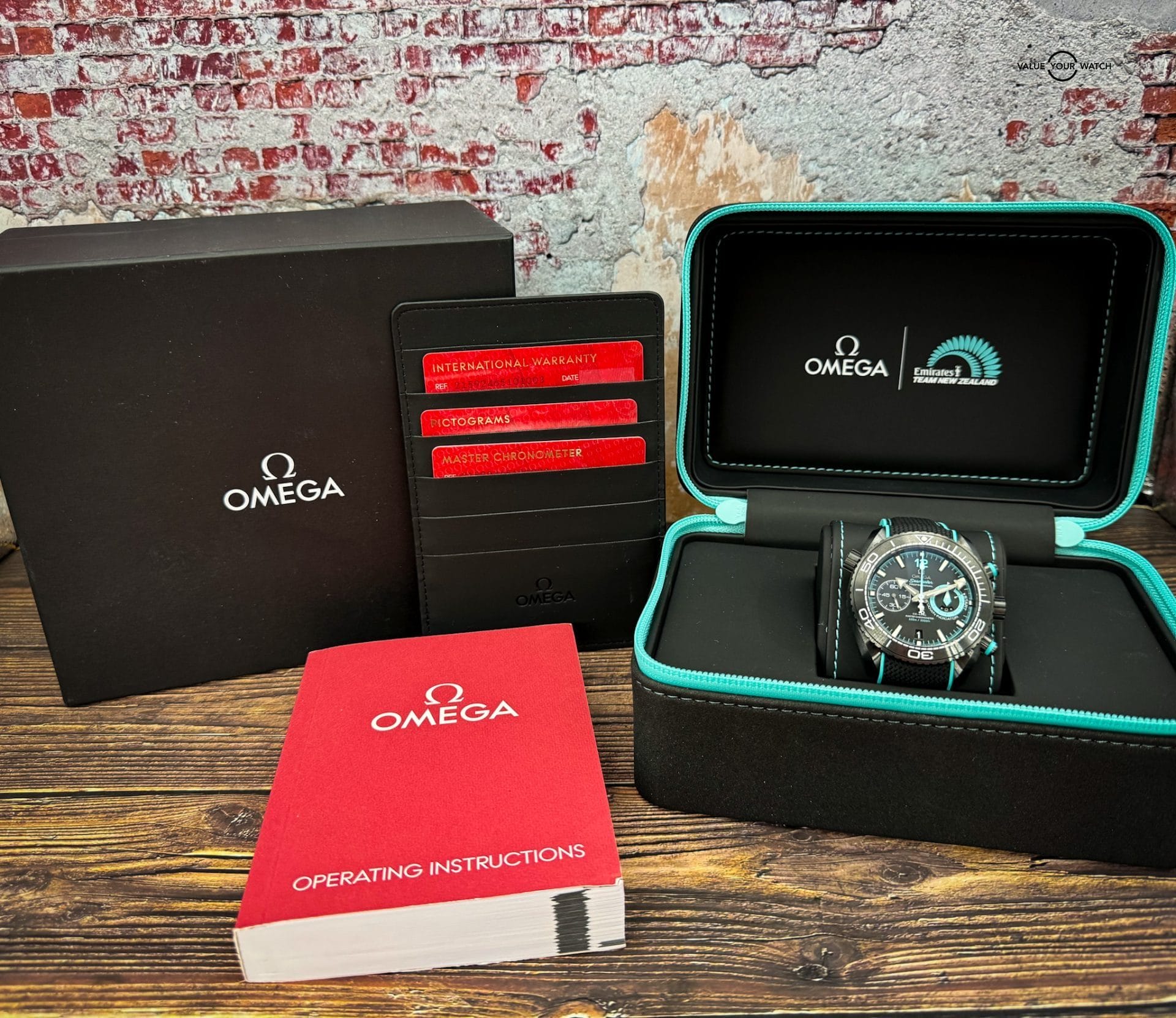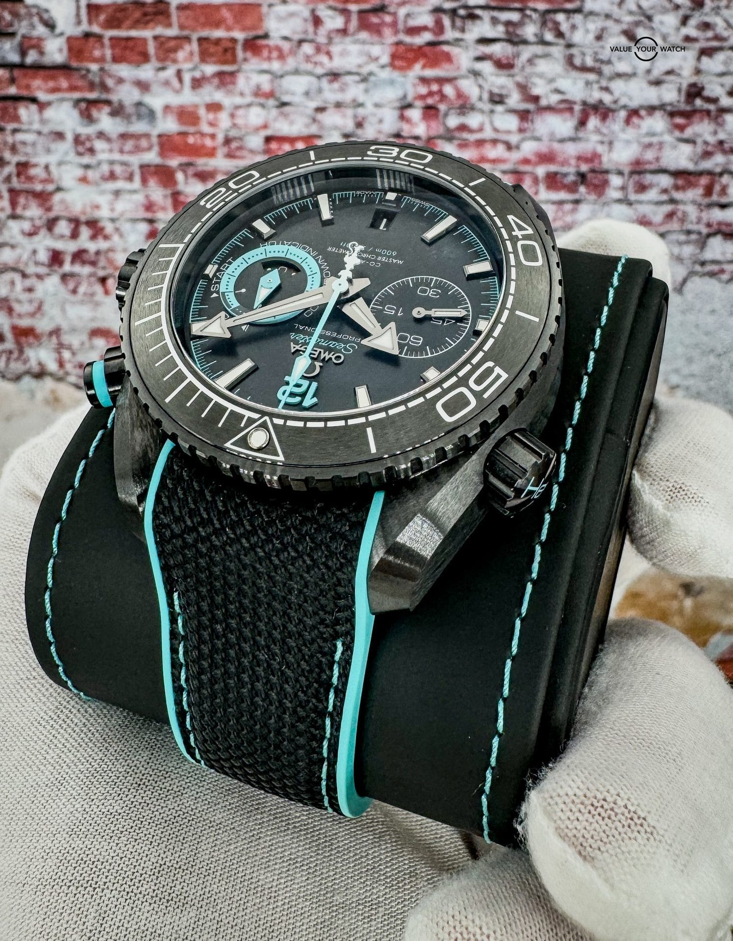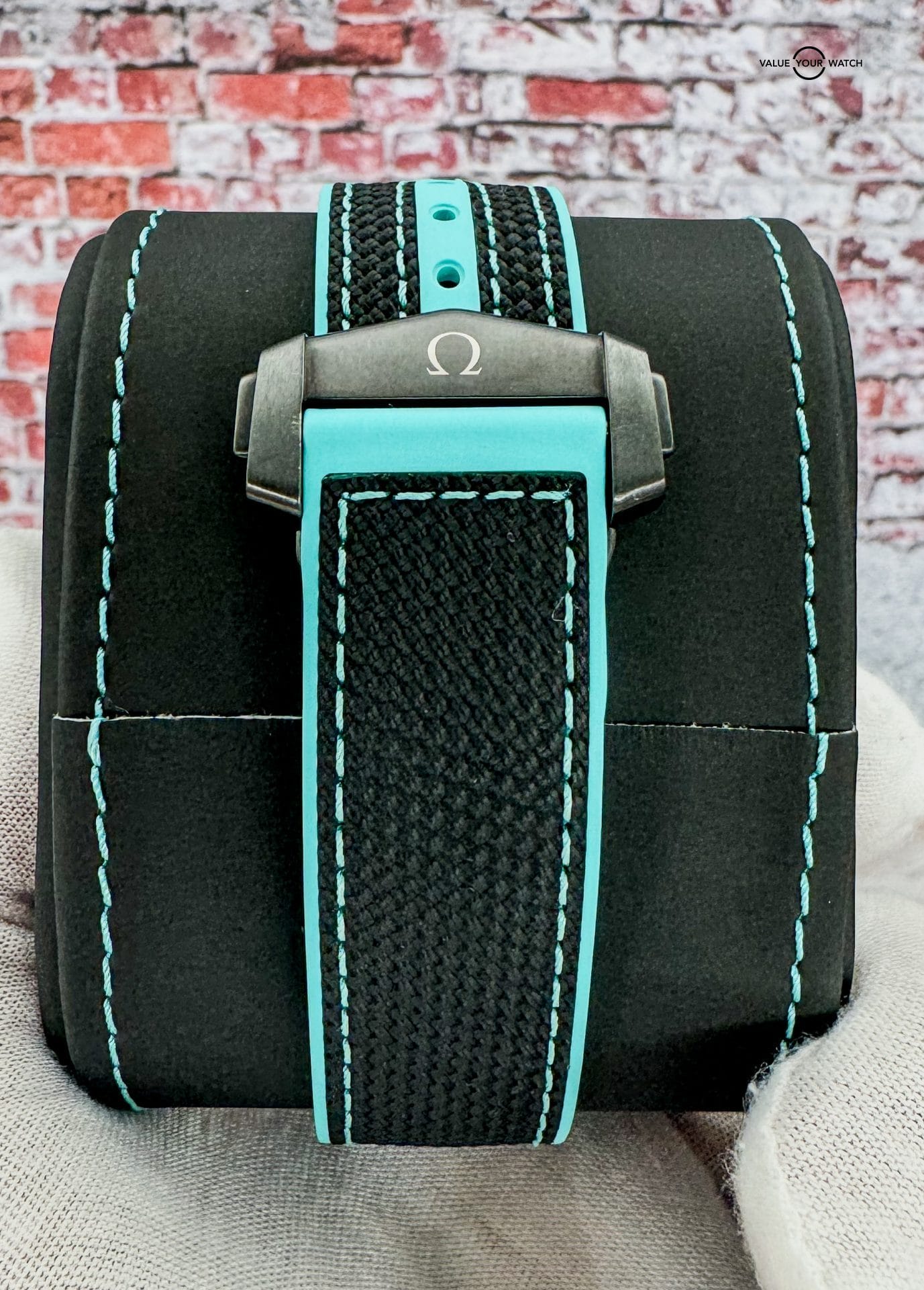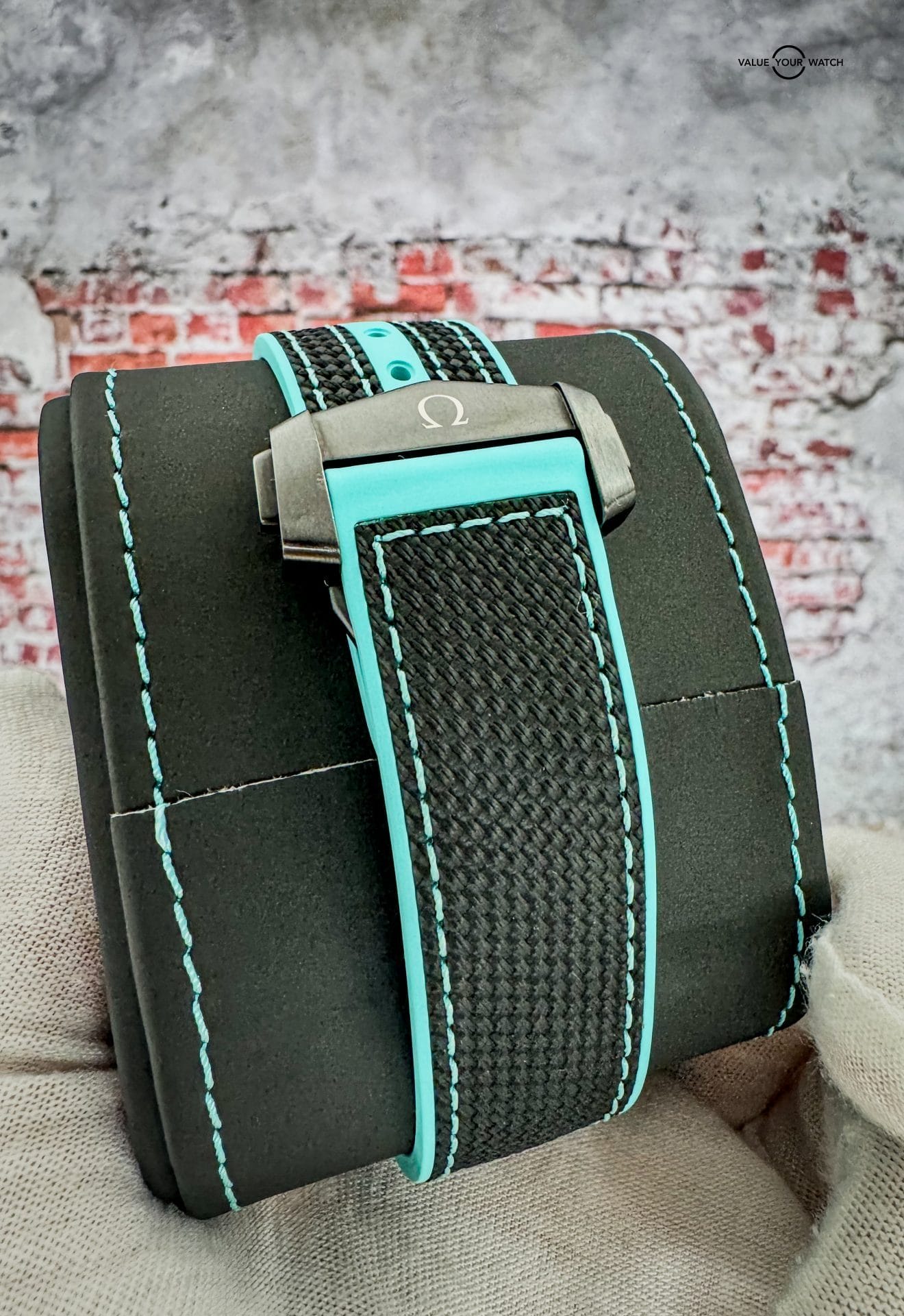 Offered by NoVA Watch Supply of Fairfax, VA: An excellent condition Omega Seamaster Planet Ocean 600M Black Ceramic ETNZ Deep Black edition watch REF. 215.92.46.51.01.003. Whether you’re a fan of the Kiwi Crew of ETNZ, or simply obsessed with Tiffany colorway watches, this variation of the planet ocean is proving to be one of most sought after special edition Omegas in some time and is now SOLD OUT at Omega. The story behind this 45.5 mm work of art is that its a tribute piece to the defenders of the 37th America’s Cup blending the deepest black with the turquoise of the Emirates Team New Zealand logo. Complementing the black ceramic case is a unidirectional bezel in brushed black ceramic with white enamel diving scale and triangle-framed dot at 12, which includes white Super-LumiNova to emit a green glow in the dark. On the matt ceramic dial, OMEGA has included a nod to pre-race protocol with a COUNTDOWN INDICATOR at 3 o’clock complete with flagged START. The indicator’s hand and subdial ring are in ETNZ logo turquoise, along with the minute track, number 12 and central seconds chronograph hand with America’s Cup trophy counterwatch_case_weight. OMEGA has also included the colour on the rings of the brushed black ceramic pushers, the HE on the helium escape valve and the OMEGA logo on the crown. As a salute to the kiwi crew, the NAIAD LOCK caseback has an Emirates Team New Zealand logo with turquoise fern and white lettering. A black and turquoise structured rubber strap with turquoise stitching and black ceramic clasp fixes the race-ready watch to the wrist, while OMEGA’s Master Chronometer Calibre 9900 provides the power. In addition to all of this, the tribute to the kiwi crew incudes a special presentation box in Emirates Team New Zealand colours as well as the following: