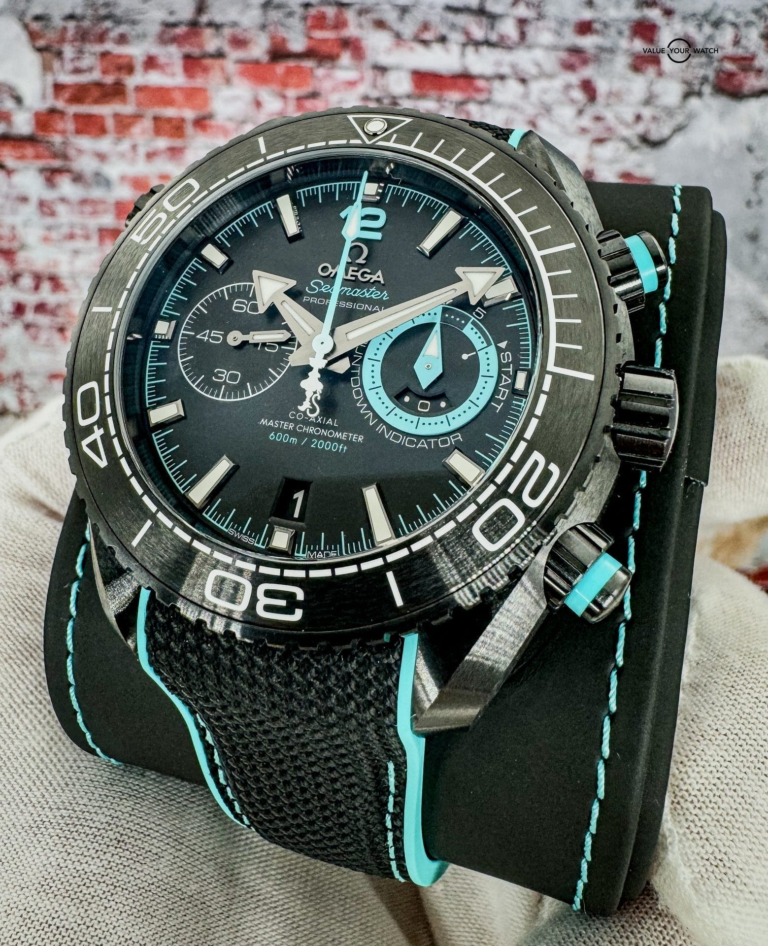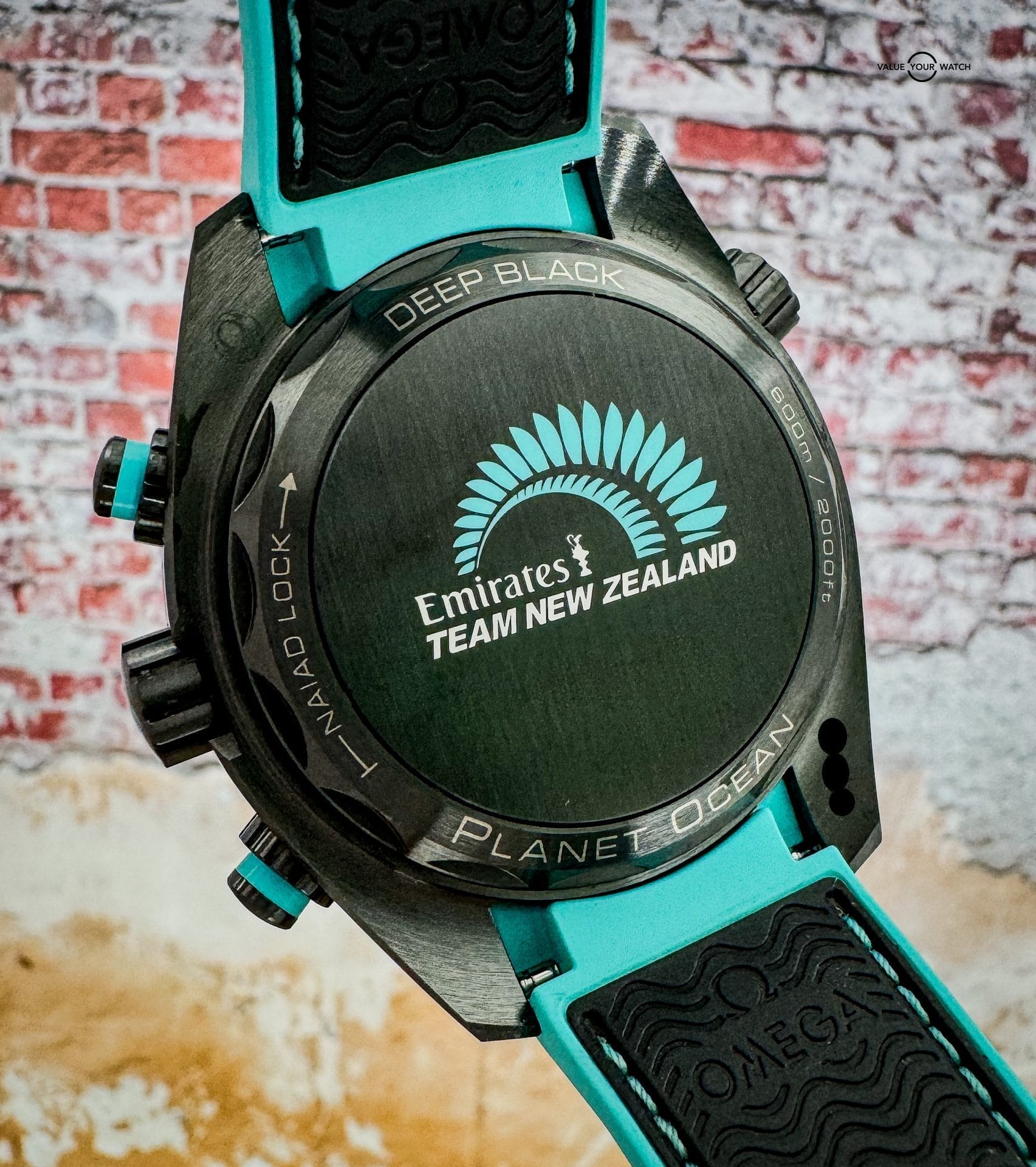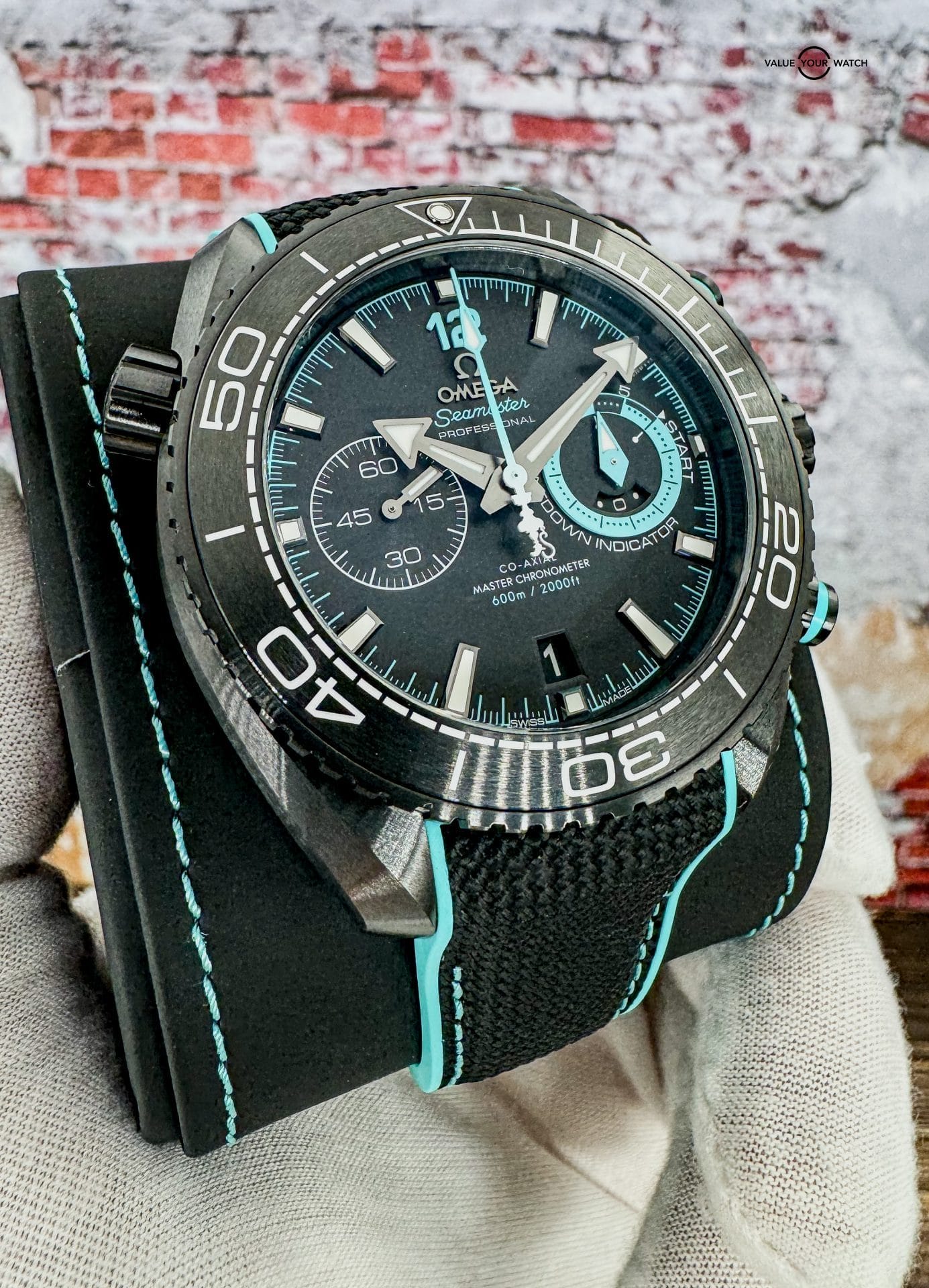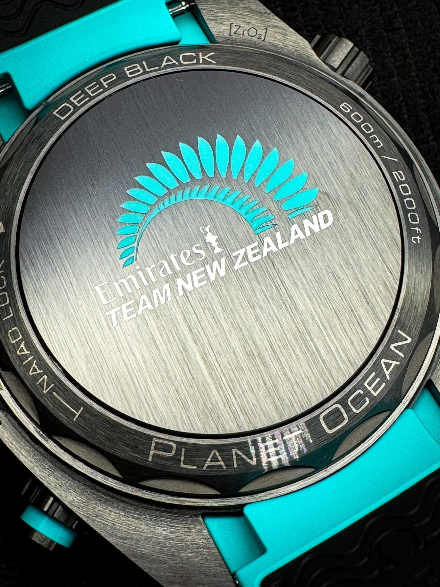 Offered by NoVA Watch Supply of Fairfax, VA: An excellent condition Omega Seamaster Planet Ocean 600M Black Ceramic ETNZ Deep Black edition watch REF. 215.92.46.51.01.003. Whether you’re a fan of the Kiwi Crew of ETNZ, or simply obsessed with Tiffany colorway watches, this variation of the planet ocean is proving to be one of most sought after special edition Omegas in some time and is now SOLD OUT at Omega. The story behind this 45.5 mm work of art is that its a tribute piece to the defenders of the 37th America’s Cup blending the deepest black with the turquoise of the Emirates Team New Zealand logo. Complementing the black ceramic case is a unidirectional bezel in brushed black ceramic with white enamel diving scale and triangle-framed dot at 12, which includes white Super-LumiNova to emit a green glow in the dark. On the matt ceramic dial, OMEGA has included a nod to pre-race protocol with a COUNTDOWN INDICATOR at 3 o’clock complete with flagged START. The indicator’s hand and subdial ring are in ETNZ logo turquoise, along with the minute track, number 12 and central seconds chronograph hand with America’s Cup trophy counterwatch_case_weight. OMEGA has also included the colour on the rings of the brushed black ceramic pushers, the HE on the helium escape valve and the OMEGA logo on the crown. As a salute to the kiwi crew, the NAIAD LOCK caseback has an Emirates Team New Zealand logo with turquoise fern and white lettering. A black and turquoise structured rubber strap with turquoise stitching and black ceramic clasp fixes the race-ready watch to the wrist, while OMEGA’s Master Chronometer Calibre 9900 provides the power. In addition to all of this, the tribute to the kiwi crew incudes a special presentation box in Emirates Team New Zealand colours as well as the following: