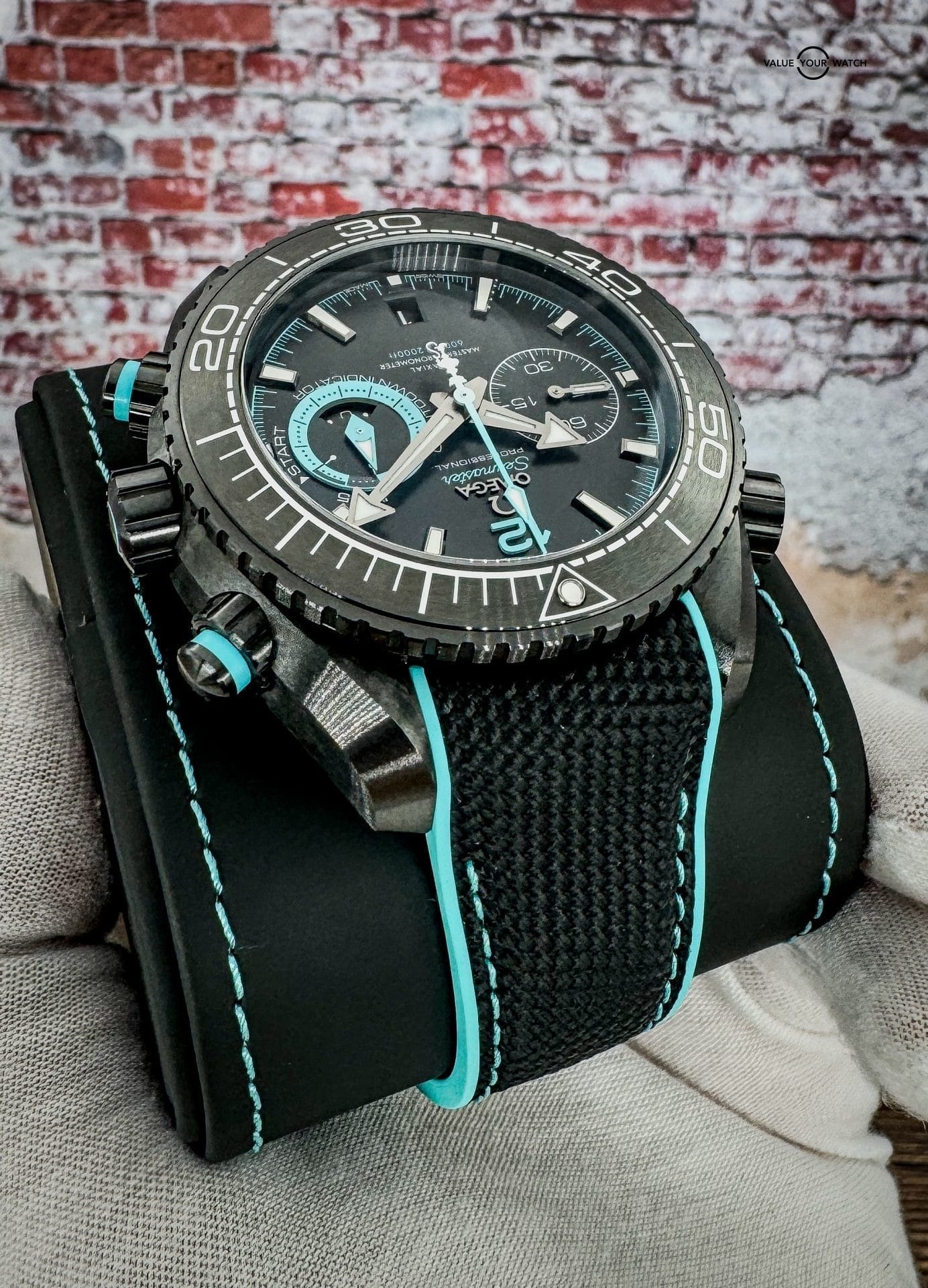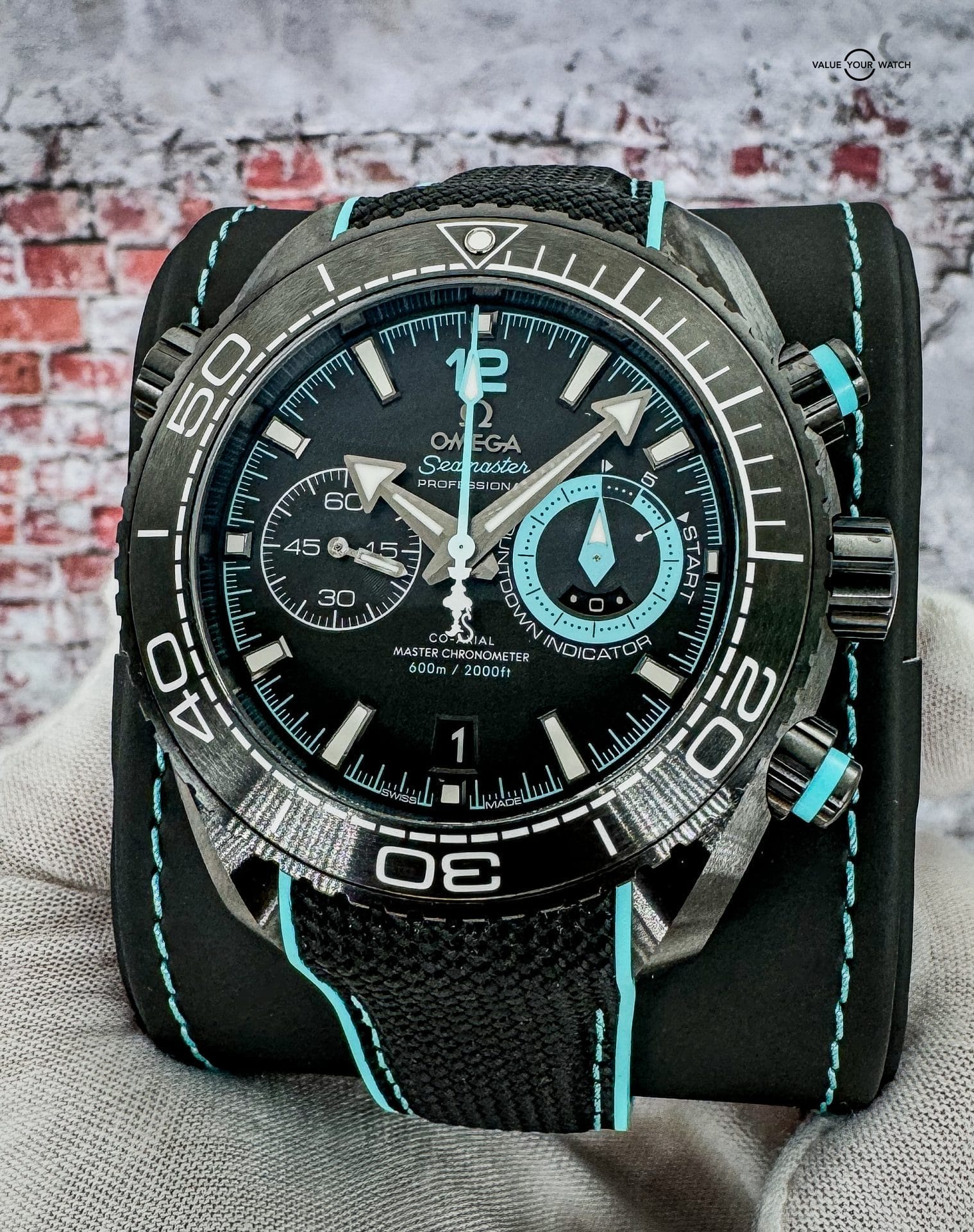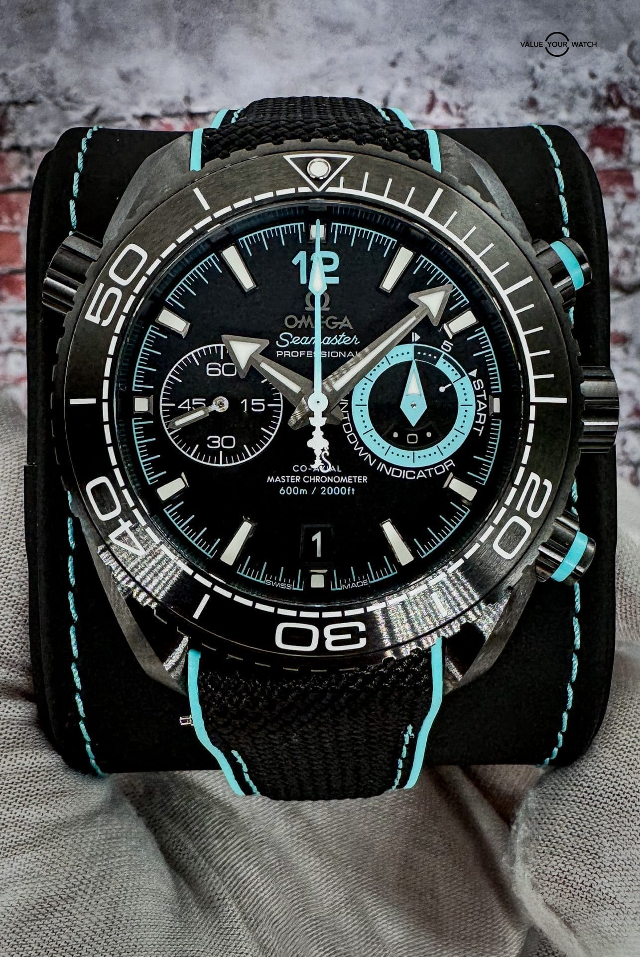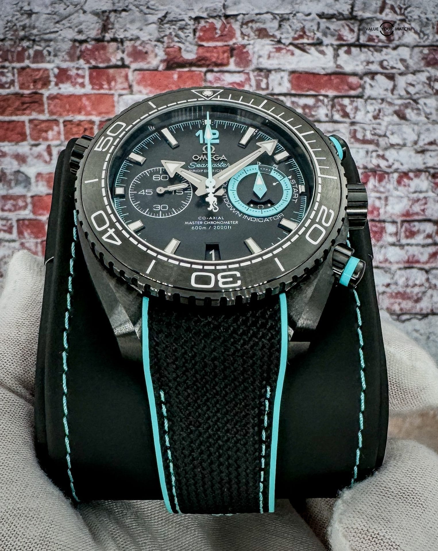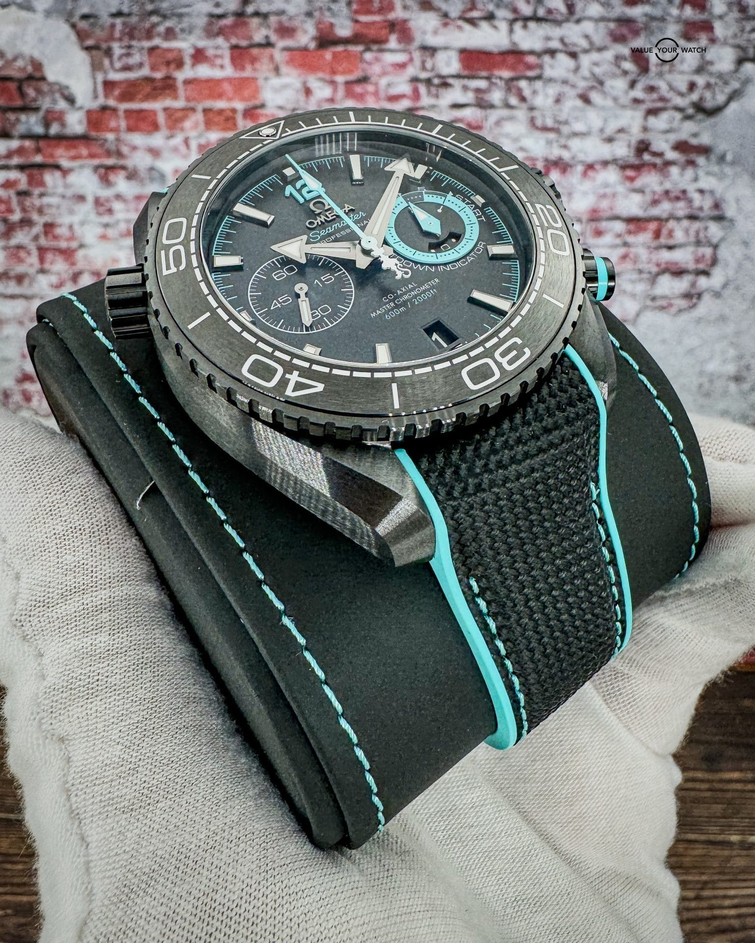 Offered by NoVA Watch Supply of Fairfax, VA: An excellent condition Omega Seamaster Planet Ocean 600M Black Ceramic ETNZ Deep Black edition watch REF. 215.92.46.51.01.003. Whether you’re a fan of the Kiwi Crew of ETNZ, or simply obsessed with Tiffany colorway watches, this variation of the planet ocean is proving to be one of most sought after special edition Omegas in some time and is now SOLD OUT at Omega. The story behind this 45.5 mm work of art is that its a tribute piece to the defenders of the 37th America’s Cup blending the deepest black with the turquoise of the Emirates Team New Zealand logo. Complementing the black ceramic case is a unidirectional bezel in brushed black ceramic with white enamel diving scale and triangle-framed dot at 12, which includes white Super-LumiNova to emit a green glow in the dark. On the matt ceramic dial, OMEGA has included a nod to pre-race protocol with a COUNTDOWN INDICATOR at 3 o’clock complete with flagged START. The indicator’s hand and subdial ring are in ETNZ logo turquoise, along with the minute track, number 12 and central seconds chronograph hand with America’s Cup trophy counterwatch_case_weight. OMEGA has also included the colour on the rings of the brushed black ceramic pushers, the HE on the helium escape valve and the OMEGA logo on the crown. As a salute to the kiwi crew, the NAIAD LOCK caseback has an Emirates Team New Zealand logo with turquoise fern and white lettering. A black and turquoise structured rubber strap with turquoise stitching and black ceramic clasp fixes the race-ready watch to the wrist, while OMEGA’s Master Chronometer Calibre 9900 provides the power. In addition to all of this, the tribute to the kiwi crew incudes a special presentation box in Emirates Team New Zealand colours as well as the following: