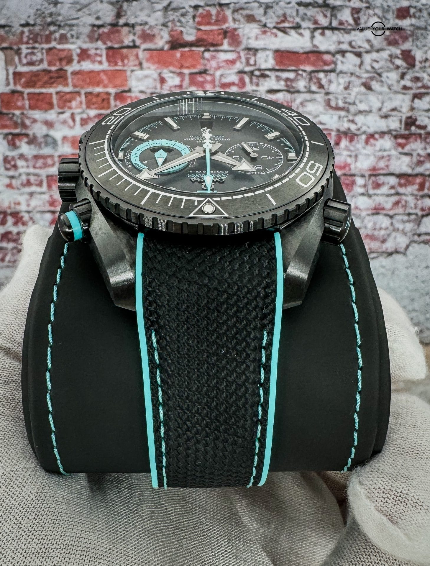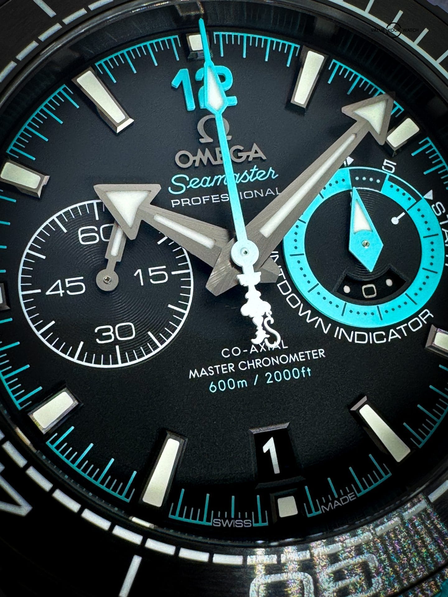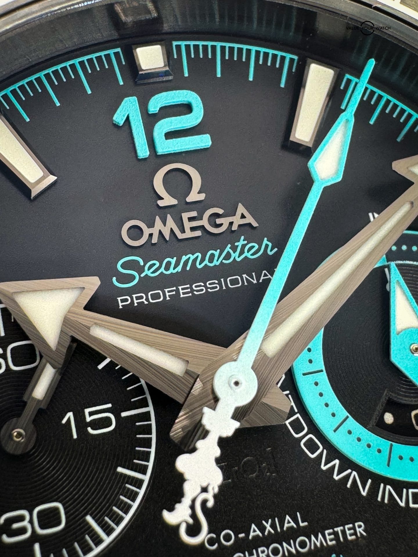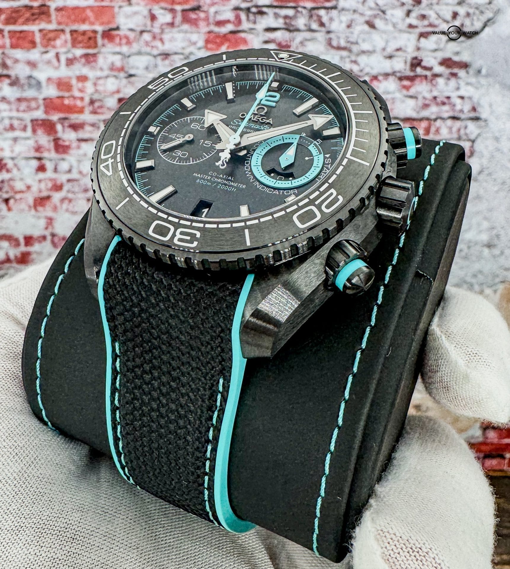 Offered by NoVA Watch Supply of Fairfax, VA: An excellent condition Omega Seamaster Planet Ocean 600M Black Ceramic ETNZ Deep Black edition watch REF. 215.92.46.51.01.003. Whether you’re a fan of the Kiwi Crew of ETNZ, or simply obsessed with Tiffany colorway watches, this variation of the planet ocean is proving to be one of most sought after special edition Omegas in some time and is now SOLD OUT at Omega. The story behind this 45.5 mm work of art is that its a tribute piece to the defenders of the 37th America’s Cup blending the deepest black with the turquoise of the Emirates Team New Zealand logo. Complementing the black ceramic case is a unidirectional bezel in brushed black ceramic with white enamel diving scale and triangle-framed dot at 12, which includes white Super-LumiNova to emit a green glow in the dark. On the matt ceramic dial, OMEGA has included a nod to pre-race protocol with a COUNTDOWN INDICATOR at 3 o’clock complete with flagged START. The indicator’s hand and subdial ring are in ETNZ logo turquoise, along with the minute track, number 12 and central seconds chronograph hand with America’s Cup trophy counterwatch_case_weight. OMEGA has also included the colour on the rings of the brushed black ceramic pushers, the HE on the helium escape valve and the OMEGA logo on the crown. As a salute to the kiwi crew, the NAIAD LOCK caseback has an Emirates Team New Zealand logo with turquoise fern and white lettering. A black and turquoise structured rubber strap with turquoise stitching and black ceramic clasp fixes the race-ready watch to the wrist, while OMEGA’s Master Chronometer Calibre 9900 provides the power. In addition to all of this, the tribute to the kiwi crew incudes a special presentation box in Emirates Team New Zealand colours as well as the following: